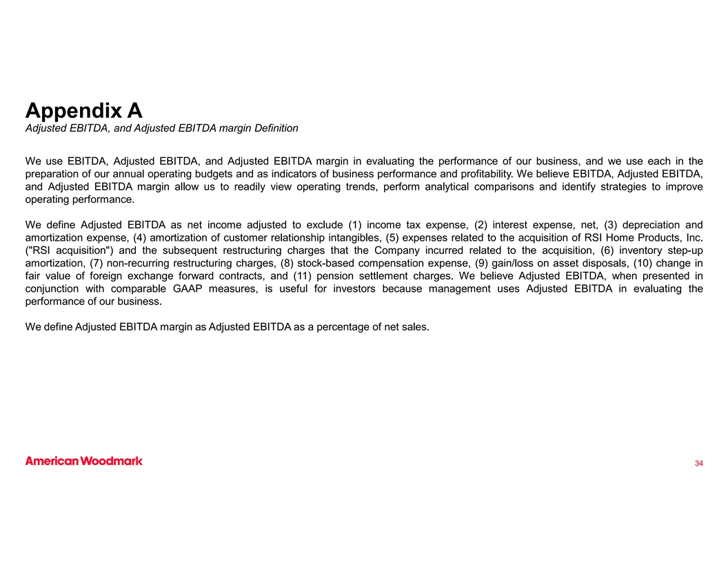 Appendix A Adjusted EBITDA, and Adjusted EBITDA margin Definition We use EBITDA, Adjusted EBITDA, and Adjusted EBITDA margin in evaluating the performance of our business, and we use each in the preparation of our annual operating budgets and as indicators of business performance and profitability. We believe EBITDA, Adjusted EBITDA, and Adjusted EBITDA margin allow us to readily view operating trends, perform analytical comparisons and identify strategies to improve operating performance. We define Adjusted EBITDA as net income adjusted to exclude (1) income tax expense, (2) interest expense, net, (3) depreciation and amortization expense, (4) amortization of customer relationship intangibles, (5) expenses related to the acquisition of RSI Home Products, Inc. ( RSI acquisition ) and the subsequent restructuring charges that the Company incurred related to the acquisition, (6) inventory step-up amortization, (7) non-recurring restructuring charges, (8) stock-based compensation expense, (9) gain/loss on asset disposals, (10) change in fair value of foreign exchange forward contracts, and (11) pension settlement charges. We believe Adjusted EBITDA, when presented in conjunction with comparable GAAP measures, is useful for investors because management uses Adjusted EBITDA in evaluating the performance of our business. We define Adjusted EBITDA margin as Adjusted EBITDA as a percentage of net sales. 34