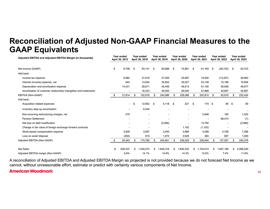 Reconciliation of Adjusted Non-GAAP Financial Measures to the GAAP Equivalents Year ended Y ear ended Y ear ended Y ear ended Y ear ended Y e ar ended Y e ar ended Adjusted EBITDA and Adjusted EBITDA Margin (in thousands) April 30, 2013 April 30, 2018 April 30, 2019 April 30, 2020 April 30, 2021 April 30, 2022 April 30, 2023 Net income (GAAP) $ 9,758 $ 63,141 $ 83,688 $ 74,861 $ 61,193 $ (29,722) $ 93,723 Add back: Income tax expense 6,982 31,619 27,200 25,687 19,500 (13,257) 28,963 Interest (income) expense, net 643 13,054 35,652 29,027 23,128 10,189 15,994 Depreciation and amortization expense 14,431 28,671 45,446 49,513 51,100 50,939 48,077 Amortization of customer relationship intangibles and trademarks - 16,333 49,000 49,000 47,889 45,667 45,667 EBITDA (Non-GAAP) $ 31,814 $ 152,818 $ 240,986 $ 228,088 $ 202,810 $ 63,816 $ 232,424 Add back: Acquisition related expenses - $ 12,902 $ 4,118 $ 221 $ 174 $ 80 $ 80 Inventory step-up amortization - 6,334 - - - - - Non-recurring restructuring charges, net 270 - - - 5,848 183 1,525 Pension Settlement - - - - - 68,473 (7) Net loss on debt modification - - (5,266) - 13,792 - (2,089) Change in fair value of foreign exchange forward contracts - - - 1,102 (1,102) - - Stock-based compensation expense 3,509 3,097 3,040 3,989 4,598 4,708 7,396 Loss on asset disposal (250) 615 1,973 2,629 384 697 1,050 Adjusted EBITDA (Non-GAAP) $ 35,343 $ 175,766 $ 244,851 $ 236,029 $ 226,504 $ 137,957 $ 240,379 Net Sales $ 630,437 $ 1,250,274 $ 1,645,319 $ 1,650,333 $ 1,744,014 $ 1,857,186 $ 2,066,200 Adjusted EBITDA margin (Non-GAAP) 5.6% 14.1% 14.9% 14.3% 13.0% 7.4% 11.6% A reconciliation of Adjusted EBITDA and Adjusted EBITDA Margin as projected is not provided because we do not forecast Net Income as we cannot, without unreasonable effort, estimate or predict with certainty various components of Net Income. 35