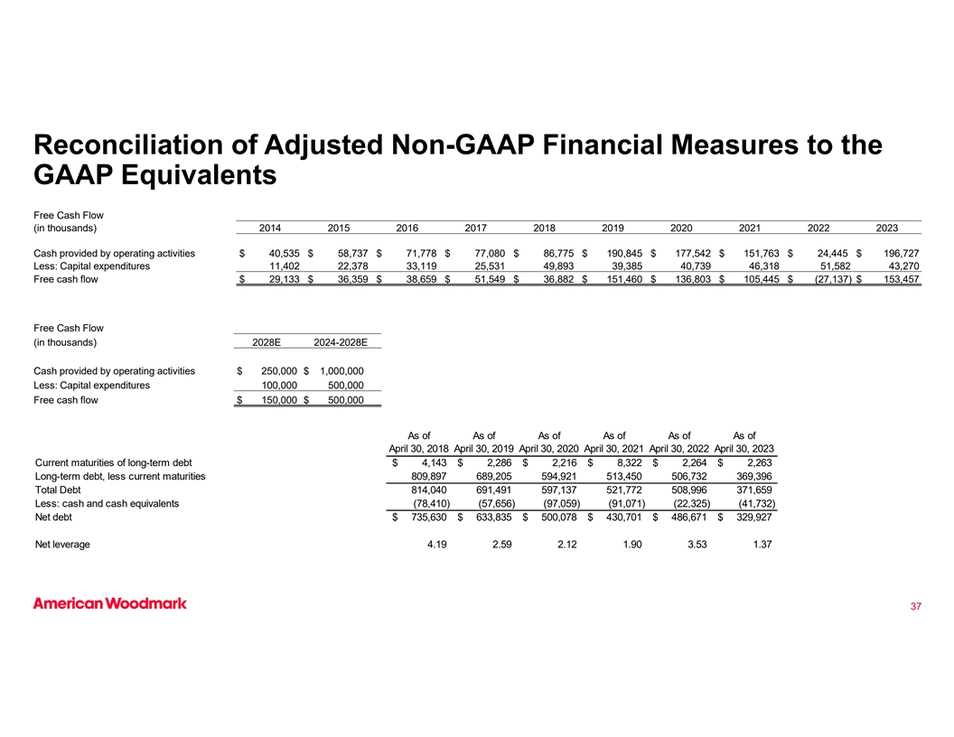 Reconciliation of Adjusted Non-GAAP Financial Measures to the GAAP Equivalents Free Cash Flow (in thousands) 2014 2015 2016 2017 2018 2019 2020 2021 2022 2023 Cash provided by operating activities $ 40,535 $ 58,737 $ 71,778 $ 77,080 $ 86,775 $ 190,845 $ 177,542 $ 151,763 $ 24,445 $ 196,727 Less: Capital expenditures 11,402 22,378 33,119 25,531 49,893 39,385 40,739 46,318 51,582 43,270 Free cash flow $ 29,133 $ 36,359 $ 38,659 $ 51,549 $ 36,882 $ 151,460 $ 136,803 $ 105,445 $ (27,137) $ 153,457 Free Cash Flow (in thousands) 2028E 2024-2028E Cash provided by operating activities $ 250,000 $ 1,000,000 Less: Capital expenditures 100,000 500,000 Free cash flow $ 150,000 $ 500,000 As of As of As of As of As of As of April 30, 2018 April 30, 2019 April 30, 2020 April 30, 2021 April 30, 2022 April 30, 2023 Current maturities of long-term debt $ 4,143 $ 2 ,286 $ 2,216 $ 8,322 $ 2,264 $ 2,263 Long-term debt, less current maturities 809,897 6 89,205 594,921 513,450 506,732 3 69,396 Total Debt 814,040 6 91,491 597,137 521,772 508,996 3 71,659 Less: cash and cash equivalents (78,410) (57,656) (97,059) (91,071) (22,325) ( 41,732) Net debt $ 735,630 $ 6 33,835 $ 500,078 $ 430,701 $ 486,671 $ 3 29,927 Net leverage 4.19 2 .59 2.12 1.90 3.53 1.37 37