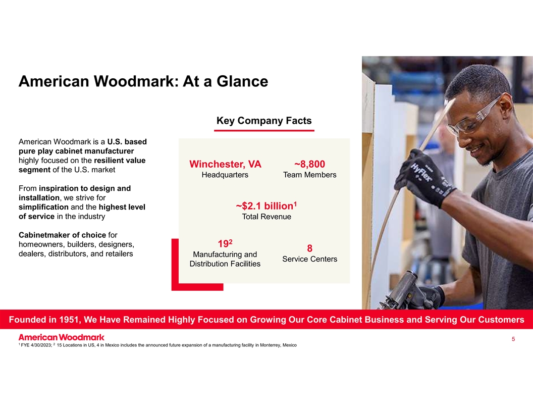 American Woodmark: At a Glance Key Company Facts American Woodmark is a U.S. based pure play cabinet manufacturer highly focused on the resilient value Winchester, VA ~8,800 segment of the U.S. market Headquarters Team Members From inspiration to design and installation, we strive for 1 ~$2.1 billion simplification and the highest level of service in the industry Total Revenue Cabinetmaker of choice for 2 homeowners, builders, designers, 19 8 dealers, distributors, and retailers Manufacturing and Service Centers Distribution Facilities Founded in 1951, We Have Remained Highly Focused on Growing Our Core Cabinet Business and Serving Our Customers 5 1 2 FYE 4/30/2023; 15 Locations in US, 4 in Mexico includes the announced future expansion of a manufacturing facility in Monterrey, Mexico