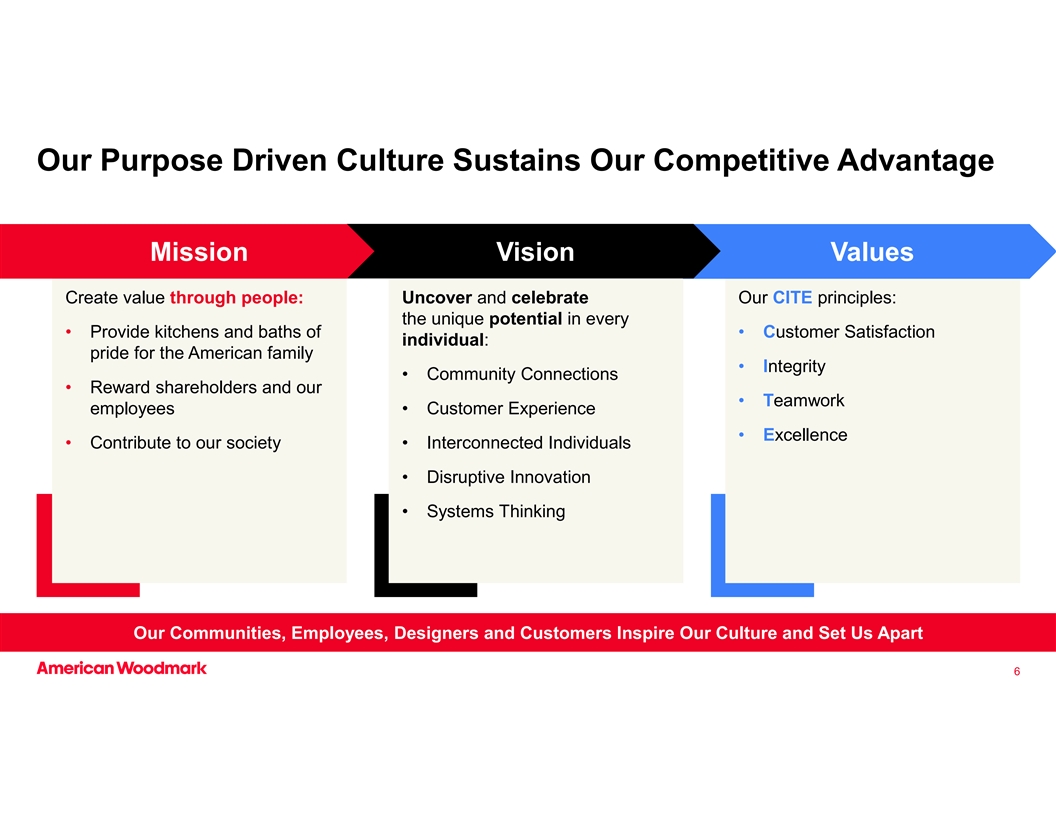 Our Purpose Driven Culture Sustains Our Competitive Advantage Mission Vision Values Create value through people: Uncover and celebrate Our CITE principles: the unique potential in every • Provide kitchens and baths of • Customer Satisfaction individual: pride for the American family • Integrity • Community Connections • Reward shareholders and our • Teamwork employees • Customer Experience • Excellence • Contribute to our society • Interconnected Individuals • Disruptive Innovation • Systems Thinking Our Communities, Employees, Designers and Customers Inspire Our Culture and Set Us Apart 6