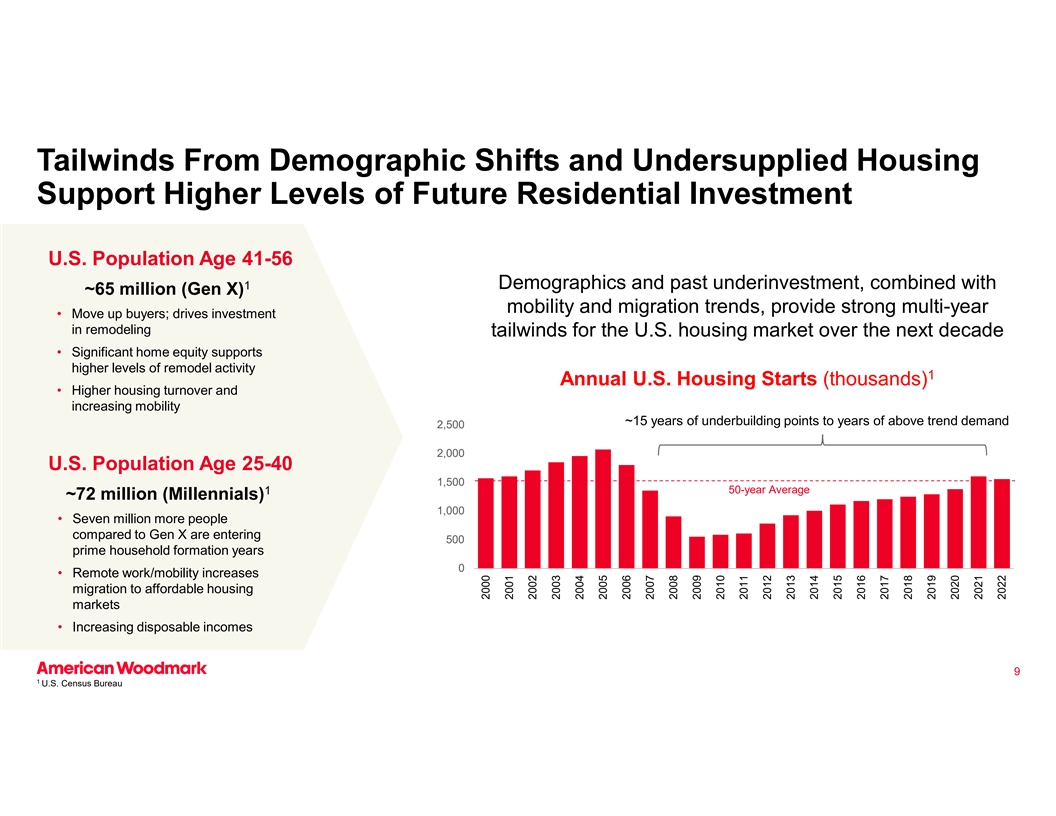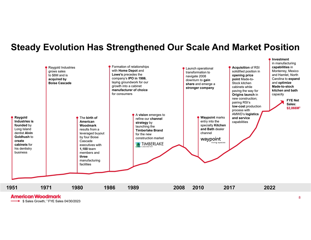 Steady Evolution Has Strengthened Our Scale And Market Position Investment in manufacturing Formation of relationships capabilities in Raygold Industries Acquisition of RSI Launch operational with Home Depot and Monterrey, Mexico grows sales solidified position in transformation to Lowe’s precedes the and Hamlet, North to $6M and is opening price navigate 2008 company’s IPO in 1986, Carolina to expand acquired by point Made-to- downturn to gain laying groundwork for our and optimize Boise Cascade Stock kitchen share and emerge a growth into a cabinet Made-to-stock cabinets while stronger company manufacturer of choice paving the way for kitchen and bath for consumers capacity Origins launch in new construction; FYE Net pairing RSI’s Sales: low-cost production 1 $2,066M process with AMWD’s logistics A vision emerges to Raygold The birth of Waypoint marks and service refine our channel Industries is entry into the American capabilities strategy by founded by specialty Kitchen Woodmark launching the Long Island and Bath dealer results from a Timberlake Brand dentist Alvin channel leveraged buyout for the new Goldhush to by four Boise construction market create Cascade cabinets for executives with his dentistry 1,100 team business members and three manufacturing facilities 1951 1971 1980 1986 1989 2008 2010 2017 2022 8 1 $ Sales Growth; FYE Sales 04/30/2023