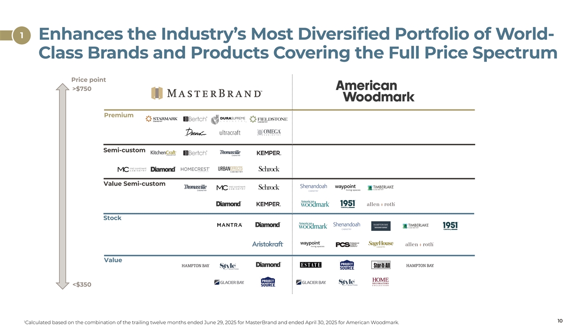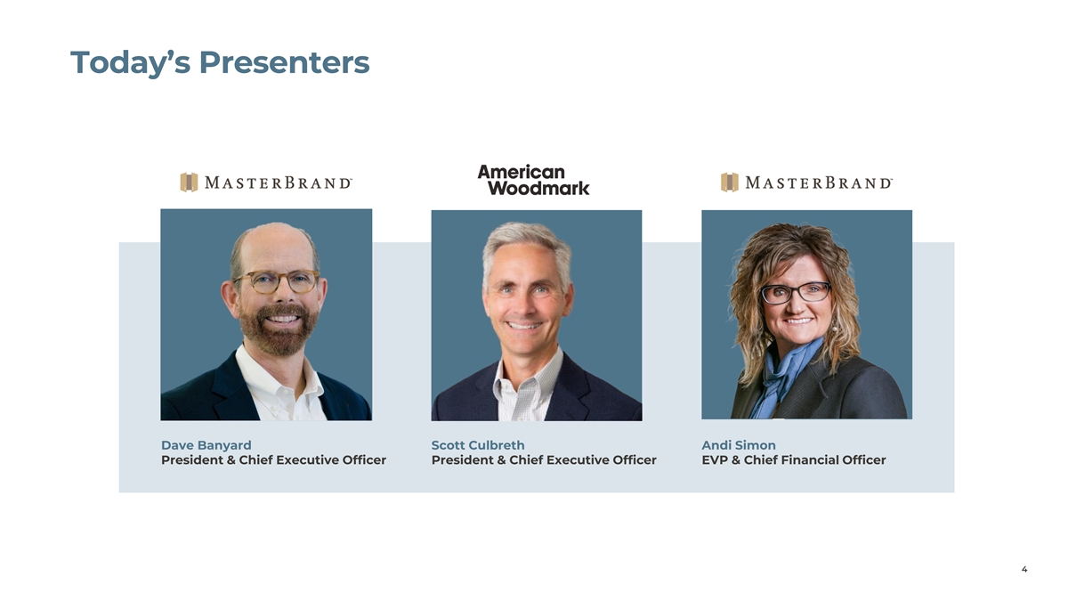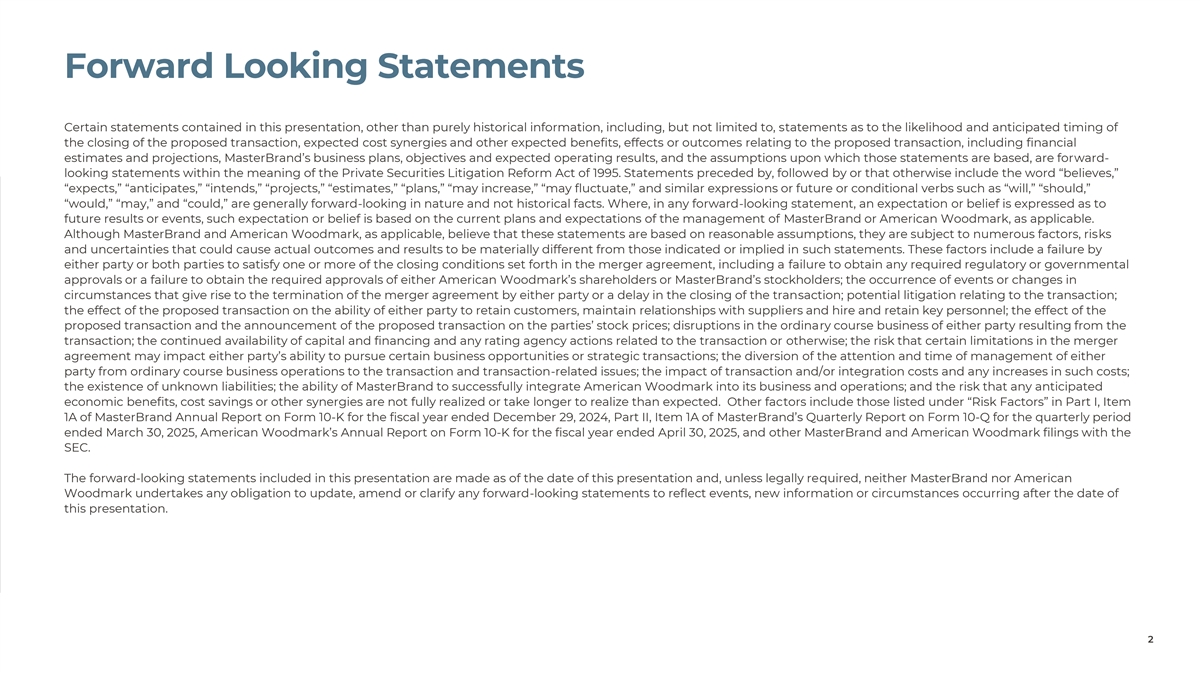 Additional Information and Where to Find It MasterBrand intends to file with the U.S. Securities and Exchange Commission (“SEC”) a registration statement on Form S-4 (the “Registration Statement”), which will include a joint proxy statement of MasterBrand and American Woodmark that will also constitute a prospectus of MasterBrand. Each of MasterBrand and American Woodmark may also file other relevant documents with the SEC regarding the transaction. This presentation is not a substitute for the joint proxy statement/prospectus or Registration Statement or any other document that MasterBrand or American Woodmark may file with the SEC. Any definitive joint proxy statement/prospectus (if and when available) will be mailed to shareholders of MasterBrand and American Woodmark. INVESTORS AND SHAREHOLDERS OF MASTERBRAND AND AMERICAN WOODMARK ARE URGED TO READ THE REGISTRATION STATEMENT, JOINT PROXY STATEMENT/PROSPECTUS AND ANY OTHER DOCUMENTS FILED OR TO BE FILED WITH THE SEC IN CONNECTION WITH THE TRANSACTION, AS WELL AS ANY AMENDMENTS OR SUPPLEMENTS TO THESE DOCUMENTS, CAREFULLY AND IN THEIR ENTIRETY IF AND WHEN THEY BECOME AVAILABLE, AS THEY CONTAIN OR WILL CONTAIN IMPORTANT INFORMATION ABOUT MASTERBRAND, AMERICAN WOODMARK, THE TRANSACTION AND RELATED MATTERS. The Registration Statement and joint proxy statement/prospectus and other documents filed by MasterBrand or American Woodmark with the SEC, when filed, will be available free of charge at the SEC’s website at www.sec.gov. Alternatively, investors and shareholders may obtain free copies of documents that are filed or will be filed with the SEC by MasterBrand, including the Registration Statement and the joint proxy statement/prospectus, on Masterbrand’s website at https://masterbrand.com/investors/financials/sec-filings/default.aspx, and may obtain free copies of documents that are filed or will be filed with the SEC by American Woodmark, including the joint proxy statement/prospectus, on American Woodmark’s website at https://americanwoodmark.com/investors/financial-reporting#secfilings. The information included on, or accessible through, MasterBrand’s or American Woodmark’s website is not incorporated by reference into this presentation. No Offer or Solicitation This presentation is not intended to be and shall not constitute an offer to sell or the solicitation of an offer to buy any securities or a solicitation of any vote or approval, nor shall there be any sale of securities in any jurisdiction in which such offer, solicitation or sale would be unlawful prior to appropriate registration or qualification under the securities laws of such jurisdiction. No offer of securities shall be made except by means of a prospectus meeting the requirements of Section 10 of the Securities Act of 1933, as amended. Participants in the Solicitation MasterBrand, American Woodmark and certain of their respective directors and executive officers may be deemed to be participants in the solicitation of proxies in respect of the transaction. Information about the directors and executive officers of MasterBrand is set forth in MasterBrand’s proxy statement for its 2025 annual meeting of shareholders, which was filed with the SEC on April 24, 2025, including under the headings “Proposal No. 1 Election of Directors—Our Director Nominees,” “Non-Employee Director Compensation,” “Executive Officers,” “Compensation Discussion and Analysis,” “Stock Ownership Information” and “Equity Compensation Plan Information.” Additional information regarding ownership of MasterBrand securities by its directors and executive officers is included in each person’s beneficial ownership reports on Forms 3, 4 and 5, as filed with the SEC. Information about the directors and executive officers of American Woodmark is set forth in its proxy statement for its 2025 annual meeting of shareholders, which was filed with the SEC on June 25, 2025, including under the headings “Item 1 – Election of Directors—Information Regarding Nominees,” “Executive Compensation,” “Non-Management Directors’ Compensation,” and “Security Ownership,” and in its Annual Report on Form 10-K for the fiscal year ended April 30, 2025, which was filed with the SEC on June 25, 2025, including under the heading “Executive Officers of the Registrant.” Additional information regarding ownership of American Woodmark securities by its directors and executive officers is included in each person’s beneficial ownership reports on Forms 3, 4 and 5, as filed with the SEC. Other information regarding the participants in the proxy solicitations and a description of their direct and indirect interests, by security holdings or otherwise, will be contained in the definitive joint proxy statement/prospectus included in the Registration Statement, and other relevant materials to be filed with the SEC regarding the transaction when such materials become available. Investors should read the Registration Statement and the joint proxy statement/prospectus carefully if and when these become available before making any voting or investment decisions. You may obtain 3 free copies of these documents from MasterBrand or American Woodmark using the sources indicated above.