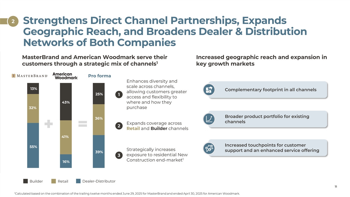 1 Enhances the Industry’s Most Diversified Portfolio of World- Class Brands and Products Covering the Full Price Spectrum Price point >$750 Premium Semi-custom Value Semi-custom Stock Value <$350 10 1 Calculated based on the combination of the trailing twelve months ended June 29, 2025 for MasterBrand and ended April 30, 2025 for American Woodmark.