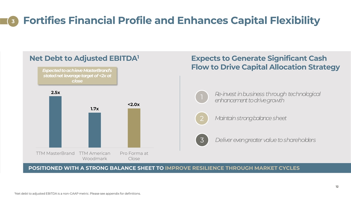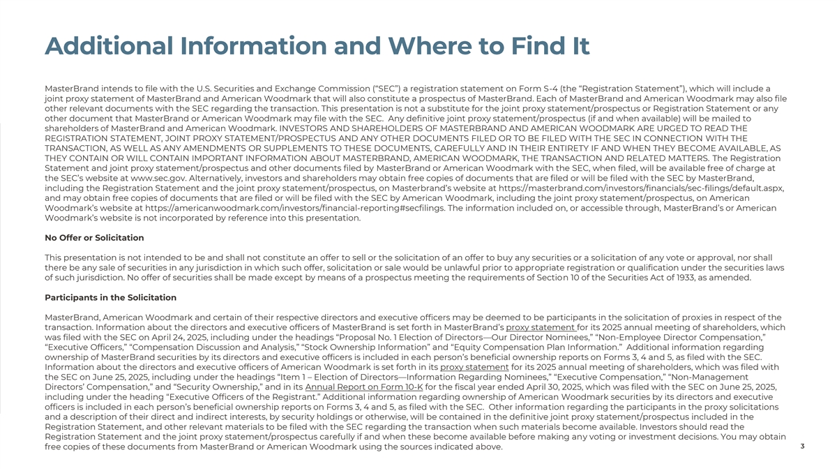 Forward Looking Statements Certain statements contained in this presentation, other than purely historical information, including, but not limited to, statements as to the likelihood and anticipated timing of the closing of the proposed transaction, expected cost synergies and other expected benefits, effects or outcomes relating to the proposed transaction, including financial estimates and projections, MasterBrand’s business plans, objectives and expected operating results, and the assumptions upon which those statements are based, are forward- looking statements within the meaning of the Private Securities Litigation Reform Act of 1995. Statements preceded by, followed by or that otherwise include the word “believes,” “expects,” “anticipates,” “intends,” “projects,” “estimates,” “plans,” “may increase,” “may fluctuate,” and similar expressions or future or conditional verbs such as “will,” “should,” “would,” “may,” and “could,” are generally forward-looking in nature and not historical facts. Where, in any forward-looking statement, an expectation or belief is expressed as to future results or events, such expectation or belief is based on the current plans and expectations of the management of MasterBrand or American Woodmark, as applicable. Although MasterBrand and American Woodmark, as applicable, believe that these statements are based on reasonable assumptions, they are subject to numerous factors, risks and uncertainties that could cause actual outcomes and results to be materially different from those indicated or implied in such statements. These factors include a failure by either party or both parties to satisfy one or more of the closing conditions set forth in the merger agreement, including a failure to obtain any required regulatory or governmental approvals or a failure to obtain the required approvals of either American Woodmark’s shareholders or MasterBrand’s stockholders; the occurrence of events or changes in circumstances that give rise to the termination of the merger agreement by either party or a delay in the closing of the transaction; potential litigation relating to the transaction; the effect of the proposed transaction on the ability of either party to retain customers, maintain relationships with suppliers and hire and retain key personnel; the effect of the proposed transaction and the announcement of the proposed transaction on the parties’ stock prices; disruptions in the ordinary course business of either party resulting from the transaction; the continued availability of capital and financing and any rating agency actions related to the transaction or otherwise; the risk that certain limitations in the merger agreement may impact either party’s ability to pursue certain business opportunities or strategic transactions; the diversion of the attention and time of management of either party from ordinary course business operations to the transaction and transaction-related issues; the impact of transaction and/or integration costs and any increases in such costs; the existence of unknown liabilities; the ability of MasterBrand to successfully integrate American Woodmark into its business and operations; and the risk that any anticipated economic benefits, cost savings or other synergies are not fully realized or take longer to realize than expected. Other factors include those listed under “Risk Factors” in Part I, Item 1A of MasterBrand Annual Report on Form 10-K for the fiscal year ended December 29, 2024, Part II, Item 1A of MasterBrand’s Quarterly Report on Form 10-Q for the quarterly period ended March 30, 2025, American Woodmark’s Annual Report on Form 10-K for the fiscal year ended April 30, 2025, and other MasterBrand and American Woodmark filings with the SEC. The forward-looking statements included in this presentation are made as of the date of this presentation and, unless legally required, neither MasterBrand nor American Woodmark undertakes any obligation to update, amend or clarify any forward-looking statements to reflect events, new information or circumstances occurring after the date of this presentation. 2