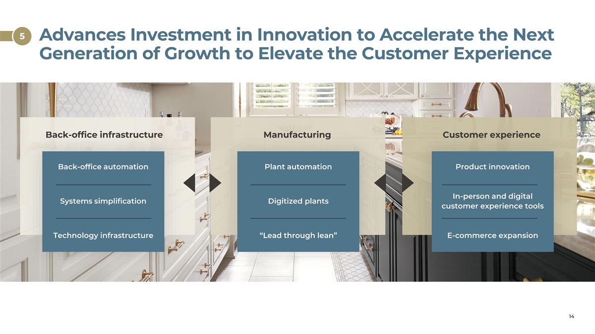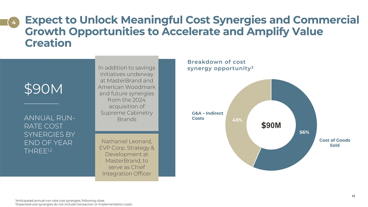 Expect to Unlock Meaningful Cost Synergies and Commercial 4 Growth Opportunities to Accelerate and Amplify Value Creation Breakdown of cost 2 In addition to savings synergy opportunity initiatives underway at MasterBrand and American Woodmark $90M and future synergies from the 2024 __________ acquisition of Supreme Cabinetry G&A – Indirect Costs ANNUAL RUN- Brands 43% $90M RATE COST 56% SYNERGIES BY Cost of Goods Nathaniel Leonard, END OF YEAR Sold EVP Corp. Strategy & 1,2 THREE Development at MasterBrand, to serve as Chief Integration Officer 13 1 Anticipated annual run-rate cost synergies, following close. 2 Expected cost synergies do not include transaction or implementation costs.