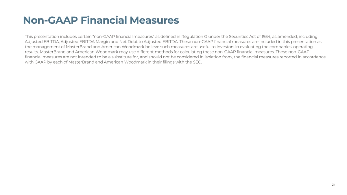 Non-GAAP Financial Measures This presentation includes certain “non-GAAP financial measures” as defined in Regulation G under the Securities Act of 1934, as amended, including Adjusted EBITDA, Adjusted EBITDA Margin and Net Debt to Adjusted EBITDA. These non-GAAP financial measures are included in this presentation as the management of MasterBrand and American Woodmark believe such measures are useful to investors in evaluating the companies’ operating results. MasterBrand and American Woodmark may use different methods for calculating these non-GAAP financial measures. These non-GAAP financial measures are not intended to be a substitute for, and should not be considered in isolation from, the financial measures reported in accordance with GAAP by each of MasterBrand and American Woodmark in their filings with the SEC. 21
