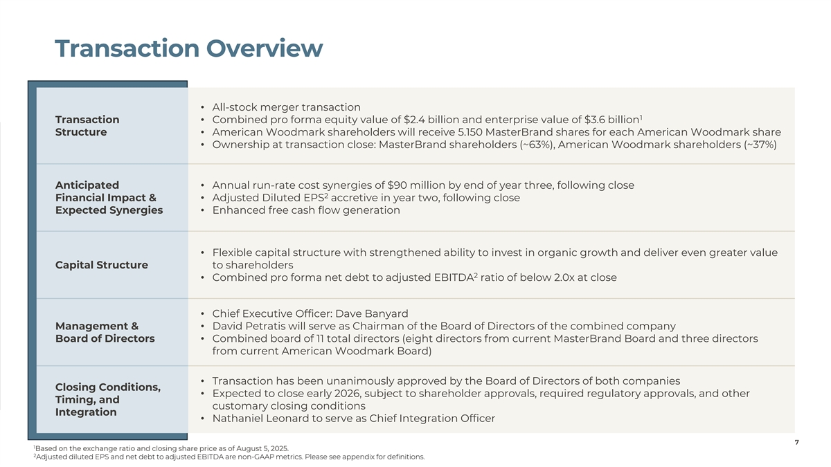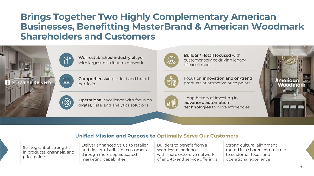 Transaction Overview • All-stock merger transaction 1 Transaction • Combined pro forma equity value of $2.4 billion and enterprise value of $3.6 billion Structure• American Woodmark shareholders will receive 5.150 MasterBrand shares for each American Woodmark share • Ownership at transaction close: MasterBrand shareholders (~63%), American Woodmark shareholders (~37%) Anticipated • Annual run-rate cost synergies of $90 million by end of year three, following close 2 Financial Impact & • Adjusted Diluted EPS accretive in year two, following close Expected Synergies• Enhanced free cash flow generation • Flexible capital structure with strengthened ability to invest in organic growth and deliver even greater value Capital Structure to shareholders 2 • Combined pro forma net debt to adjusted EBITDA ratio of below 2.0x at close • Chief Executive Officer: Dave Banyard Management & • David Petratis will serve as Chairman of the Board of Directors of the combined company Board of Directors• Combined board of 11 total directors (eight directors from current MasterBrand Board and three directors from current American Woodmark Board) • Transaction has been unanimously approved by the Board of Directors of both companies Closing Conditions, • Expected to close early 2026, subject to shareholder approvals, required regulatory approvals, and other Timing, and customary closing conditions Integration • Nathaniel Leonard to serve as Chief Integration Officer 7 1 Based on the exchange ratio and closing share price as of August 5, 2025. 2 Adjusted diluted EPS and net debt to adjusted EBITDA are non-GAAP metrics. Please see appendix for definitions.
