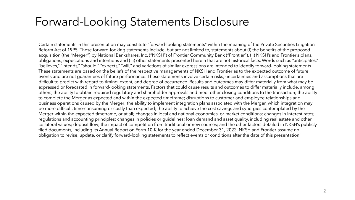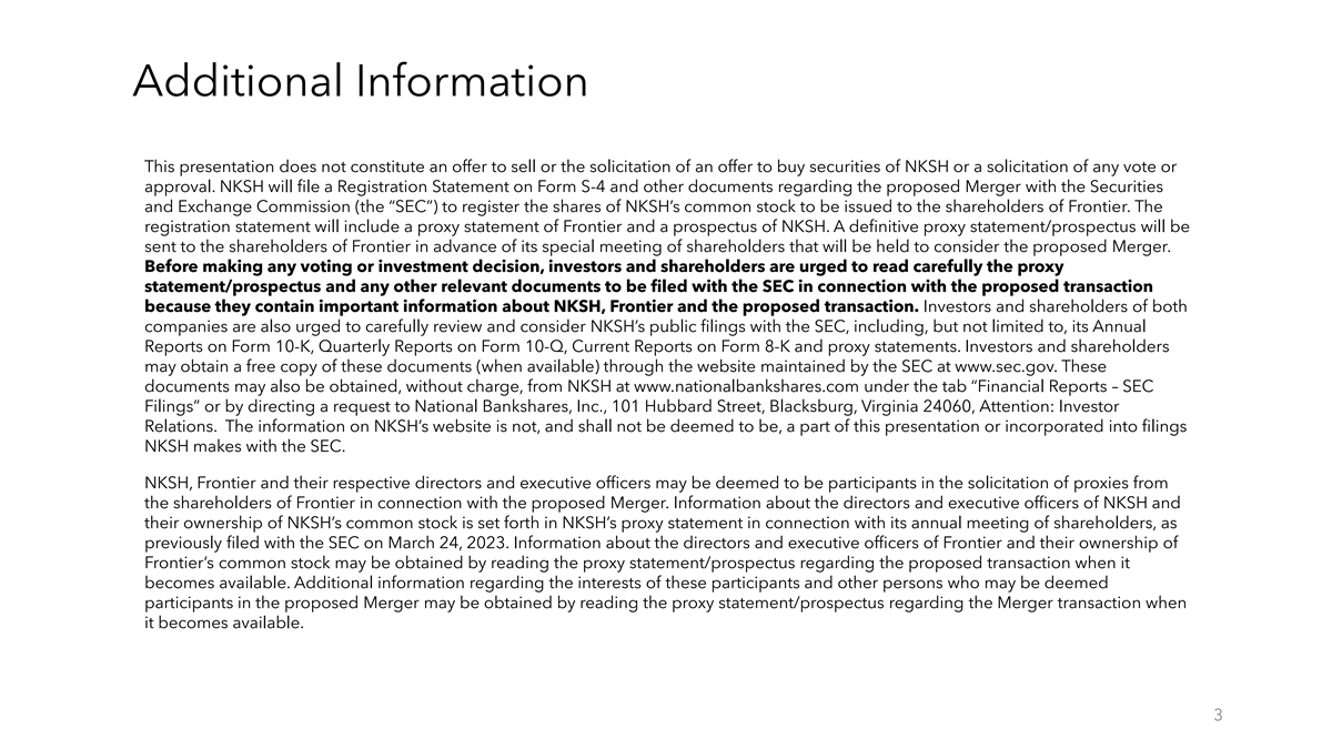Forward-Looking Statements Disclosure Certain statements in this presentation may constitute “forward-looking statements” within the meaning of the Private Securities Litigation Reform Act of 1995. These forward-looking statements include, but are not limited to, statements about (i) the benefits of the proposed acquisition (the “Merger”) by National Bankshares, Inc. (“NKSH”) of Frontier Community Bank (“Frontier”), (ii) NKSH’s and Frontier’s plans, obligations, expectations and intentions and (iii) other statements presented herein that are not historical facts. Words such as “anticipates,” “believes,” “intends,” “should,” “expects,” “will,” and variations of similar expressions are intended to identify forward-looking statements. These statements are based on the beliefs of the respective managements of NKSH and Frontier as to the expected outcome of future events and are not guarantees of future performance. These statements involve certain risks, uncertainties and assumptions that are difficult to predict with regard to timing, extent, and degree of occurrence. Results and outcomes may differ materially from what may be expressed or forecasted in forward-looking statements. Factors that could cause results and outcomes to differ materially include, among others, the ability to obtain required regulatory and shareholder approvals and meet other closing conditions to the transaction; the ability to complete the Merger as expected and within the expected timeframe; disruptions to customer and employee relationships and business operations caused by the Merger; the ability to implement integration plans associated with the Merger, which integration may be more difficult, time-consuming or costly than expected; the ability to achieve the cost savings and synergies contemplated by the Merger within the expected timeframe, or at all; changes in local and national economies, or market conditions; changes in interest rates; regulations and accounting principles; changes in policies or guidelines; loan demand and asset quality, including real estate and other collateral values; deposit flow; the impact of competition from traditional or new sources; and the other factors detailed in NKSH’s publicly filed documents, including its Annual Report on Form 10-K for the year ended December 31, 2022. NKSH and Frontier assume no obligation to revise, update, or clarify forward-looking statements to reflect events or conditions after the date of this presentation. 2