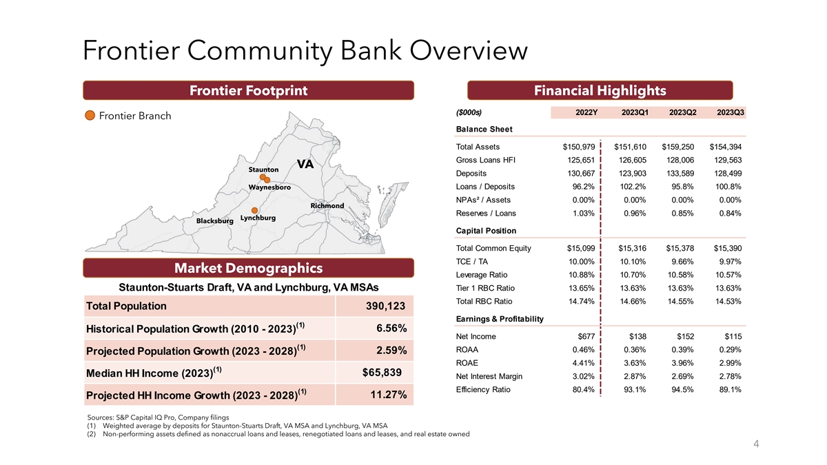 Additional Information This presentation does not constitute an offer to sell or the solicitation of an offer to buy securities of NKSH or a solicitation of any vote or approval. NKSH will file a Registration Statement on Form S-4 and other documents regarding the proposed Merger with the Securities and Exchange Commission (the “SEC”) to register the shares of NKSH’s common stock to be issued to the shareholders of Frontier. The registration statement will include a proxy statement of Frontier and a prospectus of NKSH. A definitive proxy statement/prospectus will be sent to the shareholders of Frontier in advance of its special meeting of shareholders that will be held to consider the proposed Merger. Before making any voting or investment decision, investors and shareholders are urged to read carefully the proxy statement/prospectus and any other relevant documents to be filed with the SEC in connection with the proposed transaction because they contain important information about NKSH, Frontier and the proposed transaction. Investors and shareholders of both companies are also urged to carefully review and consider NKSH’s public filings with the SEC, including, but not limited to, its Annual Reports on Form 10-K, Quarterly Reports on Form 10-Q, Current Reports on Form 8-K and proxy statements. Investors and shareholders may obtain a free copy of these documents (when available) through the website maintained by the SEC at www.sec.gov. These documents may also be obtained, without charge, from NKSH at www.nationalbankshares.com under the tab “Financial Reports – SEC Filings” or by directing a request to National Bankshares, Inc., 101 Hubbard Street, Blacksburg, Virginia 24060, Attention: Investor Relations. The information on NKSH’s website is not, and shall not be deemed to be, a part of this presentation or incorporated into filings NKSH makes with the SEC. NKSH, Frontier and their respective directors and executive officers may be deemed to be participants in the solicitation of proxies from the shareholders of Frontier in connection with the proposed Merger. Information about the directors and executive officers of NKSH and their ownership of NKSH’s common stock is set forth in NKSH’s proxy statement in connection with its annual meeting of shareholders, as previously filed with the SEC on March 24, 2023. Information about the directors and executive officers of Frontier and their ownership of Frontier’s common stock may be obtained by reading the proxy statement/prospectus regarding the proposed transaction when it becomes available. Additional information regarding the interests of these participants and other persons who may be deemed participants in the proposed Merger may be obtained by reading the proxy statement/prospectus regarding the Merger transaction when it becomes available. 3