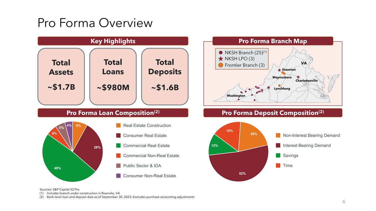 Transaction Key Assumptions and Impact Transaction Terms Expected Financial Impact • Frontier Community Bank to merge into The National (5) Including Rate Marks Excluding Rate Marks Bank of Blacksburg • Each share of Frontier common stock to be exchanged for the right to receive either 0.4250 TBV Acc. / (Dil.) ~(5.9%) TBV Acc. / (Dil.) ~0.4% shares of NKSH common stock or $14.48 in cash Structure & ’25E EPS Acc. ~20.1% ’25E EPS Acc. ~8.6% • Shareholder elections are subject to adjustment so Consideration that at least 90% of Frontier shares are exchanged for ’26E EPS Acc. ~19.4% ’26E EPS Acc. ~8.7% NKSH common stock (1) • Frontier stock options to be cashed out at $14.48 TBV Earnback 2.25 years TBV Earnback Accretive less the applicable strike price (2) • Pro forma ownership of ~93% NKSH / ~7% Frontier Key Assumptions (3),(4) • $13.83 per Frontier Share Transaction (4) Value• 35% cost savings on Frontier’s noninterest expense, 75% • $17.1 million in aggregate transaction value of cost savings achieved in 2024 • Key Frontier personnel are anticipated to be • Approximately $4.0M of pre-tax transaction costs retained in the pro forma company Personnel • Total gross credit mark of $2.0M, 50% on purchased • One member of the Frontier Board of Directors will credit deteriorated loans be invited to join the NKSH Board of Directors • $1.2M AOCI mark; $10.2M gross loan rate mark; $0.4M mark-up on fixed assets; $0.7M mark on liabilities • Customary regulatory and Frontier shareholder Approvals approvals required • $2.1M core deposit intangible & Closing • Anticipated closing in Q2 2024 (1) 47,500 outstanding Frontier common stock options with a weighted average strike price of $8.55 (2) Assumes 10% cash election (3) Consideration weighted adjusted price per Fronter share; Assumes 10% cash election (4) Based on NKSH’s January 19, 2024 closing price of $32.38 and 1,216,015 Frontier common shares outstanding 5 (5) Excludes loan and liability fair value marks