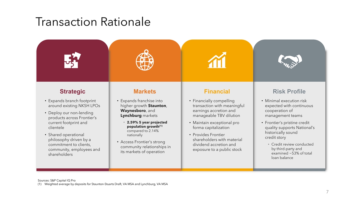 Pro Forma Overview Key Highlights Pro Forma Branch Map (1) NKSH Branch (25) NKSH LPO (3) VA Total Total Total Frontier Branch (3) Staunton Loans Deposits Assets Waynesboro Charlottesville Lynchburg ~$1.7B ~$980M ~$1.6B Washington (2) (2) Pro Forma Loan Composition Pro Forma Deposit Composition Real Estate Construction Non-Interest Bearing Demand Consumer Real Estate Interest Bearing Demand Commercial Real Estate Commercial Non-Real Estate Savings Public Sector & IDA Time Consumer Non-Real Estate Sources: S&P Capital IQ Pro (1) Includes branch under construction in Roanoke, VA (2) Bank-level loan and deposit data as of September 30, 2023; Excludes purchase accounting adjustments 6
