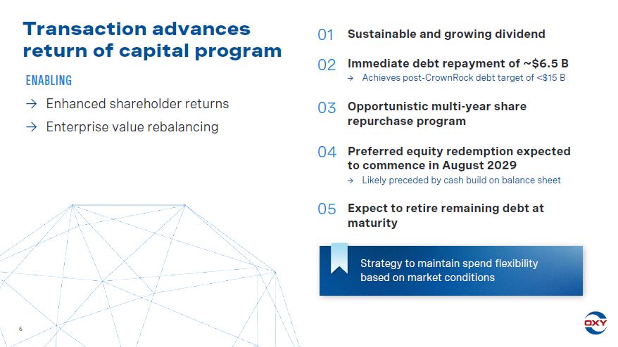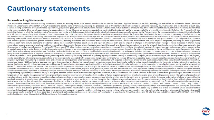 Cautionary statements  Forward-Looking Statements  This presentation contains “forward-looking statements” within the meaning of the “safe harbor” provisions of the Private Securities Litigation Reform Act of 1995, including, but not limited to, statements about Occidental Petroleum Corporation’s (“Occidental” or “Oxy”) expectations, beliefs, plans or forecasts, including the proposed sale of Occidental's chemical business to Berkshire Hathaway Inc. ("Berkshire") and the benefits of such sale. Forward-looking statements involve estimates, expectations, projections, goals, forecasts, assumptions, risks and uncertainties. Actual outcomes or results may differ from anticipated results, sometimes materially. Factors that could cause results to differ from those projected or assumed in any forward-looking statement include, but are not limited to: Occidental’s ability to consummate the proposed transaction with Berkshire (the “Transaction”); the possibility that any or all of the conditions to the Transaction may not be satisfied or waived, including the failure to obtain the regulatory approvals required for the Transaction on the terms expected or on the anticipated schedule or at all; the occurrence of any event, change or other circumstance that could give rise to the termination of the purchase agreement relating to the Transaction; the effect of the announcement or pendency of the Transaction on our ability to attract, motivate or retain key executives and employees, our ability to maintain relationships with our customers, vendors, service providers and others with whom we do business, or our operating results and business generally; risks related to the Transaction diverting management’s attention from our ongoing business operations; that the Transaction may not achieve some or all or any of the anticipated benefits or be completed in accordance with expected plans and timelines; general economic conditions, including slowdowns and recessions, domestically or internationally; Occidental’s indebtedness and other payment obligations, including the need to generate sufficient cash flows to fund operations; Occidental’s ability to successfully monetize select assets and repay or refinance debt and the impact of changes in Occidental’s credit ratings or future increases in interest rates; assumptions about energy markets; global and local commodity and commodity-futures pricing fluctuations and volatility; supply and demand considerations for, and the prices of, Occidental’s products and services; actions by the Organization of the Petroleum Exporting Countries (OPEC) and non-OPEC oil producing countries; results from operations and competitive conditions; future impairments of Occidental’s proved and unproved oil and gas properties or equity investments, or write-downs of productive assets, causing charges to earnings; unexpected changes in costs; government actions (including the effects of announced or future tariff increases and other geopolitical, trade, tariff, fiscal and regulatory uncertainties), war (including the Russia-Ukraine war and conflicts in the Middle East) and political conditions and events; inflation, its impact on markets and economic activity and related monetary policy actions by governments in response to inflation; availability of capital resources, levels of capital expenditures and contractual obligations; the regulatory approval environment, including Occidental's ability to timely obtain or maintain permits or other government approvals, including those necessary for drilling and/or development projects; Occidental's ability to successfully complete, or any material delay of, field developments, expansion projects, capital expenditures, efficiency projects, acquisitions or divestitures; risks associated with acquisitions, mergers and joint ventures, such as difficulties integrating businesses, uncertainty associated with financial projections or projected synergies, restructuring, increased costs and adverse tax consequences; uncertainties and liabilities associated with acquired and divested properties and businesses; uncertainties about the estimated quantities of oil, natural gas liquids (NGL) and natural gas reserves; lower-than-expected production from development projects or acquisitions; Occidental’s ability to realize the anticipated benefits from prior or future streamlining actions to reduce fixed costs, simplify or improve processes and improve Occidental’s competitiveness; exploration, drilling and other operational risks; disruptions to, capacity constraints in, or other limitations on the pipeline systems that deliver Occidental’s oil and natural gas and other processing and transportation considerations; volatility in the securities, capital or credit markets, including capital market disruptions and instability of financial institutions; health, safety and environmental (HSE) risks, costs and liability under existing or future federal, regional, state, provincial, tribal, local and international HSE laws, regulations and litigation (including related to climate change or remedial actions or assessments); legislative or regulatory changes, including changes relating to hydraulic fracturing or other oil and natural gas operations, retroactive royalty or production tax regimes, and deep-water and onshore drilling and permitting regulations; Occidental’s ability to recognize intended benefits from its business strategies and initiatives, such as Occidental’s low-carbon ventures businesses or announced greenhouse gas emissions reduction targets or net-zero goals; changes in government grant or loan programs; potential liability resulting from pending or future litigation, government investigations and other proceedings; disruption or interruption of production or manufacturing or facility damage due to accidents, chemical releases, labor unrest, weather, power outages, natural disasters, cyber-atta