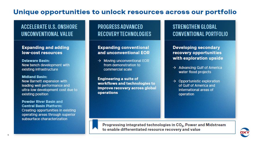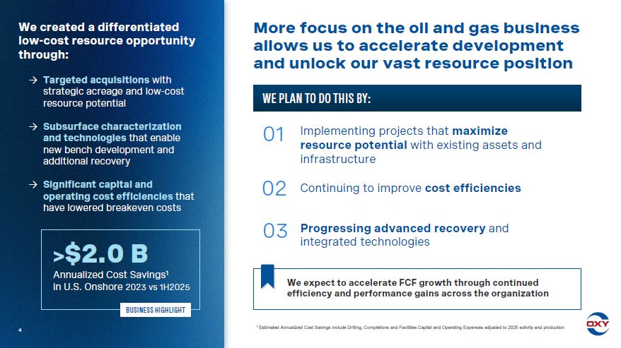More focus on the oil and gas business allows us to accelerate development and unlock our vast resource position  4  We expect to accelerate FCF growth through continued efficiency and performance gains across the organization  WE PLAN TO DO THIS BY:   Targeted acquisitions with strategic acreage and low-cost resource potential  Subsurface characterization and technologies that enable new bench development and additional recovery  Significant capital and operating cost efficiencies that have lowered breakeven costs  We created a differentiated low-cost resource opportunity through:   4  >$2.0 B Annualized Cost Savings1   in U.S. Onshore 2023 vs 1H2025  01  02  03  Implementing projects that maximize resource potential with existing assets and infrastructure   Continuing to improve cost efficiencies  Progressing advanced recovery and integrated technologies   BUSINESS HIGHLIGHT  1 Estimated Annualized Cost Savings include Drilling, Completions and Facilities Capital and Operating Expenses adjusted to 2025 activity and production