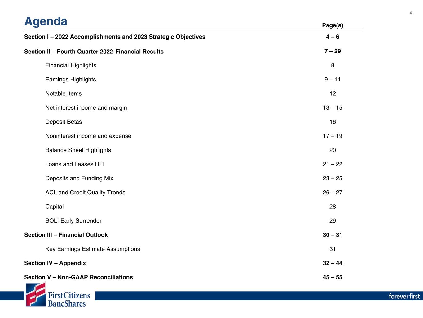 2 Agenda Page(s) Section I – 2022 Accomplishments and 2023 Strategic Objectives 4 – 6 Section II – Fourth Quarter 2022 Financial Results 7 – 29 Financial Highlights 8 Earnings Highlights 9 – 11 Notable Items 12 Net interest income and margin 13 – 15 Deposit Betas 16 Noninterest income and expense 17 – 19 Balance Sheet Highlights 20 Loans and Leases HFI 21 – 22 Deposits and Funding Mix 23 – 25 ACL and Credit Quality Trends 26 – 27 Capital 28 BOLI Early Surrender 29 Section III – Financial Outlook 30 – 31 Key Earnings Estimate Assumptions 31 Section IV – Appendix 32 – 44 Section V – Non-GAAP Reconciliations 45 – 55