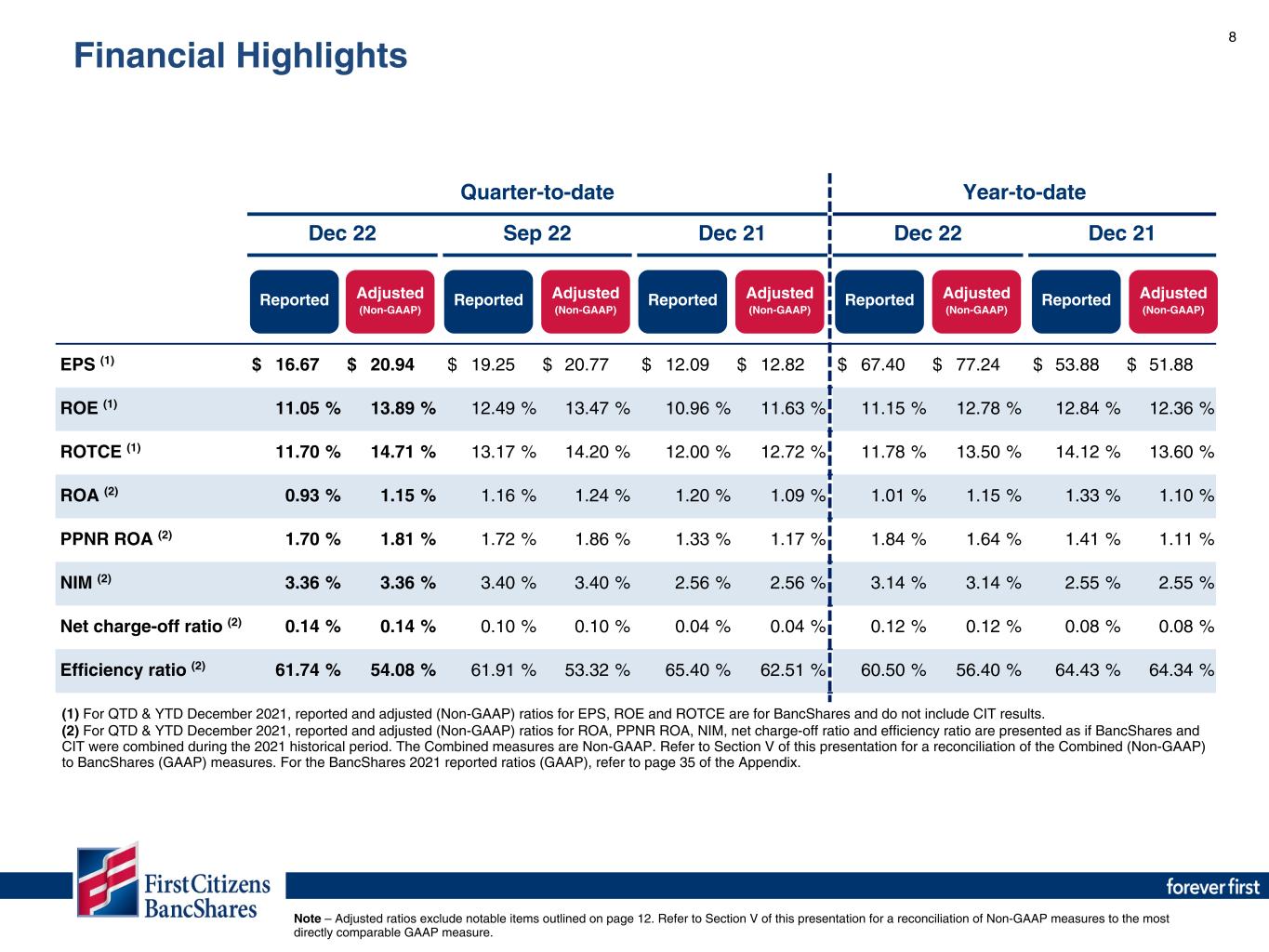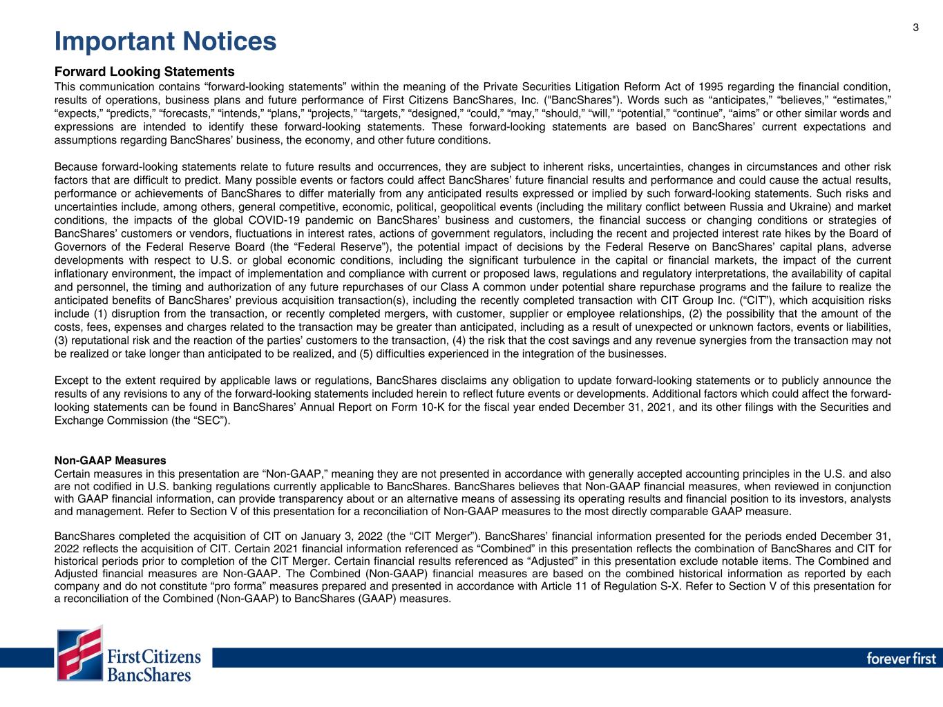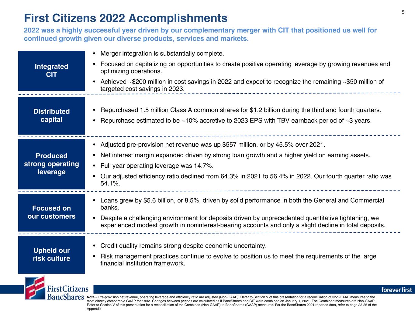 3 Important Notices Forward Looking Statements This communication contains “forward-looking statements” within the meaning of the Private Securities Litigation Reform Act of 1995 regarding the financial condition, results of operations, business plans and future performance of First Citizens BancShares, Inc. ("BancShares"). Words such as “anticipates,” “believes,” “estimates,” “expects,” “predicts,” “forecasts,” “intends,” “plans,” “projects,” “targets,” “designed,” “could,” “may,” “should,” “will,” “potential,” “continue”, “aims” or other similar words and expressions are intended to identify these forward-looking statements. These forward-looking statements are based on BancShares’ current expectations and assumptions regarding BancShares’ business, the economy, and other future conditions. Because forward-looking statements relate to future results and occurrences, they are subject to inherent risks, uncertainties, changes in circumstances and other risk factors that are difficult to predict. Many possible events or factors could affect BancShares’ future financial results and performance and could cause the actual results, performance or achievements of BancShares to differ materially from any anticipated results expressed or implied by such forward-looking statements. Such risks and uncertainties include, among others, general competitive, economic, political, geopolitical events (including the military conflict between Russia and Ukraine) and market conditions, the impacts of the global COVID-19 pandemic on BancShares’ business and customers, the financial success or changing conditions or strategies of BancShares’ customers or vendors, fluctuations in interest rates, actions of government regulators, including the recent and projected interest rate hikes by the Board of Governors of the Federal Reserve Board (the “Federal Reserve”), the potential impact of decisions by the Federal Reserve on BancShares’ capital plans, adverse developments with respect to U.S. or global economic conditions, including the significant turbulence in the capital or financial markets, the impact of the current inflationary environment, the impact of implementation and compliance with current or proposed laws, regulations and regulatory interpretations, the availability of capital and personnel, the timing and authorization of any future repurchases of our Class A common under potential share repurchase programs and the failure to realize the anticipated benefits of BancShares’ previous acquisition transaction(s), including the recently completed transaction with CIT Group Inc. (“CIT”), which acquisition risks include (1) disruption from the transaction, or recently completed mergers, with customer, supplier or employee relationships, (2) the possibility that the amount of the costs, fees, expenses and charges related to the transaction may be greater than anticipated, including as a result of unexpected or unknown factors, events or liabilities, (3) reputational risk and the reaction of the parties’ customers to the transaction, (4) the risk that the cost savings and any revenue synergies from the transaction may not be realized or take longer than anticipated to be realized, and (5) difficulties experienced in the integration of the businesses. Except to the extent required by applicable laws or regulations, BancShares disclaims any obligation to update forward-looking statements or to publicly announce the results of any revisions to any of the forward-looking statements included herein to reflect future events or developments. Additional factors which could affect the forward- looking statements can be found in BancShares’ Annual Report on Form 10-K for the fiscal year ended December 31, 2021, and its other filings with the Securities and Exchange Commission (the “SEC”). Non-GAAP Measures Certain measures in this presentation are “Non-GAAP,” meaning they are not presented in accordance with generally accepted accounting principles in the U.S. and also are not codified in U.S. banking regulations currently applicable to BancShares. BancShares believes that Non-GAAP financial measures, when reviewed in conjunction with GAAP financial information, can provide transparency about or an alternative means of assessing its operating results and financial position to its investors, analysts and management. Refer to Section V of this presentation for a reconciliation of Non-GAAP measures to the most directly comparable GAAP measure. BancShares completed the acquisition of CIT on January 3, 2022 (the “CIT Merger”). BancShares’ financial information presented for the periods ended December 31, 2022 reflects the acquisition of CIT. Certain 2021 financial information referenced as “Combined” in this presentation reflects the combination of BancShares and CIT for historical periods prior to completion of the CIT Merger. Certain financial results referenced as “Adjusted” in this presentation exclude notable items. The Combined and Adjusted financial measures are Non-GAAP. The Combined (Non-GAAP) financial measures are based on the combined historical information as reported by each company and do not constitute “pro forma” measures prepared and presented in accordance with Article 11 of Regulation S-X. Refer to Section V of this presentation for a reconciliation of the Combined (Non-GAAP) to BancShares (GAAP) measures.