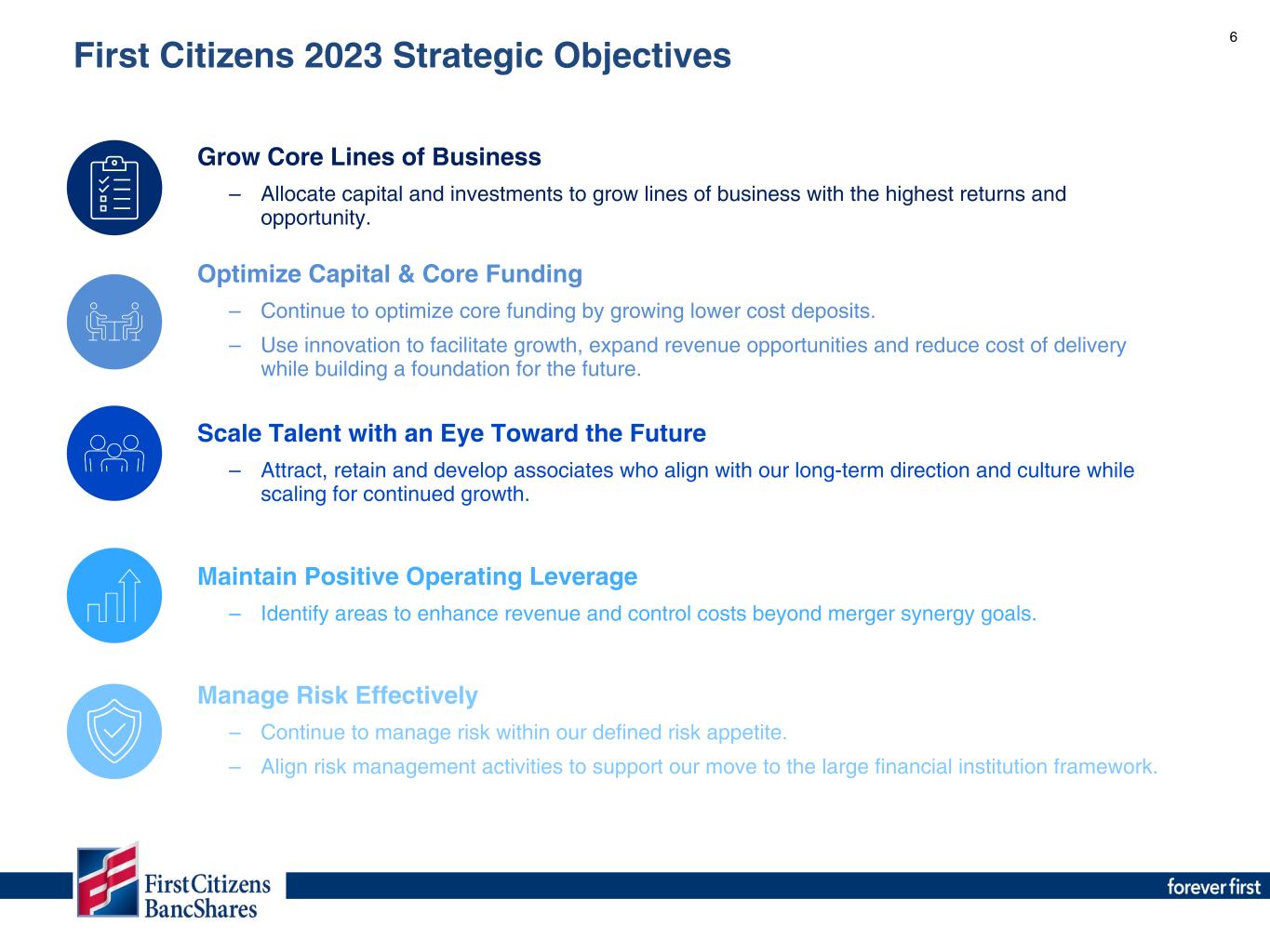 5 First Citizens 2022 Accomplishments 2022 was a highly successful year driven by our complementary merger with CIT that positioned us well for continued growth given our diverse products, services and markets. Integrated CIT • Merger integration is substantially complete. • Focused on capitalizing on opportunities to create positive operating leverage by growing revenues and optimizing operations. • Achieved ~$200 million in cost savings in 2022 and expect to recognize the remaining ~$50 million of targeted cost savings in 2023. • Repurchased 1.5 million Class A common shares for $1.2 billion during the third and fourth quarters. • Repurchase estimated to be ~10% accretive to 2023 EPS with TBV earnback period of ~3 years. Distributed capital Focused on our customers Upheld our risk culture Produced strong operating leverage • Adjusted pre-provision net revenue was up $557 million, or by 45.5% over 2021. • Net interest margin expanded driven by strong loan growth and a higher yield on earning assets. • Full year operating leverage was 14.7%. • Our adjusted efficiency ratio declined from 64.3% in 2021 to 56.4% in 2022. Our fourth quarter ratio was 54.1%. • Credit quality remains strong despite economic uncertainty. • Risk management practices continue to evolve to position us to meet the requirements of the large financial institution framework. • Loans grew by $5.6 billion, or 8.5%, driven by solid performance in both the General and Commercial banks. • Despite a challenging environment for deposits driven by unprecedented quantitative tightening, we experienced modest growth in noninterest-bearing accounts and only a slight decline in total deposits. Note – Pre-provision net revenue, operating leverage and efficiency ratio are adjusted (Non-GAAP). Refer to Section V of this presentation for a reconciliation of Non-GAAP measures to the most directly comparable GAAP measure. Changes between periods are calculated as if BancShares and CIT were combined on January 1, 2021. The Combined measures are Non-GAAP. Refer to Section V of this presentation for a reconciliation of the Combined (Non-GAAP) to BancShares (GAAP) measures. For the BancShares 2021 reported data, refer to page 33-35 of the Appendix