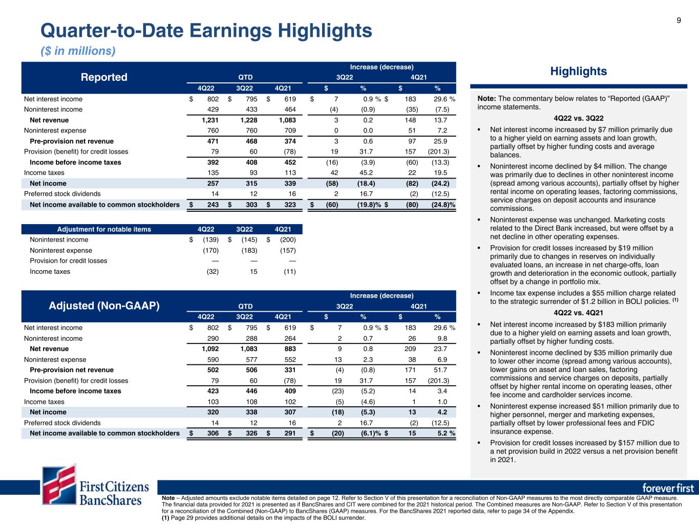 8 (1) For QTD & YTD December 2021, reported and adjusted (Non-GAAP) ratios for EPS, ROE and ROTCE are for BancShares and do not include CIT results. (2) For QTD & YTD December 2021, reported and adjusted (Non-GAAP) ratios for ROA, PPNR ROA, NIM, net charge-off ratio and efficiency ratio are presented as if BancShares and CIT were combined during the 2021 historical period. The Combined measures are Non-GAAP. Refer to Section V of this presentation for a reconciliation of the Combined (Non-GAAP) to BancShares (GAAP) measures. For the BancShares 2021 reported ratios (GAAP), refer to page 35 of the Appendix. Quarter-to-date Year-to-date Dec 22 Sep 22 Dec 21 Dec 22 Dec 21 EPS (1) $ 16.67 $ 20.94 $ 19.25 $ 20.77 $ 12.09 $ 12.82 $ 67.40 $ 77.24 $ 53.88 $ 51.88 ROE (1) 11.05 % 13.89 % 12.49 % 13.47 % 10.96 % 11.63 % 11.15 % 12.78 % 12.84 % 12.36 % ROTCE (1) 11.70 % 14.71 % 13.17 % 14.20 % 12.00 % 12.72 % 11.78 % 13.50 % 14.12 % 13.60 % ROA (2) 0.93 % 1.15 % 1.16 % 1.24 % 1.20 % 1.09 % 1.01 % 1.15 % 1.33 % 1.10 % PPNR ROA (2) 1.70 % 1.81 % 1.72 % 1.86 % 1.33 % 1.17 % 1.84 % 1.64 % 1.41 % 1.11 % NIM (2) 3.36 % 3.36 % 3.40 % 3.40 % 2.56 % 2.56 % 3.14 % 3.14 % 2.55 % 2.55 % Net charge-off ratio (2) 0.14 % 0.14 % 0.10 % 0.10 % 0.04 % 0.04 % 0.12 % 0.12 % 0.08 % 0.08 % Efficiency ratio (2) 61.74 % 54.08 % 61.91 % 53.32 % 65.40 % 62.51 % 60.50 % 56.40 % 64.43 % 64.34 % Reported Adjusted (Non-GAAP) Reported Adjusted (Non-GAAP) Reported Adjusted (Non-GAAP) Reported Adjusted (Non-GAAP) Reported Adjusted (Non-GAAP) Note – Adjusted ratios exclude notable items outlined on page 12. Refer to Section V of this presentation for a reconciliation of Non-GAAP measures to the most directly comparable GAAP measure. Financial Highlights
