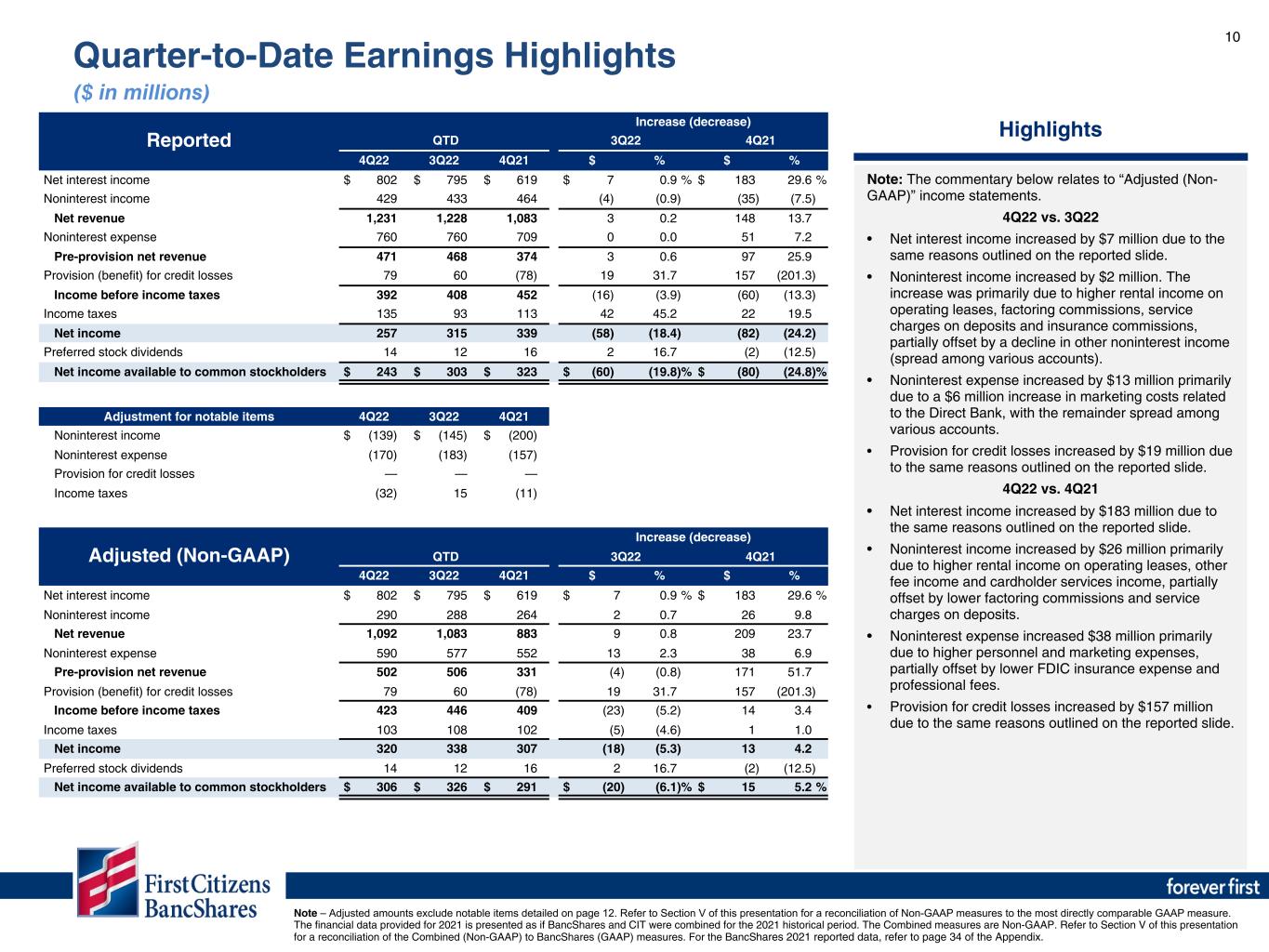 9 Reported Increase (decrease) QTD 3Q22 4Q21 4Q22 3Q22 4Q21 $ % $ % Net interest income $ 802 $ 795 $ 619 $ 7 0.9 % $ 183 29.6 % Noninterest income 429 433 464 (4) (0.9) (35) (7.5) Net revenue 1,231 1,228 1,083 3 0.2 148 13.7 Noninterest expense 760 760 709 0 0.0 51 7.2 Pre-provision net revenue 471 468 374 3 0.6 97 25.9 Provision (benefit) for credit losses 79 60 (78) 19 31.7 157 (201.3) Income before income taxes 392 408 452 (16) (3.9) (60) (13.3) Income taxes 135 93 113 42 45.2 22 19.5 Net income 257 315 339 (58) (18.4) (82) (24.2) Preferred stock dividends 14 12 16 2 16.7 (2) (12.5) Net income available to common stockholders $ 243 $ 303 $ 323 $ (60) (19.8) % $ (80) (24.8) % Adjustment for notable items 4Q22 3Q22 4Q21 Noninterest income $ (139) $ (145) $ (200) Noninterest expense (170) (183) (157) Provision for credit losses — — — Income taxes (32) 15 (11) Adjusted (Non-GAAP) Increase (decrease) QTD 3Q22 4Q21 4Q22 3Q22 4Q21 $ % $ % Net interest income $ 802 $ 795 $ 619 $ 7 0.9 % $ 183 29.6 % Noninterest income 290 288 264 2 0.7 26 9.8 Net revenue 1,092 1,083 883 9 0.8 209 23.7 Noninterest expense 590 577 552 13 2.3 38 6.9 Pre-provision net revenue 502 506 331 (4) (0.8) 171 51.7 Provision (benefit) for credit losses 79 60 (78) 19 31.7 157 (201.3) Income before income taxes 423 446 409 (23) (5.2) 14 3.4 Income taxes 103 108 102 (5) (4.6) 1 1.0 Net income 320 338 307 (18) (5.3) 13 4.2 Preferred stock dividends 14 12 16 2 16.7 (2) (12.5) Net income available to common stockholders $ 306 $ 326 $ 291 $ (20) (6.1) % $ 15 5.2 % Highlights Note: The commentary below relates to “Reported (GAAP)” income statements. 4Q22 vs. 3Q22 • Net interest income increased by $7 million primarily due to a higher yield on earning assets and loan growth, partially offset by higher funding costs and average balances. • Noninterest income declined by $4 million. The change was primarily due to declines in other noninterest income (spread among various accounts), partially offset by higher rental income on operating leases, factoring commissions, service charges on deposit accounts and insurance commissions. • Noninterest expense was unchanged. Marketing costs related to the Direct Bank increased, but were offset by a net decline in other operating expenses. • Provision for credit losses increased by $19 million primarily due to changes in reserves on individually evaluated loans, an increase in net charge-offs, loan growth and deterioration in the economic outlook, partially offset by a change in portfolio mix. • Income tax expense includes a $55 million charge related to the strategic surrender of $1.2 billion in BOLI policies. (1) 4Q22 vs. 4Q21 • Net interest income increased by $183 million primarily due to a higher yield on earning assets and loan growth, partially offset by higher funding costs. • Noninterest income declined by $35 million primarily due to lower other income (spread among various accounts), lower gains on asset and loan sales, factoring commissions and service charges on deposits, partially offset by higher rental income on operating leases, other fee income and cardholder services income. • Noninterest expense increased $51 million primarily due to higher personnel, merger and marketing expenses, partially offset by lower professional fees and FDIC insurance expense. • Provision for credit losses increased by $157 million due to a net provision build in 2022 versus a net provision benefit in 2021. Note – Adjusted amounts exclude notable items detailed on page 12. Refer to Section V of this presentation for a reconciliation of Non-GAAP measures to the most directly comparable GAAP measure. The financial data provided for 2021 is presented as if BancShares and CIT were combined for the 2021 historical period. The Combined measures are Non-GAAP. Refer to Section V of this presentation for a reconciliation of the Combined (Non-GAAP) to BancShares (GAAP) measures. For the BancShares 2021 reported data, refer to page 34 of the Appendix. (1) Page 29 provides additional details on the impacts of the BOLI surrender. Quarter-to-Date Earnings Highlights ($ in millions)