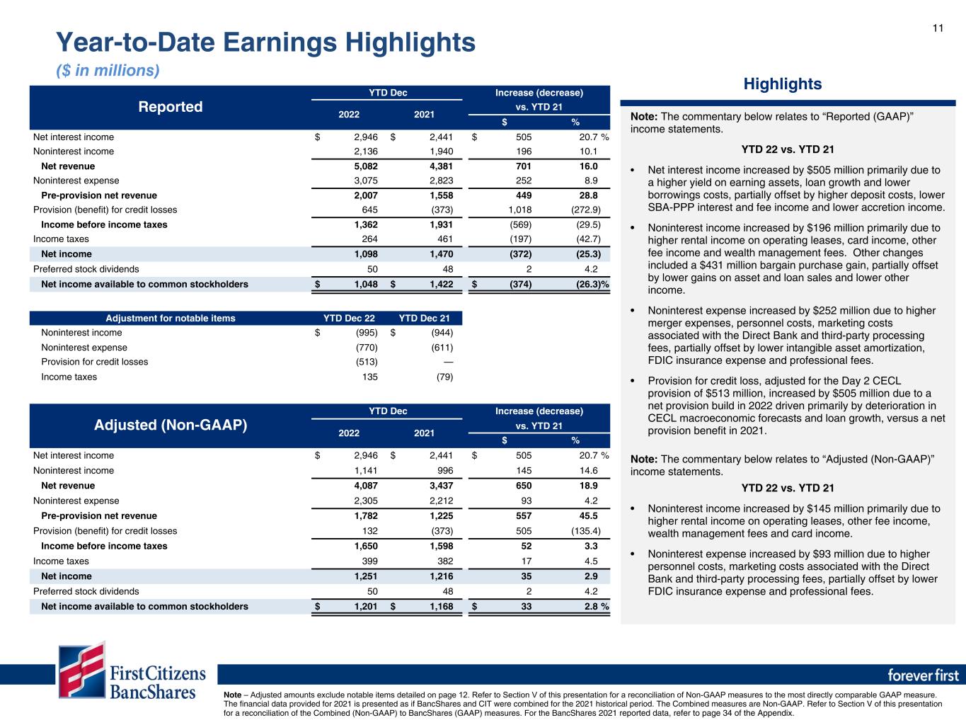10 Reported Increase (decrease) QTD 3Q22 4Q21 4Q22 3Q22 4Q21 $ % $ % Net interest income $ 802 $ 795 $ 619 $ 7 0.9 % $ 183 29.6 % Noninterest income 429 433 464 (4) (0.9) (35) (7.5) Net revenue 1,231 1,228 1,083 3 0.2 148 13.7 Noninterest expense 760 760 709 0 0.0 51 7.2 Pre-provision net revenue 471 468 374 3 0.6 97 25.9 Provision (benefit) for credit losses 79 60 (78) 19 31.7 157 (201.3) Income before income taxes 392 408 452 (16) (3.9) (60) (13.3) Income taxes 135 93 113 42 45.2 22 19.5 Net income 257 315 339 (58) (18.4) (82) (24.2) Preferred stock dividends 14 12 16 2 16.7 (2) (12.5) Net income available to common stockholders $ 243 $ 303 $ 323 $ (60) (19.8) % $ (80) (24.8) % Adjustment for notable items 4Q22 3Q22 4Q21 Noninterest income $ (139) $ (145) $ (200) Noninterest expense (170) (183) (157) Provision for credit losses — — — Income taxes (32) 15 (11) Adjusted (Non-GAAP) Increase (decrease) QTD 3Q22 4Q21 4Q22 3Q22 4Q21 $ % $ % Net interest income $ 802 $ 795 $ 619 $ 7 0.9 % $ 183 29.6 % Noninterest income 290 288 264 2 0.7 26 9.8 Net revenue 1,092 1,083 883 9 0.8 209 23.7 Noninterest expense 590 577 552 13 2.3 38 6.9 Pre-provision net revenue 502 506 331 (4) (0.8) 171 51.7 Provision (benefit) for credit losses 79 60 (78) 19 31.7 157 (201.3) Income before income taxes 423 446 409 (23) (5.2) 14 3.4 Income taxes 103 108 102 (5) (4.6) 1 1.0 Net income 320 338 307 (18) (5.3) 13 4.2 Preferred stock dividends 14 12 16 2 16.7 (2) (12.5) Net income available to common stockholders $ 306 $ 326 $ 291 $ (20) (6.1) % $ 15 5.2 % Highlights Note: The commentary below relates to “Adjusted (Non- GAAP)” income statements. 4Q22 vs. 3Q22 • Net interest income increased by $7 million due to the same reasons outlined on the reported slide. • Noninterest income increased by $2 million. The increase was primarily due to higher rental income on operating leases, factoring commissions, service charges on deposits and insurance commissions, partially offset by a decline in other noninterest income (spread among various accounts). • Noninterest expense increased by $13 million primarily due to a $6 million increase in marketing costs related to the Direct Bank, with the remainder spread among various accounts. • Provision for credit losses increased by $19 million due to the same reasons outlined on the reported slide. 4Q22 vs. 4Q21 • Net interest income increased by $183 million due to the same reasons outlined on the reported slide. • Noninterest income increased by $26 million primarily due to higher rental income on operating leases, other fee income and cardholder services income, partially offset by lower factoring commissions and service charges on deposits. • Noninterest expense increased $38 million primarily due to higher personnel and marketing expenses, partially offset by lower FDIC insurance expense and professional fees. • Provision for credit losses increased by $157 million due to the same reasons outlined on the reported slide. Note – Adjusted amounts exclude notable items detailed on page 12. Refer to Section V of this presentation for a reconciliation of Non-GAAP measures to the most directly comparable GAAP measure. The financial data provided for 2021 is presented as if BancShares and CIT were combined for the 2021 historical period. The Combined measures are Non-GAAP. Refer to Section V of this presentation for a reconciliation of the Combined (Non-GAAP) to BancShares (GAAP) measures. For the BancShares 2021 reported data, refer to page 34 of the Appendix. Quarter-to-Date Earnings Highlights ($ in millions)
