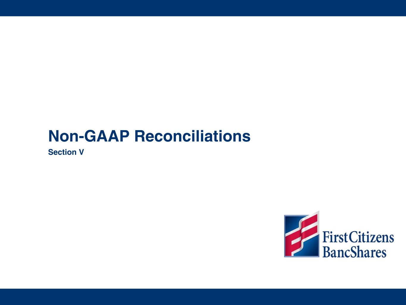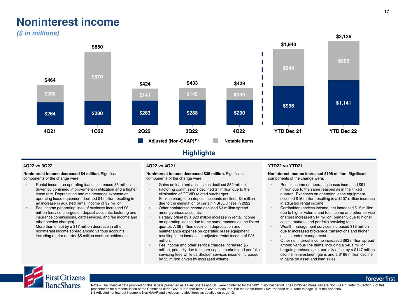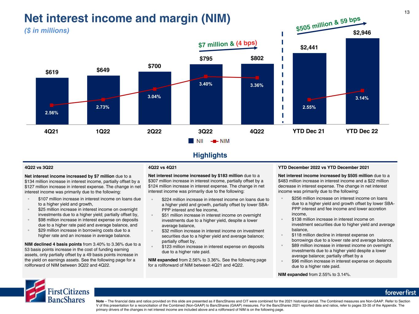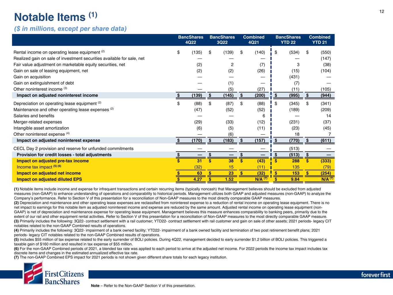 12 BancShares 4Q22 BancShares 3Q22 Combined 4Q21 BancShares YTD 22 Combined YTD 21 Rental income on operating lease equipment (2) $ (135) $ (139) $ (140) $ (534) $ (550) Realized gain on sale of investment securities available for sale, net — — — — (147) Fair value adjustment on marketable equity securities, net (2) 2 (7) 3 (38) Gain on sale of leasing equipment, net (2) (2) (26) (15) (104) Gain on acquisition — — — (431) — Gain on extinguishment of debt — (1) — (7) — Other noninterest income (3) — (5) (27) (11) (105) Impact on adjusted noninterest income $ (139) $ (145) $ (200) $ (995) $ (944) Depreciation on operating lease equipment (2) $ (88) $ (87) $ (88) $ (345) $ (341) Maintenance and other operating lease expenses (2) (47) (52) (52) (189) (209) Salaries and benefits — — 6 — 14 Merger-related expenses (29) (33) (12) (231) (37) Intangible asset amortization (6) (5) (11) (23) (45) Other noninterest expense (4) — (6) — 18 7 Impact on adjusted noninterest expense $ (170) $ (183) $ (157) $ (770) $ (611) CECL Day 2 provision and reserve for unfunded commitments — — — (513) — Provision for credit losses - total adjustments $ — $ — $ — $ (513) $ — Impact on adjusted pre-tax income $ 31 $ 38 $ (43) $ 288 $ (333) Income tax impact (5) (6) (32) 15 (11) 135 (79) Impact on adjusted net income $ 63 $ 23 $ (32) $ 153 $ (254) Impact on adjusted diluted EPS $ 4.27 $ 1.52 N/A (7) $ 9.84 N/A (7) (1) Notable items include income and expense for infrequent transactions and certain recurring items (typically noncash) that Management believes should be excluded from adjusted measures (non-GAAP) to enhance understanding of operations and comparability to historical periods. Management utilizes both GAAP and adjusted measures (non-GAAP) to analyze the Company’s performance. Refer to Section V of this presentation for a reconciliation of Non-GAAP measures to the most directly comparable GAAP measures. (2) Depreciation and maintenance and other operating lease expenses are reclassified from noninterest expense to a reduction of rental income on operating lease equipment. There is no net impact to earnings for this notable item as adjusted noninterest income and expense are reduced by the same amount. Adjusted rental income on operating lease equipment (non- GAAP) is net of depreciation and maintenance expense for operating lease equipment. Management believes this measure enhances comparability to banking peers, primarily due to the extent of our rail and other equipment rental activities. Refer to Section V of this presentation for a reconciliation of Non-GAAP measures to the most directly comparable GAAP measure. (3) Primarily includes the following: 3Q22- contract settlement with a rail customer; YTD22- contract settlement with rail customer and gain on sale of other assets; 2021 periods- legacy CIT notables related to the non-GAAP Combined results of operations. (4) Primarily includes the following: 3Q22- impairment of a bank owned facility; YTD22- impairment of a bank owned facility and termination of two post retirement benefit plans; 2021 periods- legacy CIT notables related to the non-GAAP Combined results of operations. (5) Includes $55 million of tax expense related to the early surrender of BOLI policies. During 4Q22, management decided to early surrender $1.2 billion of BOLI policies. This triggered a taxable gain of $160 million and resulted in tax expense of $55 million. (6) For the non-GAAP Combined periods of 2021, a blended tax rate was applied to each period to arrive at the adjusted net income. For 2022 periods the income tax impact includes tax discrete items and changes in the estimated annualized effective tax rate. (7) The non-GAAP Combined EPS impact for 2021 periods is not shown given different share totals for each legacy institution. Notable Items (1) ($ in millions, except per share data) Note – Refer to the Non-GAAP Section V of this presentation.