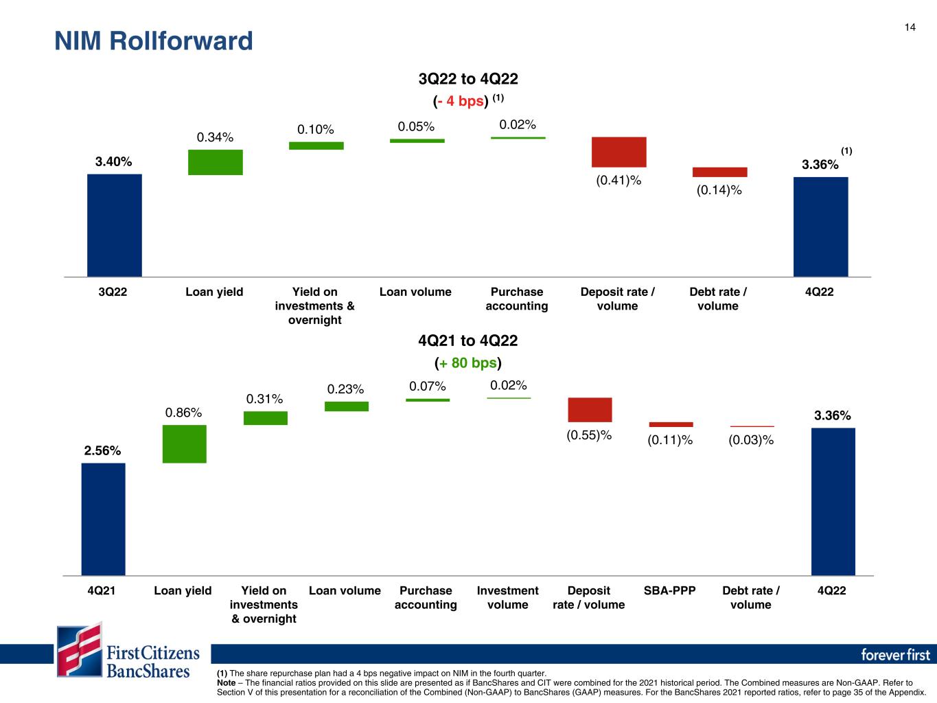 13 $2,441 $2,946 2.55% 3.14% YTD Dec 21 YTD Dec 22 $619 $649 $700 $795 $802 2.56% 2.73% 3.04% 3.40% 3.36% 4Q21 1Q22 2Q22 3Q22 4Q22 4Q22 vs 3Q22 Net interest income increased by $7 million due to a $134 million increase in interest income, partially offset by a $127 million increase in interest expense. The change in net interest income was primarily due to the following: ◦ $107 million increase in interest income on loans due to a higher yield and growth, ◦ $25 million increase in interest income on overnight investments due to a higher yield; partially offset by, ◦ $98 million increase in interest expense on deposits due to a higher rate paid and average balance, and ◦ $29 million increase in borrowing costs due to a higher rate and an increase in average balance. NIM declined 4 basis points from 3.40% to 3.36% due to a 53 basis points increase in the cost of funding earning assets, only partially offset by a 49 basis points increase in the yield on earnings assets. See the following page for a rollforward of NIM between 3Q22 and 4Q22. YTD December 2022 vs YTD December 2021 Net interest income increased by $505 million due to a $483 million increase in interest income and a $22 million decrease in interest expense. The change in net interest income was primarily due to the following: ◦ $256 million increase on interest income on loans due to a higher yield and growth offset by lower SBA- PPP interest and fee income and lower accretion income, ◦ $138 million increase in interest income on investment securities due to higher yield and average balance, ◦ $118 million decline in interest expense on borrowings due to a lower rate and average balance, ◦ $89 million increase in interest income on overnight investments due to a higher yield despite a lower average balance; partially offset by a ◦ $96 million increase in interest expense on deposits due to a higher rate paid. NIM expanded from 2.55% to 3.14%. $505 million & 59 bps Highlights $7 million & (4 bps) 4Q22 vs 4Q21 Net interest income increased by $183 million due to a $307 million increase in interest income, partially offset by a $124 million increase in interest expense. The change in net interest income was primarily due to the following: ◦ $224 million increase in interest income on loans due to a higher yield and growth, partially offset by lower SBA- PPP interest and fee income, ◦ $51 million increase in interest income on overnight investments due to a higher yield, despite a lower average balance, ◦ $32 million increase in interest income on investment securities due to a higher yield and average balance; partially offset by, ◦ $123 million increase in interest expense on deposits due to a higher rate paid. NIM expanded from 2.56% to 3.36%. See the following page for a rollforward of NIM between 4Q21 and 4Q22. Note – The financial data and ratios provided on this slide are presented as if BancShares and CIT were combined for the 2021 historical period. The Combined measures are Non-GAAP. Refer to Section V of this presentation for a reconciliation of the Combined (Non-GAAP) to BancShares (GAAP) measures. For the BancShares 2021 reported data and ratios, refer to pages 33-35 of the Appendix. The primary drivers of the changes in net interest income are included above and a rollforward of NIM is on the following page. Net interest income and margin (NIM) ($ in millions)