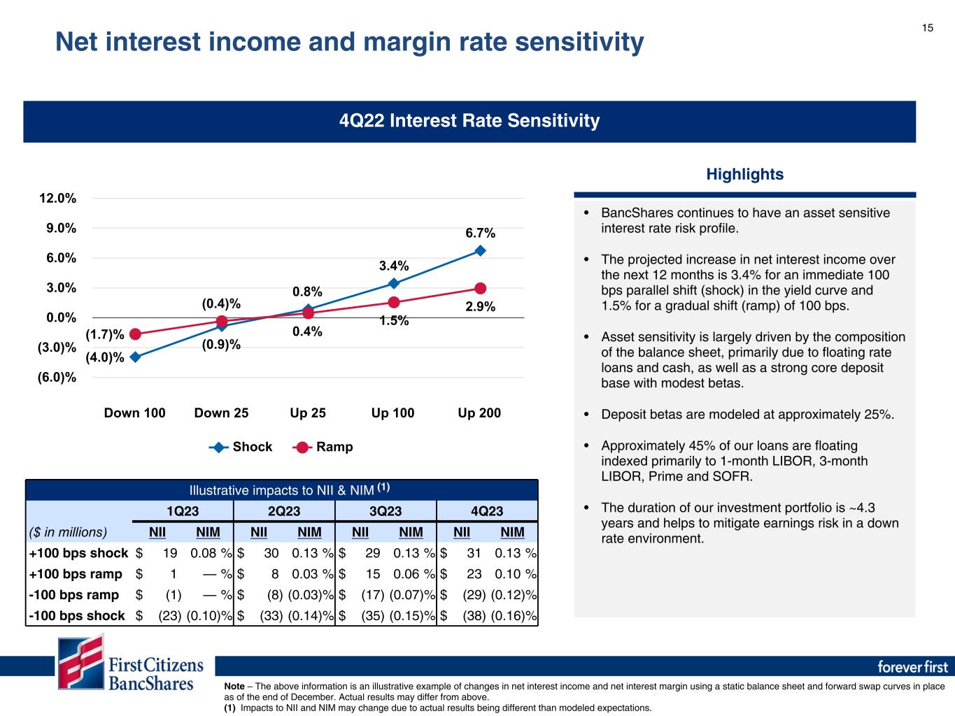 14 3.40% 0.34% 0.10% 0.05% 0.02% (0.41)% (0.14)% 3.36% 3Q22 Loan yield Yield on investments & overnight Loan volume Purchase accounting Deposit rate / volume Debt rate / volume 4Q22 2.56% 0.86% 0.31% 0.23% 0.07% 0.02% (0.55)% (0.11)% (0.03)% 3.36% 4Q21 Loan yield Yield on investments & overnight Loan volume Purchase accounting Investment volume Deposit rate / volume SBA-PPP Debt rate / volume 4Q22 4Q21 to 4Q22 (+ 80 bps) 3Q22 to 4Q22 (- 4 bps) (1) (1) The share repurchase plan had a 4 bps negative impact on NIM in the fourth quarter. Note – The financial ratios provided on this slide are presented as if BancShares and CIT were combined for the 2021 historical period. The Combined measures are Non-GAAP. Refer to Section V of this presentation for a reconciliation of the Combined (Non-GAAP) to BancShares (GAAP) measures. For the BancShares 2021 reported ratios, refer to page 35 of the Appendix. NIM Rollforward (1)