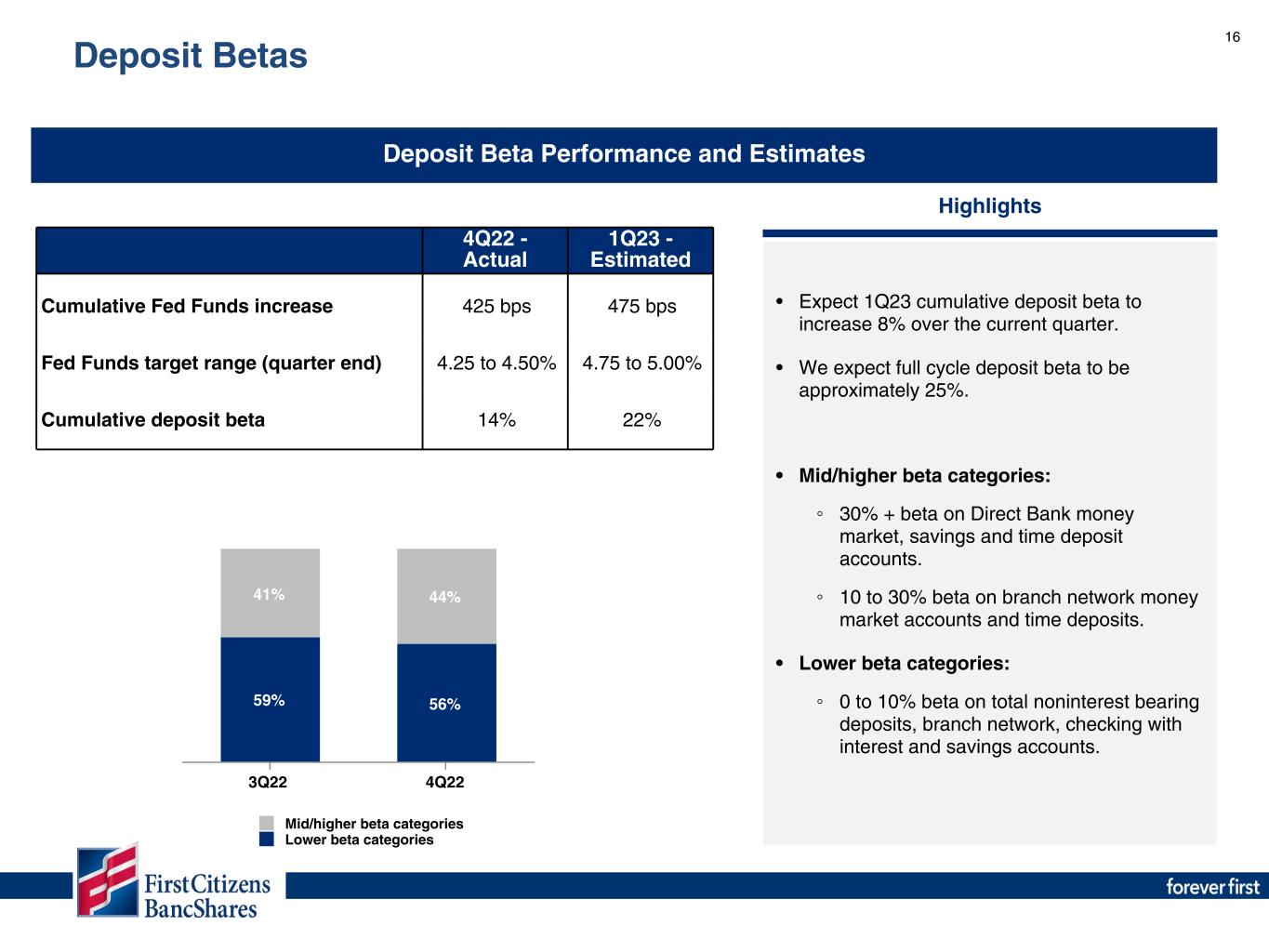 15 4Q22 Interest Rate Sensitivity Note – The above information is an illustrative example of changes in net interest income and net interest margin using a static balance sheet and forward swap curves in place as of the end of December. Actual results may differ from above. (1) Impacts to NII and NIM may change due to actual results being different than modeled expectations. Highlights • BancShares continues to have an asset sensitive interest rate risk profile. • The projected increase in net interest income over the next 12 months is 3.4% for an immediate 100 bps parallel shift (shock) in the yield curve and 1.5% for a gradual shift (ramp) of 100 bps. • Asset sensitivity is largely driven by the composition of the balance sheet, primarily due to floating rate loans and cash, as well as a strong core deposit base with modest betas. • Deposit betas are modeled at approximately 25%. • Approximately 45% of our loans are floating indexed primarily to 1-month LIBOR, 3-month LIBOR, Prime and SOFR. • The duration of our investment portfolio is ~4.3 years and helps to mitigate earnings risk in a down rate environment. (4.0)% (0.9)% 0.8% 3.4% 6.7% (1.7)% (0.4)% 0.4% 1.5% 2.9% Shock Ramp Down 100 Down 25 Up 25 Up 100 Up 200 (6.0)% (3.0)% 0.0% 3.0% 6.0% 9.0% 12.0% Illustrative impacts to NII & NIM 1Q23 2Q23 3Q23 4Q23 ($ in millions) NII NIM NII NIM NII NIM NII NIM +100 bps shock $ 19 0.08 % $ 30 0.13 % $ 29 0.13 % $ 31 0.13 % +100 bps ramp $ 1 — % $ 8 0.03 % $ 15 0.06 % $ 23 0.10 % -100 bps ramp $ (1) — % $ (8) (0.03) % $ (17) (0.07) % $ (29) (0.12) % -100 bps shock $ (23) (0.10) % $ (33) (0.14) % $ (35) (0.15) % $ (38) (0.16) % (1) Net interest income and margin rate sensitivity
