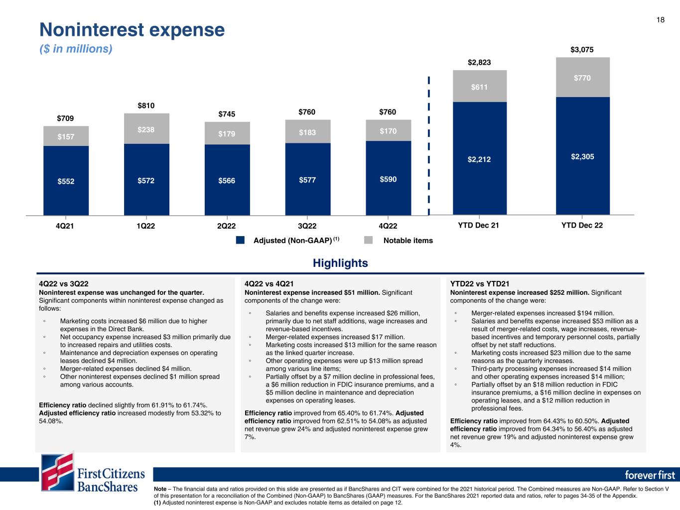 17 Noninterest income ($ in millions) $1,940 $2,136 $996 $1,141 $944 $995 YTD Dec 21 YTD Dec 22 $464 $850 $424 $433 $429 $264 $280 $283 $288 $290 $200 $570 $141 $145 $139 4Q21 1Q22 2Q22 3Q22 4Q22 4Q22 vs 3Q22 Noninterest income decreased $4 million. Significant components of the change were: ◦ Rental income on operating leases increased $5 million driven by continued improvement in utilization and a higher lease rate. Depreciation and maintenance expense on operating lease equipment declined $4 million resulting in an increase in adjusted rental income of $9 million. ◦ Fee income generating lines of business increased $8 million (service charges on deposit accounts, factoring and insurance commissions, card services, and fee income and other service charges). ◦ More than offset by a $17 million decrease in other noninterest income spread among various accounts, including a prior quarter $5 million contract settlement. YTD22 vs YTD21 Noninterest income increased $196 million. Significant components of the change were: ◦ Rental income on operating leases increased $91 million due to the same reasons as in the linked quarter. Expenses on operating lease equipment declined $16 million resulting in a $107 million increase in adjusted rental income. ◦ Cardholder services income, net increased $15 million due to higher volume and fee income and other service charges increased $14 million, primarily due to higher capital markets and portfolio servicing fees. ◦ Wealth management services increased $13 million due to increased brokerage transactions and higher assets under management. ◦ Other noninterest income increased $63 million spread among various line items, including a $431 million bargain purchase gain, partially offset by a $147 million decline in investment gains and a $188 million decline in gains on asset and loan sales. Highlights Core: #N/A increase 4Q22 vs 4Q21 Noninterest income decreased $35 million. Significant components of the change were: ◦ Gains on loan and asset sales declined $52 million. ◦ Factoring commissions declined $7 million due to the elimination of COVID related surcharges. ◦ Service charges on deposit accounts declined $4 million due to the elimination of certain NSF/OD fees in 2022. ◦ Other noninterest income declined $3 million spread among various accounts. ◦ Partially offset by a $20 million increase in rental income on operating leases due to the same reasons as the linked quarter. A $5 million decline in depreciation and maintenance expense on operating lease equipment resulting in an increase in adjusted rental income of $25 million. ◦ Fee income and other service charges increased $6 million, primarily due to higher capital markets and portfolio servicing fees while cardholder services income increased by $5 million driven by increased volume. Note – The financial data provided on this slide is presented as if BancShares and CIT were combined for the 2021 historical period. The Combined measures are Non-GAAP. Refer to Section V of this presentation for a reconciliation of the Combined (Non-GAAP) to BancShares (GAAP) measures. For the BancShares 2021 reported data, refer to page 34 of the Appendix. (1) Adjusted noninterest income is Non-GAAP and excludes notable items as detailed on page 12. Adjusted (Non-GAAP) (1) Notable items