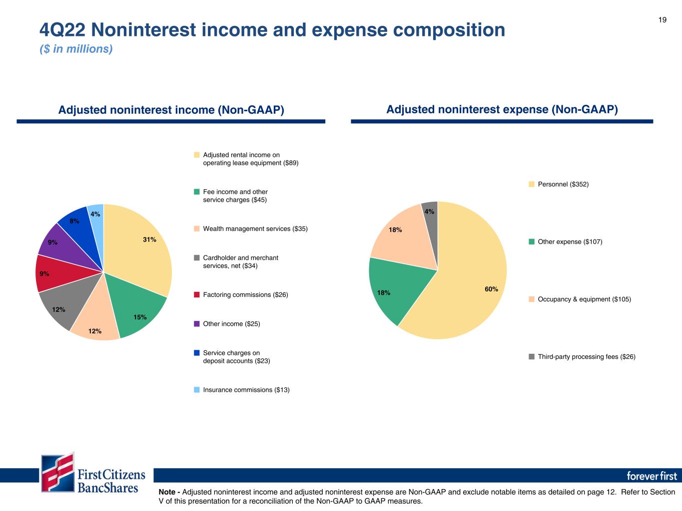 18 $709 $810 $745 $760 $760 $552 $572 $566 $577 $590 $157 $238 $179 $183 $170 4Q21 1Q22 2Q22 3Q22 4Q22 Highlights 4Q22 vs 4Q21 Noninterest expense increased $51 million. Significant components of the change were: ◦ Salaries and benefits expense increased $26 million, primarily due to net staff additions, wage increases and revenue-based incentives. ◦ Merger-related expenses increased $17 million. ◦ Marketing costs increased $13 million for the same reason as the linked quarter increase. ◦ Other operating expenses were up $13 million spread among various line items; ◦ Partially offset by a $7 million decline in professional fees, a $6 million reduction in FDIC insurance premiums, and a $5 million decline in maintenance and depreciation expenses on operating leases. Efficiency ratio improved from 65.40% to 61.74%. Adjusted efficiency ratio improved from 62.51% to 54.08% as adjusted net revenue grew 24% and adjusted noninterest expense grew 7%. 4Q22 vs 3Q22 Noninterest expense was unchanged for the quarter. Significant components within noninterest expense changed as follows: ◦ Marketing costs increased $6 million due to higher expenses in the Direct Bank. ◦ Net occupancy expense increased $3 million primarily due to increased repairs and utilities costs. ◦ Maintenance and depreciation expenses on operating leases declined $4 million. ◦ Merger-related expenses declined $4 million. ◦ Other noninterest expenses declined $1 million spread among various accounts. Efficiency ratio declined slightly from 61.91% to 61.74%. Adjusted efficiency ratio increased modestly from 53.32% to 54.08%. YTD22 vs YTD21 Noninterest expense increased $252 million. Significant components of the change were: ◦ Merger-related expenses increased $194 million. ◦ Salaries and benefits expense increased $53 million as a result of merger-related costs, wage increases, revenue- based incentives and temporary personnel costs, partially offset by net staff reductions. ◦ Marketing costs increased $23 million due to the same reasons as the quarterly increases. ◦ Third-party processing expenses increased $14 million and other operating expenses increased $14 million; ◦ Partially offset by an $18 million reduction in FDIC insurance premiums, a $16 million decline in expenses on operating leases, and a $12 million reduction in professional fees. Efficiency ratio improved from 64.43% to 60.50%. Adjusted efficiency ratio improved from 64.34% to 56.40% as adjusted net revenue grew 19% and adjusted noninterest expense grew 4%. Note – The financial data and ratios provided on this slide are presented as if BancShares and CIT were combined for the 2021 historical period. The Combined measures are Non-GAAP. Refer to Section V of this presentation for a reconciliation of the Combined (Non-GAAP) to BancShares (GAAP) measures. For the BancShares 2021 reported data and ratios, refer to pages 34-35 of the Appendix. (1) Adjusted noninterest expense is Non-GAAP and excludes notable items as detailed on page 12. Noninterest expense ($ in millions) $2,823 $3,075 $2,212 $2,305 $611 $770 YTD Dec 21 YTD Dec 22 Adjusted (Non-GAAP) (1) Notable items