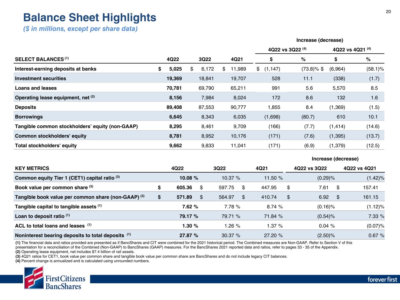 20 20 Increase (decrease) 4Q22 vs 3Q22 (4) 4Q22 vs 4Q21 (4) SELECT BALANCES (1) 4Q22 3Q22 4Q21 $ % $ % Interest-earning deposits at banks $ 5,025 $ 6,172 $ 11,989 $ (1,147) (73.8) % $ (6,964) (58.1) % Investment securities 19,369 18,841 19,707 528 11.1 (338) (1.7) Loans and leases 70,781 69,790 65,211 991 5.6 5,570 8.5 Operating lease equipment, net (2) 8,156 7,984 8,024 172 8.6 132 1.6 Deposits 89,408 87,553 90,777 1,855 8.4 (1,369) (1.5) Borrowings 6,645 8,343 6,035 (1,698) (80.7) 610 10.1 Tangible common stockholders’ equity (non-GAAP) 8,295 8,461 9,709 (166) (7.7) (1,414) (14.6) Common stockholders' equity 8,781 8,952 10,176 (171) (7.6) (1,395) (13.7) Total stockholders' equity 9,662 9,833 11,041 (171) (6.9) (1,379) (12.5) Increase (decrease) KEY METRICS 4Q22 3Q22 4Q21 4Q22 vs 3Q22 4Q22 vs 4Q21 Common equity Tier 1 (CET1) capital ratio (3) 10.08 % 10.37 % 11.50 % (0.29) % (1.42) % Book value per common share (3) $ 605.36 $ 597.75 $ 447.95 $ 7.61 $ 157.41 Tangible book value per common share (non-GAAP) (3) $ 571.89 $ 564.97 $ 410.74 $ 6.92 $ 161.15 Tangible capital to tangible assets (1) 7.62 % 7.78 % 8.74 % (0.16) % (1.12) % Loan to deposit ratio (1) 79.17 % 79.71 % 71.84 % (0.54) % 7.33 % ACL to total loans and leases (1) 1.30 % 1.26 % 1.37 % 0.04 % (0.07) % Noninterest bearing deposits to total deposits (1) 27.87 % 30.37 % 27.20 % (2.50) % 0.67 % Balance Sheet Highlights ($ in millions, except per share data) (1) The financial data and ratios provided are presented as if BancShares and CIT were combined for the 2021 historical period. The Combined measures are Non-GAAP. Refer to Section V of this presentation for a reconciliation of the Combined (Non-GAAP) to BancShares (GAAP) measures. For the BancShares 2021 reported data and ratios, refer to pages 33 - 35 of the Appendix. (2) Operating lease equipment, net includes $7.4 billion of rail assets. (3) 4Q21 ratios for CET1, book value per common share and tangible book value per common share are BancShares and do not include legacy CIT balances. (4) Percent change is annualized and is calculated using unrounded numbers.