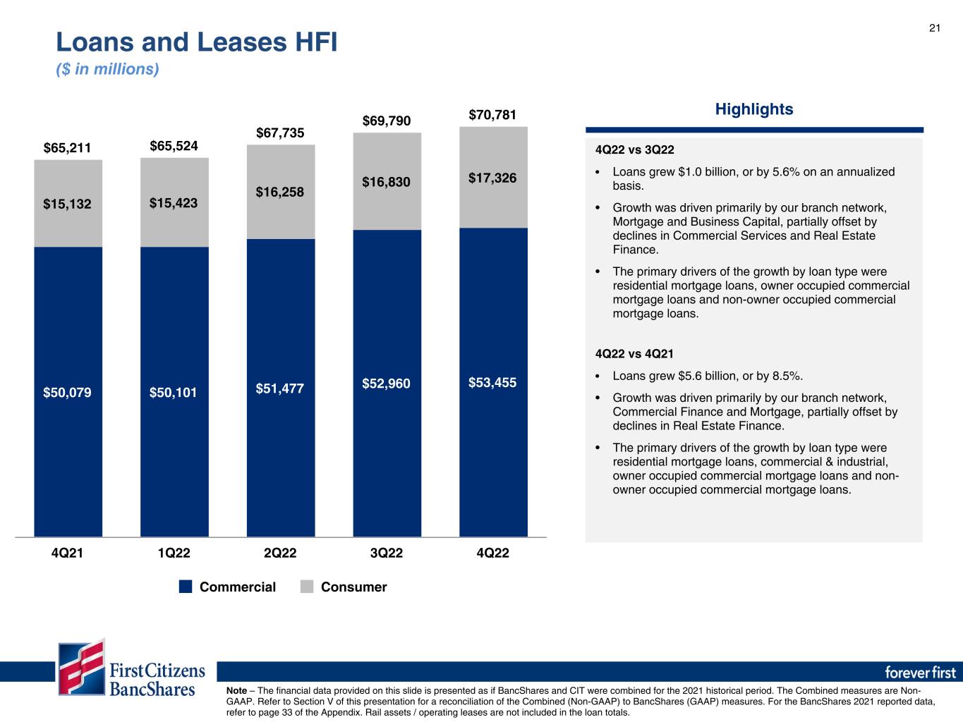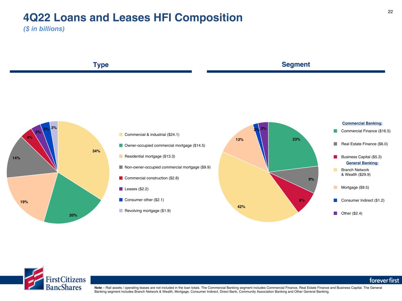 21 $65,211 $65,524 $67,735 $69,790 $70,781 $50,079 $50,101 $51,477 $52,960 $53,455 $15,132 $15,423 $16,258 $16,830 $17,326 Commercial Consumer 4Q21 1Q22 2Q22 3Q22 4Q22 Note – The financial data provided on this slide is presented as if BancShares and CIT were combined for the 2021 historical period. The Combined measures are Non- GAAP. Refer to Section V of this presentation for a reconciliation of the Combined (Non-GAAP) to BancShares (GAAP) measures. For the BancShares 2021 reported data, refer to page 33 of the Appendix. Rail assets / operating leases are not included in the loan totals. Highlights 4Q22 vs 3Q22 • Loans grew $1.0 billion, or by 5.6% on an annualized basis. • Growth was driven primarily by our branch network, Mortgage and Business Capital, partially offset by declines in Commercial Services and Real Estate Finance. • The primary drivers of the growth by loan type were residential mortgage loans, owner occupied commercial mortgage loans and non-owner occupied commercial mortgage loans. 4Q22 vs 4Q21 • Loans grew $5.6 billion, or by 8.5%. • Growth was driven primarily by our branch network, Commercial Finance and Mortgage, partially offset by declines in Real Estate Finance. • The primary drivers of the growth by loan type were residential mortgage loans, commercial & industrial, owner occupied commercial mortgage loans and non- owner occupied commercial mortgage loans. Loans and Leases HFI ($ in millions)