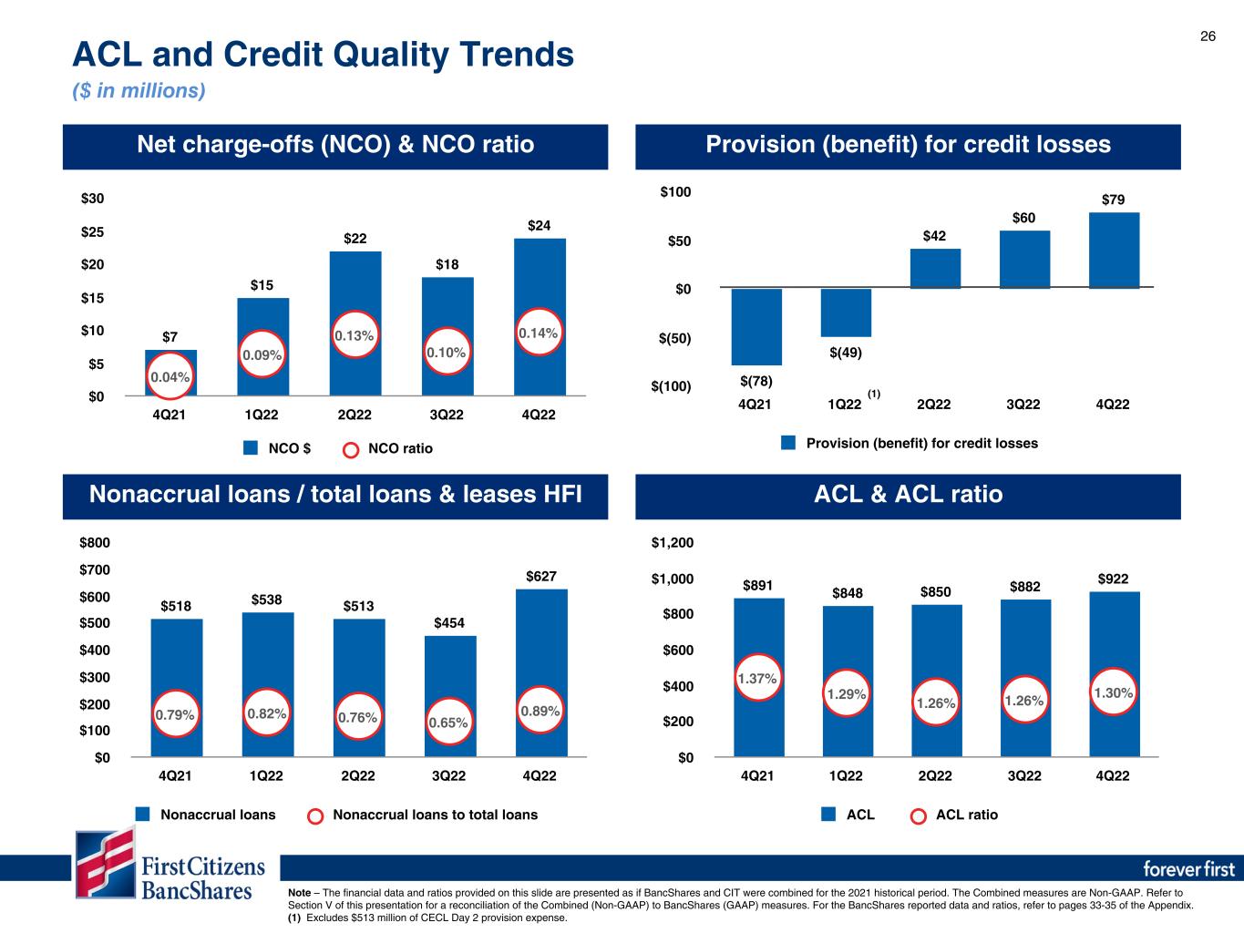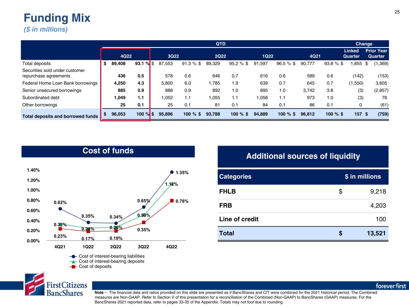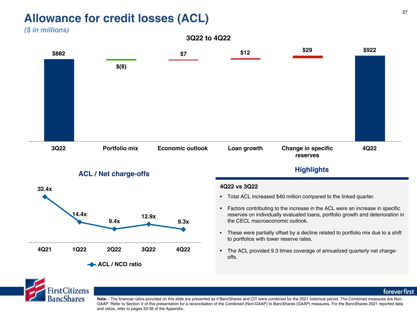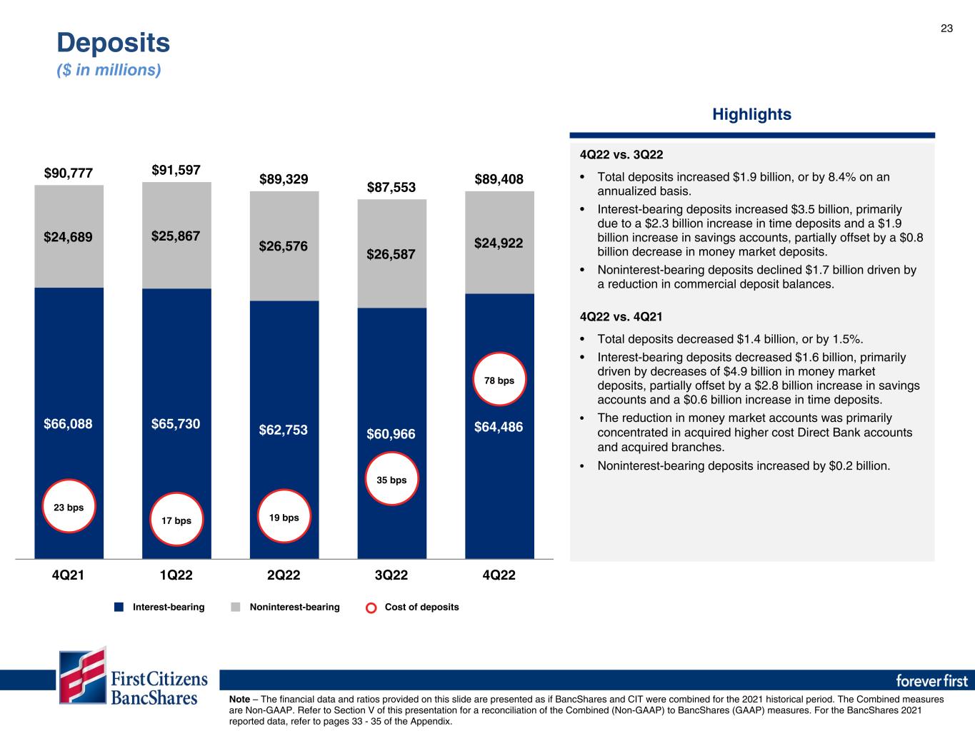 26 $(78) $(49) $42 $60 $79 Provision (benefit) for credit losses 4Q21 1Q22 2Q22 3Q22 4Q22 $(100) $(50) $0 $50 $100 ACL and Credit Quality Trends ($ in millions) Net charge-offs (NCO) & NCO ratio Provision (benefit) for credit losses $7 $15 $22 $18 $24 0.04% 0.09% 0.13% 0.10% 0.14% NCO $ NCO ratio 4Q21 1Q22 2Q22 3Q22 4Q22 $0 $5 $10 $15 $20 $25 $30 $518 $538 $513 $454 $627 0.79% 0.82% 0.76% 0.65% 0.89% Nonaccrual loans Nonaccrual loans to total loans 4Q21 1Q22 2Q22 3Q22 4Q22 $0 $100 $200 $300 $400 $500 $600 $700 $800 Nonaccrual loans / total loans & leases HFI ACL & ACL ratio $891 $848 $850 $882 $922 1.37% 1.29% 1.26% 1.26% 1.30% ACL ACL ratio 4Q21 1Q22 2Q22 3Q22 4Q22 $0 $200 $400 $600 $800 $1,000 $1,200 (1) Note – The financial data and ratios provided on this slide are presented as if BancShares and CIT were combined for the 2021 historical period. The Combined measures are Non-GAAP. Refer to Section V of this presentation for a reconciliation of the Combined (Non-GAAP) to BancShares (GAAP) measures. For the BancShares reported data and ratios, refer to pages 33-35 of the Appendix. (1) Excludes $513 million of CECL Day 2 provision expense.