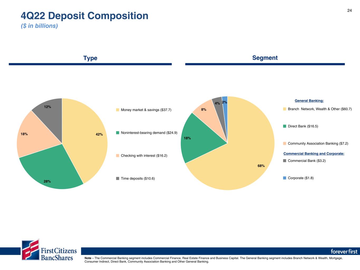 23 $90,777 $91,597 $89,329 $87,553 $89,408 $66,088 $65,730 $62,753 $60,966 $64,486 $24,689 $25,867 $26,576 $26,587 $24,922 23 bps 17 bps 19 bps 35 bps 78 bps Interest-bearing Noninterest-bearing Cost of deposits 4Q21 1Q22 2Q22 3Q22 4Q22 Highlights 4Q22 vs. 3Q22 • Total deposits increased $1.9 billion, or by 8.4% on an annualized basis. • Interest-bearing deposits increased $3.5 billion, primarily due to a $2.3 billion increase in time deposits and a $1.9 billion increase in savings accounts, partially offset by a $0.8 billion decrease in money market deposits. • Noninterest-bearing deposits declined $1.7 billion driven by a reduction in commercial deposit balances. 4Q22 vs. 4Q21 • Total deposits decreased $1.4 billion, or by 1.5%. • Interest-bearing deposits decreased $1.6 billion, primarily driven by decreases of $4.9 billion in money market deposits, partially offset by a $2.8 billion increase in savings accounts and a $0.6 billion increase in time deposits. • The reduction in money market accounts was primarily concentrated in acquired higher cost Direct Bank accounts and acquired branches. • Noninterest-bearing deposits increased by $0.2 billion. Note – The financial data and ratios provided on this slide are presented as if BancShares and CIT were combined for the 2021 historical period. The Combined measures are Non-GAAP. Refer to Section V of this presentation for a reconciliation of the Combined (Non-GAAP) to BancShares (GAAP) measures. For the BancShares 2021 reported data, refer to pages 33 - 35 of the Appendix. Deposits ($ in millions)