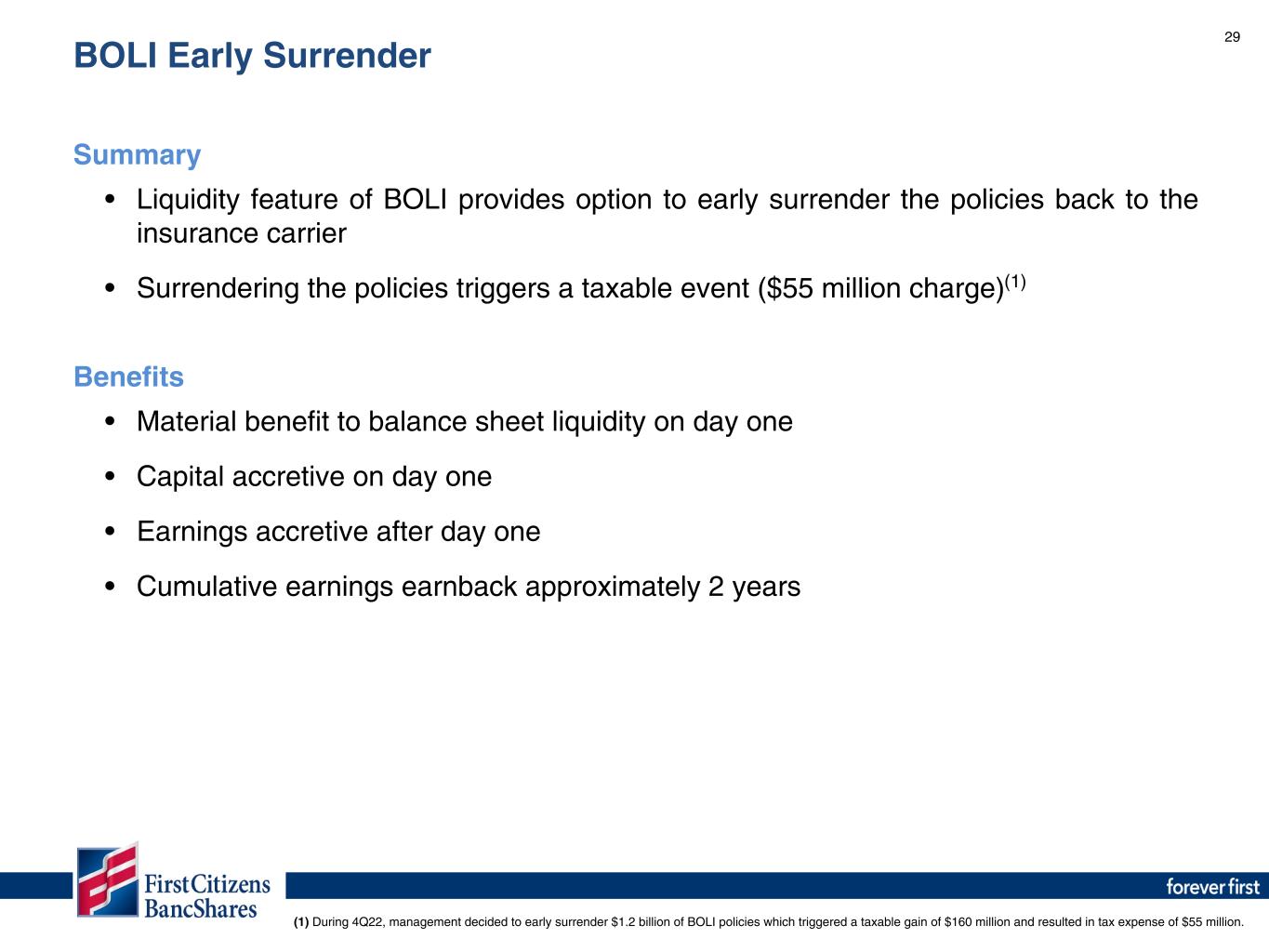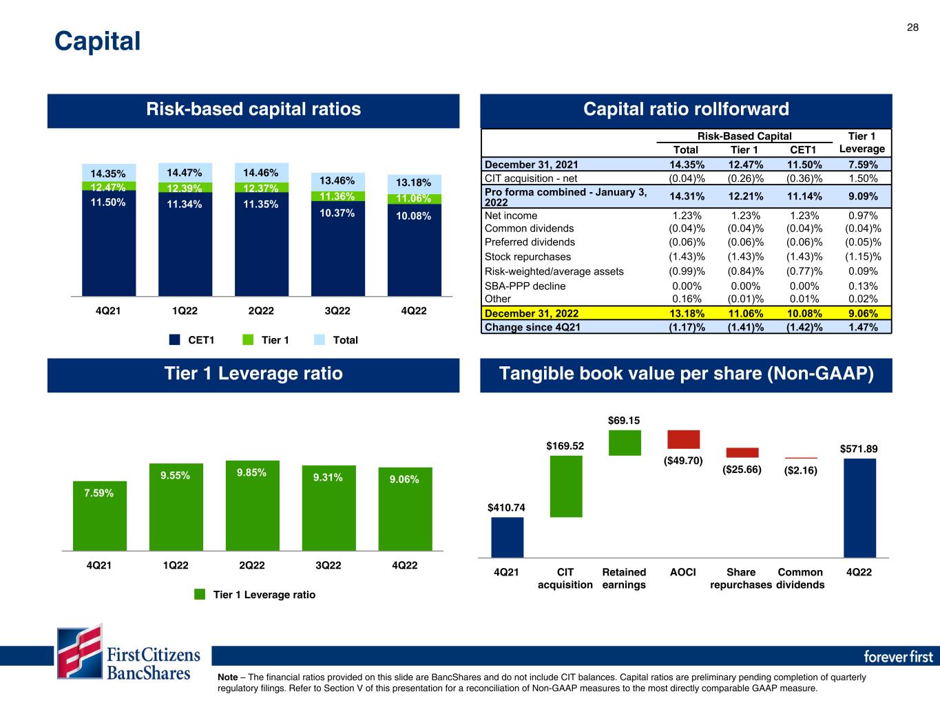 28 7.59% 9.55% 9.85% 9.31% 9.06% Tier 1 Leverage ratio 4Q21 1Q22 2Q22 3Q22 4Q22 Risk-based capital ratios Capital ratio rollforward Tier 1 Leverage ratio Tangible book value per share (Non-GAAP) Capital Risk-Based Capital Tier 1 LeverageTotal Tier 1 CET1 December 31, 2021 14.35% 12.47% 11.50% 7.59% CIT acquisition - net (0.04)% (0.26)% (0.36)% 1.50% Pro forma combined - January 3, 2022 14.31% 12.21% 11.14% 9.09% Net income 1.23% 1.23% 1.23% 0.97% Common dividends (0.04)% (0.04)% (0.04)% (0.04)% Preferred dividends (0.06)% (0.06)% (0.06)% (0.05)% Stock repurchases (1.43)% (1.43)% (1.43)% (1.15)% Risk-weighted/average assets (0.99)% (0.84)% (0.77)% 0.09% SBA-PPP decline 0.00% 0.00% 0.00% 0.13% Other 0.16% (0.01)% 0.01% 0.02% December 31, 2022 13.18% 11.06% 10.08% 9.06% Change since 4Q21 (1.17)% (1.41)% (1.42)% 1.47% $410.74 $169.52 $69.15 ($49.70) ($25.66) ($2.16) $571.89 4Q21 CIT acquisition Retained earnings AOCI Share repurchases Common dividends 4Q22 11.50% 11.34% 11.35% 10.37% 10.08% 12.47% 12.39% 12.37% 11.36% 11.06% 14.35% 14.47% 14.46% 13.46% 13.18% CET1 Tier 1 Total 4Q21 1Q22 2Q22 3Q22 4Q22 Note – The financial ratios provided on this slide are BancShares and do not include CIT balances. Capital ratios are preliminary pending completion of quarterly regulatory filings. Refer to Section V of this presentation for a reconciliation of Non-GAAP measures to the most directly comparable GAAP measure.