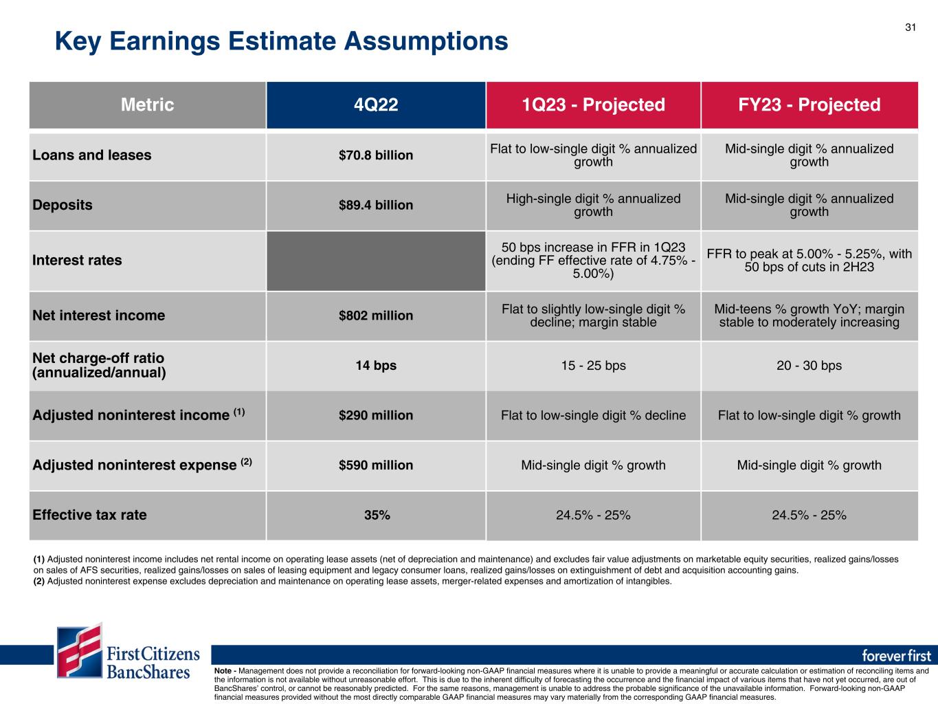 31 Metric 4Q22 1Q23 - Projected FY23 - Projected Loans and leases $70.8 billion Flat to low-single digit % annualized growth Mid-single digit % annualized growth Deposits $89.4 billion High-single digit % annualized growth Mid-single digit % annualized growth Interest rates 50 bps increase in FFR in 1Q23 (ending FF effective rate of 4.75% - 5.00%) FFR to peak at 5.00% - 5.25%, with 50 bps of cuts in 2H23 Net interest income $802 million Flat to slightly low-single digit % decline; margin stable Mid-teens % growth YoY; margin stable to moderately increasing Net charge-off ratio (annualized/annual) 14 bps 15 - 25 bps 20 - 30 bps Adjusted noninterest income (1) $290 million Flat to low-single digit % decline Flat to low-single digit % growth Adjusted noninterest expense (2) $590 million Mid-single digit % growth Mid-single digit % growth Effective tax rate 35% 24.5% - 25% 24.5% - 25% Key Earnings Estimate Assumptions (1) Adjusted noninterest income includes net rental income on operating lease assets (net of depreciation and maintenance) and excludes fair value adjustments on marketable equity securities, realized gains/losses on sales of AFS securities, realized gains/losses on sales of leasing equipment and legacy consumer loans, realized gains/losses on extinguishment of debt and acquisition accounting gains. (2) Adjusted noninterest expense excludes depreciation and maintenance on operating lease assets, merger-related expenses and amortization of intangibles. Note - Management does not provide a reconciliation for forward-looking non-GAAP financial measures where it is unable to provide a meaningful or accurate calculation or estimation of reconciling items and the information is not available without unreasonable effort. This is due to the inherent difficulty of forecasting the occurrence and the financial impact of various items that have not yet occurred, are out of BancShares’ control, or cannot be reasonably predicted. For the same reasons, management is unable to address the probable significance of the unavailable information. Forward-looking non-GAAP financial measures provided without the most directly comparable GAAP financial measures may vary materially from the corresponding GAAP financial measures.