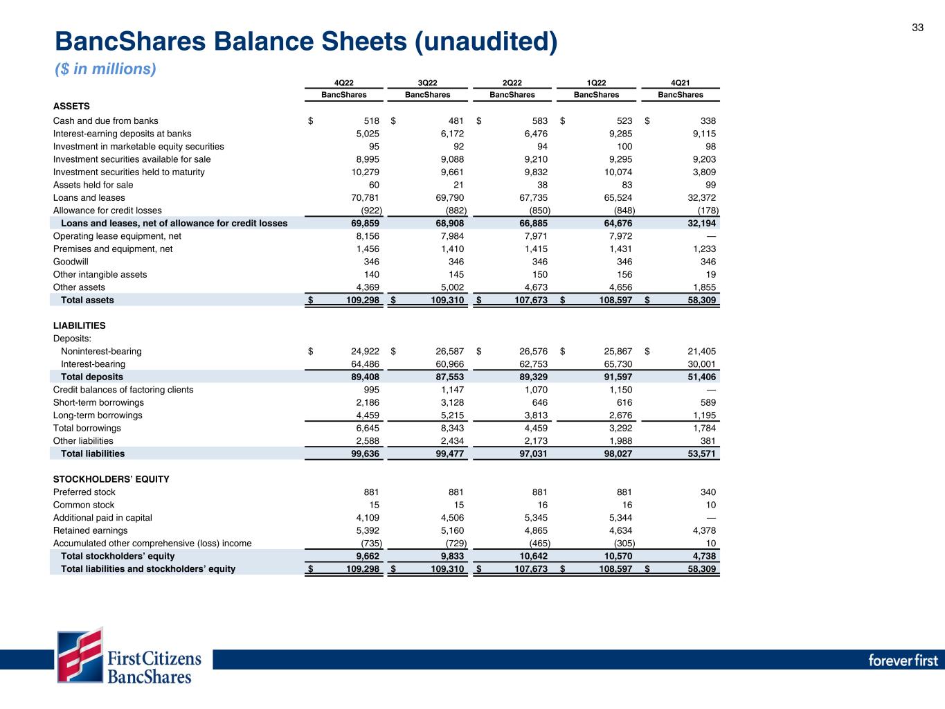 33 4Q22 3Q22 2Q22 1Q22 4Q21 BancShares BancShares BancShares BancShares BancShares ASSETS Cash and due from banks $ 518 $ 481 $ 583 $ 523 $ 338 Interest-earning deposits at banks 5,025 6,172 6,476 9,285 9,115 Investment in marketable equity securities 95 92 94 100 98 Investment securities available for sale 8,995 9,088 9,210 9,295 9,203 Investment securities held to maturity 10,279 9,661 9,832 10,074 3,809 Assets held for sale 60 21 38 83 99 Loans and leases 70,781 69,790 67,735 65,524 32,372 Allowance for credit losses (922) (882) (850) (848) (178) Loans and leases, net of allowance for credit losses 69,859 68,908 66,885 64,676 32,194 Operating lease equipment, net 8,156 7,984 7,971 7,972 — Premises and equipment, net 1,456 1,410 1,415 1,431 1,233 Goodwill 346 346 346 346 346 Other intangible assets 140 145 150 156 19 Other assets 4,369 5,002 4,673 4,656 1,855 Total assets $ 109,298 $ 109,310 $ 107,673 $ 108,597 $ 58,309 LIABILITIES Deposits: Noninterest-bearing $ 24,922 $ 26,587 $ 26,576 $ 25,867 $ 21,405 Interest-bearing 64,486 60,966 62,753 65,730 30,001 Total deposits 89,408 87,553 89,329 91,597 51,406 Credit balances of factoring clients 995 1,147 1,070 1,150 — Short-term borrowings 2,186 3,128 646 616 589 Long-term borrowings 4,459 5,215 3,813 2,676 1,195 Total borrowings 6,645 8,343 4,459 3,292 1,784 Other liabilities 2,588 2,434 2,173 1,988 381 Total liabilities 99,636 99,477 97,031 98,027 53,571 STOCKHOLDERS’ EQUITY Preferred stock 881 881 881 881 340 Common stock 15 15 16 16 10 Additional paid in capital 4,109 4,506 5,345 5,344 — Retained earnings 5,392 5,160 4,865 4,634 4,378 Accumulated other comprehensive (loss) income (735) (729) (465) (305) 10 Total stockholders’ equity 9,662 9,833 10,642 10,570 4,738 Total liabilities and stockholders’ equity $ 109,298 $ 109,310 $ 107,673 $ 108,597 $ 58,309 BancShares Balance Sheets (unaudited) ($ in millions)