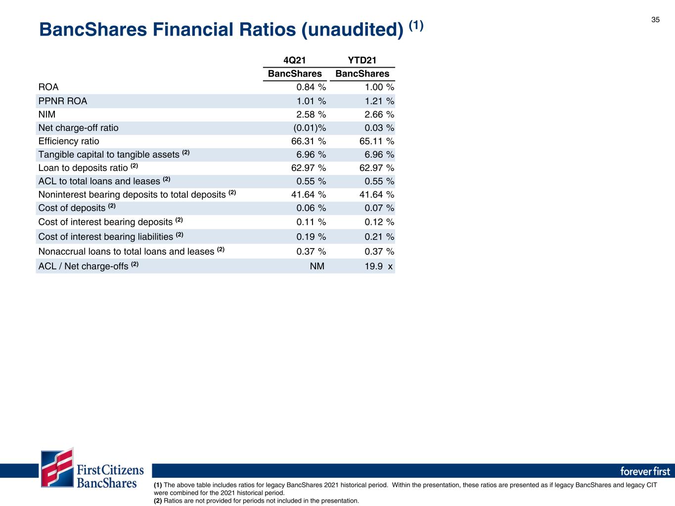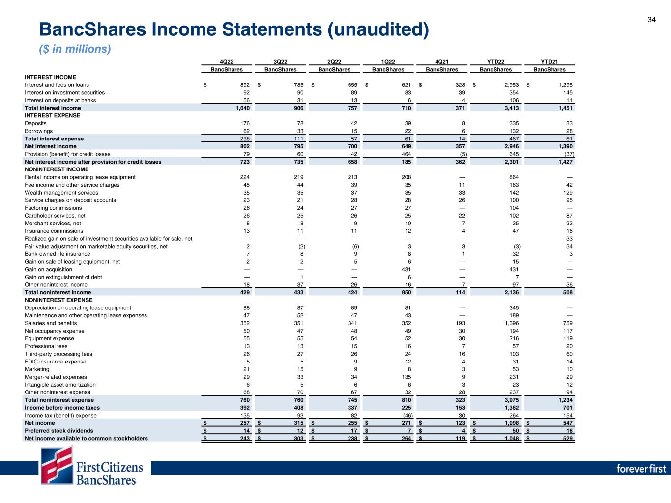34 4Q22 3Q22 2Q22 1Q22 4Q21 YTD22 YTD21 BancShares BancShares BancShares BancShares BancShares BancShares BancShares INTEREST INCOME Interest and fees on loans $ 892 $ 785 $ 655 $ 621 $ 328 $ 2,953 $ 1,295 Interest on investment securities 92 90 89 83 39 354 145 Interest on deposits at banks 56 31 13 6 4 106 11 Total interest income 1,040 906 757 710 371 3,413 1,451 INTEREST EXPENSE Deposits 176 78 42 39 8 335 33 Borrowings 62 33 15 22 6 132 28 Total interest expense 238 111 57 61 14 467 61 Net interest income 802 795 700 649 357 2,946 1,390 Provision (benefit) for credit losses 79 60 42 464 (5) 645 (37) Net interest income after provision for credit losses 723 735 658 185 362 2,301 1,427 NONINTEREST INCOME Rental income on operating lease equipment 224 219 213 208 — 864 — Fee income and other service charges 45 44 39 35 11 163 42 Wealth management services 35 35 37 35 33 142 129 Service charges on deposit accounts 23 21 28 28 26 100 95 Factoring commissions 26 24 27 27 — 104 — Cardholder services, net 26 25 26 25 22 102 87 Merchant services, net 8 8 9 10 7 35 33 Insurance commissions 13 11 11 12 4 47 16 Realized gain on sale of investment securities available for sale, net — — — — — — 33 Fair value adjustment on marketable equity securities, net 2 (2) (6) 3 3 (3) 34 Bank-owned life insurance 7 8 9 8 1 32 3 Gain on sale of leasing equipment, net 2 2 5 6 — 15 — Gain on acquisition — — — 431 — 431 — Gain on extinguishment of debt — 1 — 6 — 7 — Other noninterest income 18 37 26 16 7 97 36 Total noninterest income 429 433 424 850 114 2,136 508 NONINTEREST EXPENSE Depreciation on operating lease equipment 88 87 89 81 — 345 — Maintenance and other operating lease expenses 47 52 47 43 — 189 — Salaries and benefits 352 351 341 352 193 1,396 759 Net occupancy expense 50 47 48 49 30 194 117 Equipment expense 55 55 54 52 30 216 119 Professional fees 13 13 15 16 7 57 20 Third-party processing fees 26 27 26 24 16 103 60 FDIC insurance expense 5 5 9 12 4 31 14 Marketing 21 15 9 8 3 53 10 Merger-related expenses 29 33 34 135 9 231 29 Intangible asset amortization 6 5 6 6 3 23 12 Other noninterest expense 68 70 67 32 28 237 94 Total noninterest expense 760 760 745 810 323 3,075 1,234 Income before income taxes 392 408 337 225 153 1,362 701 Income tax (benefit) expense 135 93 82 (46) 30 264 154 Net income $ 257 $ 315 $ 255 $ 271 $ 123 $ 1,098 $ 547 Preferred stock dividends $ 14 $ 12 $ 17 $ 7 $ 4 $ 50 $ 18 Net income available to common stockholders $ 243 $ 303 $ 238 $ 264 $ 119 $ 1,048 $ 529 BancShares Income Statements (unaudited) ($ in millions)