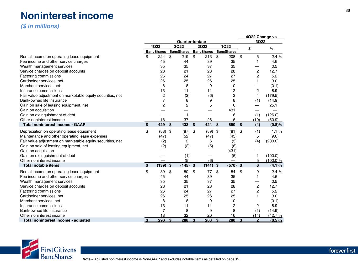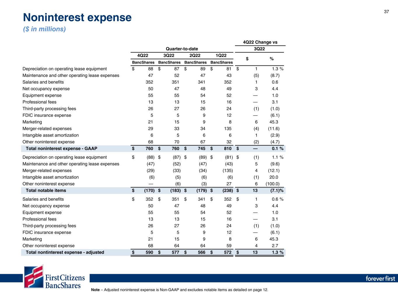 36 4Q22 Change vs Quarter-to-date 3Q22 4Q22 3Q22 2Q22 1Q22 $ % BancShares BancShares BancShares BancShares Rental income on operating lease equipment $ 224 $ 219 $ 213 $ 208 $ 5 2.4 % Fee income and other service charges 45 44 39 35 1 4.6 Wealth management services 35 35 37 35 — 0.5 Service charges on deposit accounts 23 21 28 28 2 12.7 Factoring commissions 26 24 27 27 2 5.2 Cardholder services, net 26 25 26 25 1 3.0 Merchant services, net 8 8 9 10 — (0.1) Insurance commissions 13 11 11 12 2 8.9 Fair value adjustment on marketable equity securities, net 2 (2) (6) 3 4 (179.5) Bank-owned life insurance 7 8 9 8 (1) (14.9) Gain on sale of leasing equipment, net 2 2 5 6 — 25.1 Gain on acquisition — — — 431 — — Gain on extinguishment of debt — 1 — 6 (1) (126.0) Other noninterest income 18 37 26 16 (19) (50.9) Total noninterest income - GAAP $ 429 $ 433 $ 424 $ 850 $ (4) (0.8) % Depreciation on operating lease equipment $ (88) $ (87) $ (89) $ (81) $ (1) 1.1 % Maintenance and other operating lease expenses (47) (52) (47) (43) 5 (9.6) Fair value adjustment on marketable equity securities, net (2) 2 6 (3) (4) (200.0) Gain on sale of leasing equipment, net (2) (2) (5) (6) — — Gain on acquisition — — — (431) — — Gain on extinguishment of debt — (1) — (6) 1 (100.0) Other noninterest income — (5) (6) — 5 (100.0) % Total notable items $ (139) $ (145) $ (141) $ (570) $ 6 (4.1) % Rental income on operating lease equipment $ 89 $ 80 $ 77 $ 84 $ 9 2.4 % Fee income and other service charges 45 44 39 35 1 4.6 Wealth management services 35 35 37 35 — 0.5 Service charges on deposit accounts 23 21 28 28 2 12.7 Factoring commissions 26 24 27 27 2 5.2 Cardholder services, net 26 25 26 25 1 3.0 Merchant services, net 8 8 9 10 — (0.1) Insurance commissions 13 11 11 12 2 8.9 Bank-owned life insurance 7 8 9 8 (1) (14.9) Other noninterest income 18 32 20 16 (14) (42.7) % Total noninterest income - adjusted $ 290 $ 288 $ 283 $ 280 $ 2 (0.5) % Note – Adjusted noninterest income is Non-GAAP and excludes notable items as detailed on page 12. Noninterest income ($ in millions)