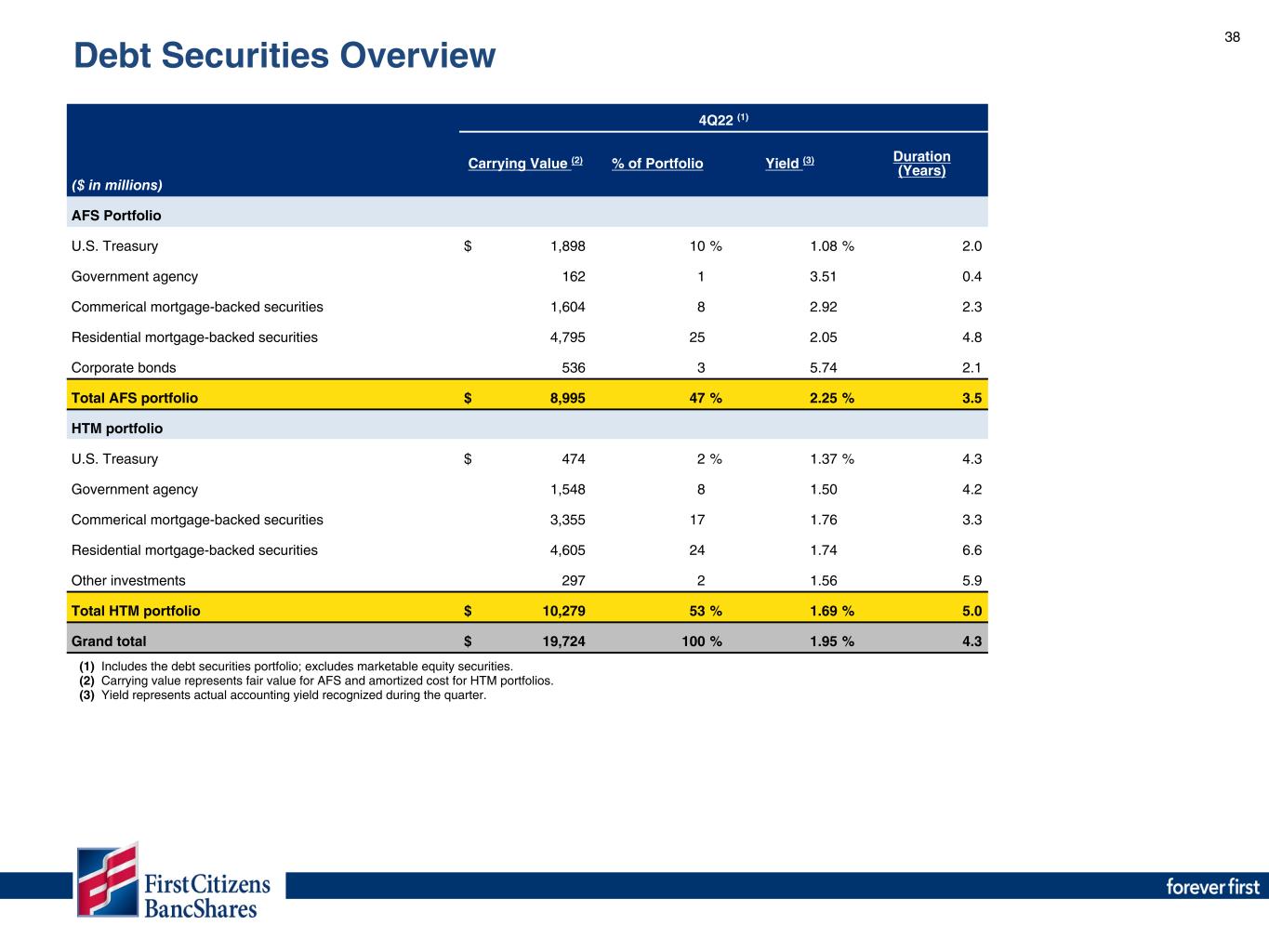 38 (1) (1) Includes the debt securities portfolio; excludes marketable equity securities. (2) Carrying value represents fair value for AFS and amortized cost for HTM portfolios. (3) Yield represents actual accounting yield recognized during the quarter. 4Q22 (1) ($ in millions) Carrying Value (2) % of Portfolio Yield (3) Duration (Years) AFS Portfolio U.S. Treasury $ 1,898 10 % 1.08 % 2.0 Government agency 162 1 3.51 0.4 Commerical mortgage-backed securities 1,604 8 2.92 2.3 Residential mortgage-backed securities 4,795 25 2.05 4.8 Corporate bonds 536 3 5.74 2.1 Total AFS portfolio $ 8,995 47 % 2.25 % 3.5 HTM portfolio U.S. Treasury $ 474 2 % 1.37 % 4.3 Government agency 1,548 8 1.50 4.2 Commerical mortgage-backed securities 3,355 17 1.76 3.3 Residential mortgage-backed securities 4,605 24 1.74 6.6 Other investments 297 2 1.56 5.9 Total HTM portfolio $ 10,279 53 % 1.69 % 5.0 Grand total $ 19,724 100 % 1.95 % 4.3 Debt Securities Overview