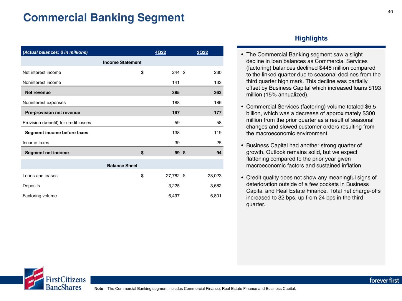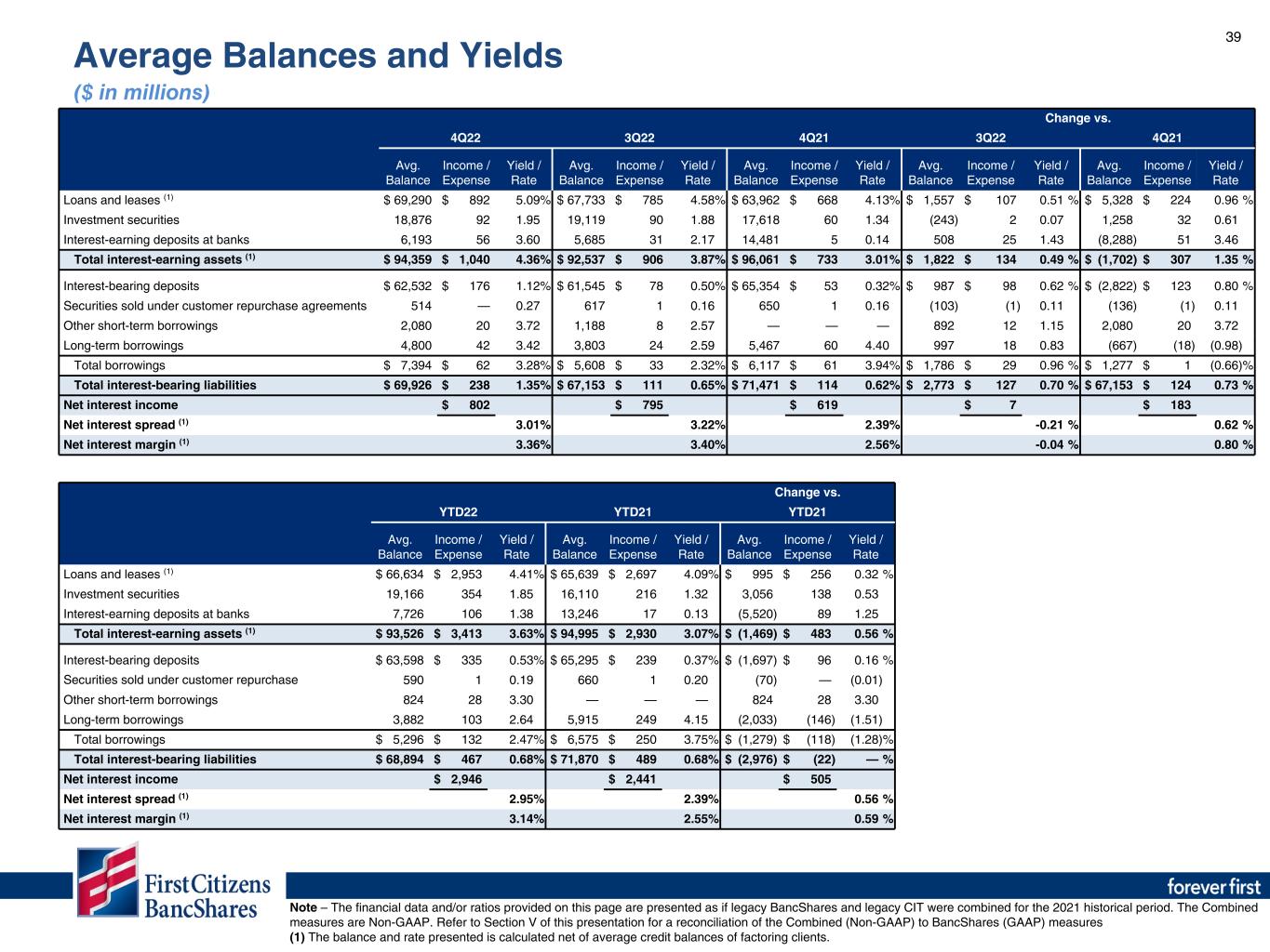 39 Change vs. 4Q22 3Q22 4Q21 3Q22 4Q21 Avg. Balance Income / Expense Yield / Rate Avg. Balance Income / Expense Yield / Rate Avg. Balance Income / Expense Yield / Rate Avg. Balance Income / Expense Yield / Rate Avg. Balance Income / Expense Yield / Rate Loans and leases (1) $ 69,290 $ 892 5.09 % $ 67,733 $ 785 4.58 % $ 63,962 $ 668 4.13 % $ 1,557 $ 107 0.51 % $ 5,328 $ 224 0.96 % Investment securities 18,876 92 1.95 19,119 90 1.88 17,618 60 1.34 (243) 2 0.07 1,258 32 0.61 Interest-earning deposits at banks 6,193 56 3.60 5,685 31 2.17 14,481 5 0.14 508 25 1.43 (8,288) 51 3.46 Total interest-earning assets (1) $ 94,359 $ 1,040 4.36 % $ 92,537 $ 906 3.87 % $ 96,061 $ 733 3.01 % $ 1,822 $ 134 0.49 % $ (1,702) $ 307 1.35 % Interest-bearing deposits $ 62,532 $ 176 1.12 % $ 61,545 $ 78 0.50 % $ 65,354 $ 53 0.32 % $ 987 $ 98 0.62 % $ (2,822) $ 123 0.80 % Securities sold under customer repurchase agreements 514 — 0.27 617 1 0.16 650 1 0.16 (103) (1) 0.11 (136) (1) 0.11 Other short-term borrowings 2,080 20 3.72 1,188 8 2.57 — — — 892 12 1.15 2,080 20 3.72 Long-term borrowings 4,800 42 3.42 3,803 24 2.59 5,467 60 4.40 997 18 0.83 (667) (18) (0.98) Total borrowings $ 7,394 $ 62 3.28 % $ 5,608 $ 33 2.32 % $ 6,117 $ 61 3.94 % $ 1,786 $ 29 0.96 % $ 1,277 $ 1 (0.66) % Total interest-bearing liabilities $ 69,926 $ 238 1.35 % $ 67,153 $ 111 0.65 % $ 71,471 $ 114 0.62 % $ 2,773 $ 127 0.70 % $ 67,153 $ 124 0.73 % Net interest income $ 802 $ 795 $ 619 $ 7 $ 183 Net interest spread (1) 3.01 % 3.22 % 2.39 % -0.21 % 0.62 % Net interest margin (1) 3.36 % 3.40 % 2.56 % -0.04 % 0.80 % Note – The financial data and/or ratios provided on this page are presented as if legacy BancShares and legacy CIT were combined for the 2021 historical period. The Combined measures are Non-GAAP. Refer to Section V of this presentation for a reconciliation of the Combined (Non-GAAP) to BancShares (GAAP) measures (1) The balance and rate presented is calculated net of average credit balances of factoring clients. Change vs. YTD22 YTD21 YTD21 Avg. Balance Income / Expense Yield / Rate Avg. Balance Income / Expense Yield / Rate Avg. Balance Income / Expense Yield / Rate Loans and leases (1) $ 66,634 $ 2,953 4.41 % $ 65,639 $ 2,697 4.09 % $ 995 $ 256 0.32 % Investment securities 19,166 354 1.85 16,110 216 1.32 3,056 138 0.53 Interest-earning deposits at banks 7,726 106 1.38 13,246 17 0.13 (5,520) 89 1.25 Total interest-earning assets (1) $ 93,526 $ 3,413 3.63 % $ 94,995 $ 2,930 3.07 % $ (1,469) $ 483 0.56 % Interest-bearing deposits $ 63,598 $ 335 0.53 % $ 65,295 $ 239 0.37 % $ (1,697) $ 96 0.16 % Securities sold under customer repurchase agreements 590 1 0.19 660 1 0.20 (70) — (0.01) Other short-term borrowings 824 28 3.30 — — — 824 28 3.30 Long-term borrowings 3,882 103 2.64 5,915 249 4.15 (2,033) (146) (1.51) Total borrowings $ 5,296 $ 132 2.47 % $ 6,575 $ 250 3.75 % $ (1,279) $ (118) (1.28) % Total interest-bearing liabilities $ 68,894 $ 467 0.68 % $ 71,870 $ 489 0.68 % $ (2,976) $ (22) — % Net interest income $ 2,946 $ 2,441 $ 505 Net interest spread (1) 2.95 % 2.39 % 0.56 % Net interest margin (1) 3.14 % 2.55 % 0.59 % Average Balances and Yields ($ in millions)