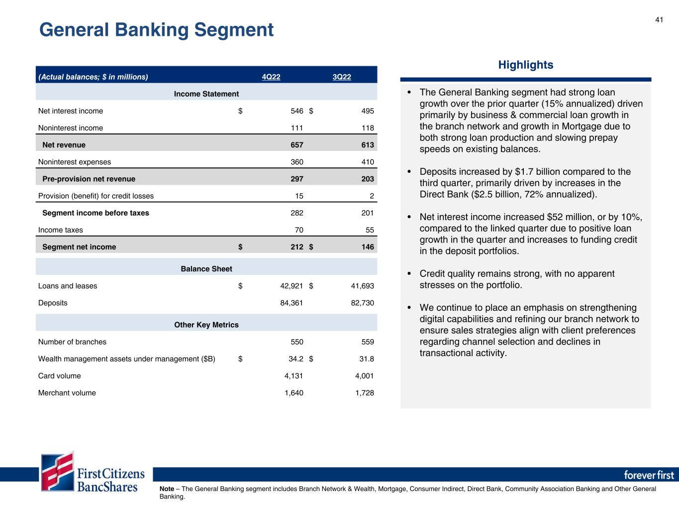 41 Highlights • The General Banking segment had strong loan growth over the prior quarter (15% annualized) driven primarily by business & commercial loan growth in the branch network and growth in Mortgage due to both strong loan production and slowing prepay speeds on existing balances. • Deposits increased by $1.7 billion compared to the third quarter, primarily driven by increases in the Direct Bank ($2.5 billion, 72% annualized). • Net interest income increased $52 million, or by 10%, compared to the linked quarter due to positive loan growth in the quarter and increases to funding credit in the deposit portfolios. • Credit quality remains strong, with no apparent stresses on the portfolio. • We continue to place an emphasis on strengthening digital capabilities and refining our branch network to ensure sales strategies align with client preferences regarding channel selection and declines in transactional activity. Note – The General Banking segment includes Branch Network & Wealth, Mortgage, Consumer Indirect, Direct Bank, Community Association Banking and Other General Banking. (Actual balances; $ in millions) 4Q22 3Q22 Income Statement Net interest income $ 546 $ 495 Noninterest income 111 118 Net revenue 657 613 Noninterest expenses 360 410 Pre-provision net revenue 297 203 Provision (benefit) for credit losses 15 2 Segment income before taxes 282 201 Income taxes 70 55 Segment net income $ 212 $ 146 Balance Sheet Loans and leases $ 42,921 $ 41,693 Deposits 84,361 82,730 Other Key Metrics Number of branches 550 559 Wealth management assets under management ($B) $ 34.2 $ 31.8 Card volume 4,131 4,001 Merchant volume 1,640 1,728 General Banking Segment