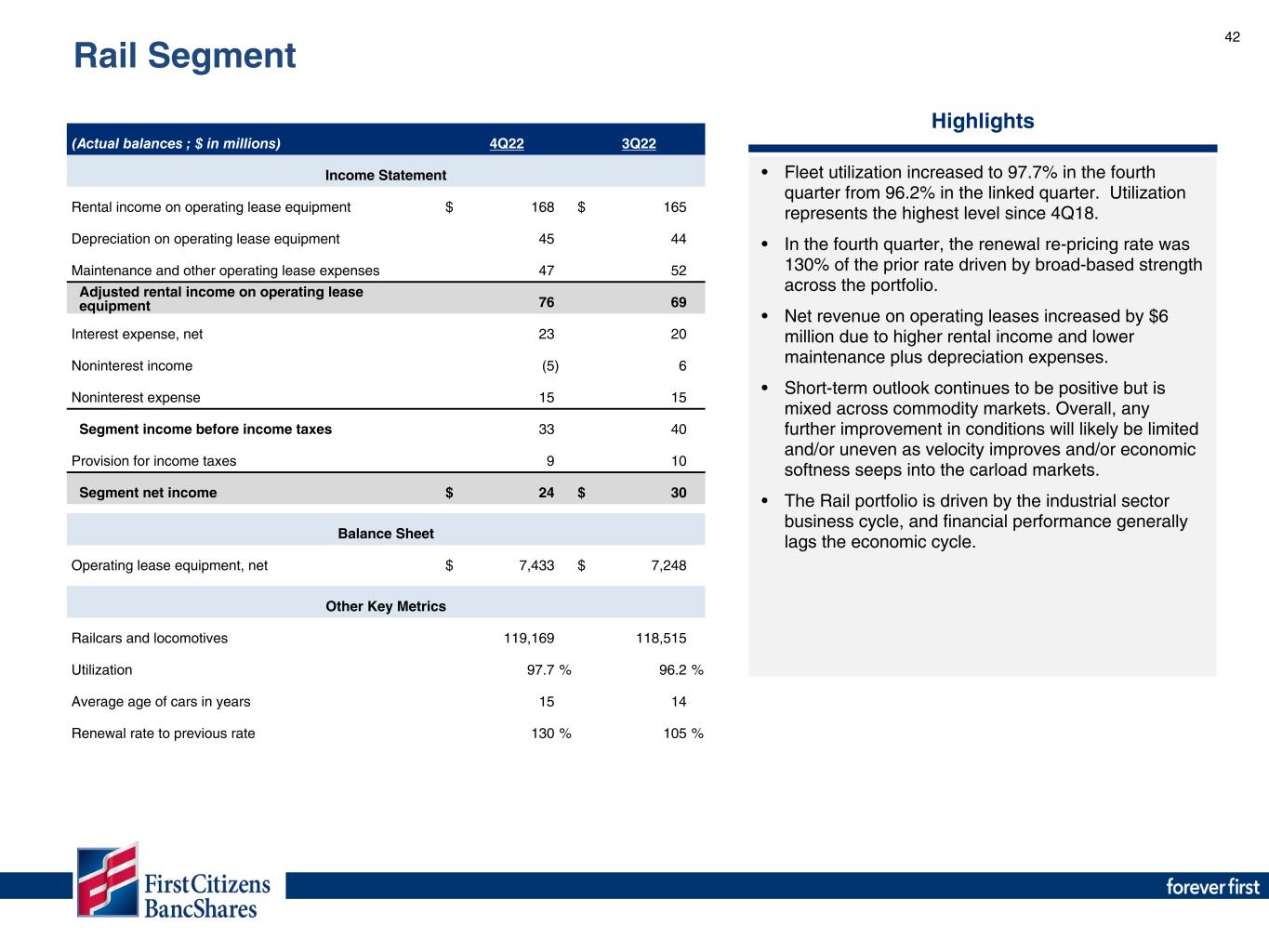 42 Highlights • Fleet utilization increased to 97.7% in the fourth quarter from 96.2% in the linked quarter. Utilization represents the highest level since 4Q18. • In the fourth quarter, the renewal re-pricing rate was 130% of the prior rate driven by broad-based strength across the portfolio. • Net revenue on operating leases increased by $6 million due to higher rental income and lower maintenance plus depreciation expenses. • Short-term outlook continues to be positive but is mixed across commodity markets. Overall, any further improvement in conditions will likely be limited and/or uneven as velocity improves and/or economic softness seeps into the carload markets. • The Rail portfolio is driven by the industrial sector business cycle, and financial performance generally lags the economic cycle. (Actual balances ; $ in millions) 4Q22 3Q22 Income Statement Rental income on operating lease equipment $ 168 $ 165 Depreciation on operating lease equipment 45 44 Maintenance and other operating lease expenses 47 52 Adjusted rental income on operating lease equipment 76 69 Interest expense, net 23 20 Noninterest income (5) 6 Noninterest expense 15 15 Segment income before income taxes 33 40 Provision for income taxes 9 10 Segment net income $ 24 $ 30 Balance Sheet Operating lease equipment, net $ 7,433 $ 7,248 Other Key Metrics Railcars and locomotives 119,169 118,515 Utilization 97.7 % 96.2 % Average age of cars in years 15 14 Renewal rate to previous rate 130 % 105 % Rail Segment