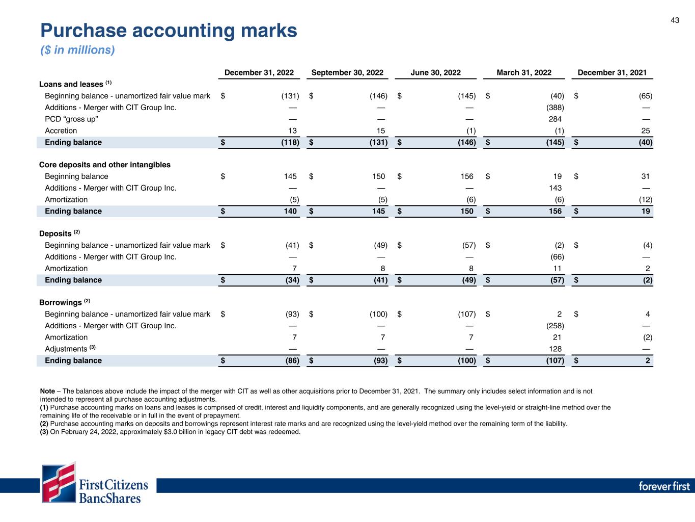 43 December 31, 2022 September 30, 2022 June 30, 2022 March 31, 2022 December 31, 2021 Loans and leases (1) Beginning balance - unamortized fair value mark $ (131) $ (146) $ (145) $ (40) $ (65) Additions - Merger with CIT Group Inc. — — — (388) — PCD “gross up” — — — 284 — Accretion 13 15 (1) (1) 25 Ending balance $ (118) $ (131) $ (146) $ (145) $ (40) Core deposits and other intangibles Beginning balance $ 145 $ 150 $ 156 $ 19 $ 31 Additions - Merger with CIT Group Inc. — — — 143 — Amortization (5) (5) (6) (6) (12) Ending balance $ 140 $ 145 $ 150 $ 156 $ 19 Deposits (2) Beginning balance - unamortized fair value mark $ (41) $ (49) $ (57) $ (2) $ (4) Additions - Merger with CIT Group Inc. — — — (66) — Amortization 7 8 8 11 2 Ending balance $ (34) $ (41) $ (49) $ (57) $ (2) Borrowings (2) Beginning balance - unamortized fair value mark $ (93) $ (100) $ (107) $ 2 $ 4 Additions - Merger with CIT Group Inc. — — — (258) — Amortization 7 7 7 21 (2) Adjustments (3) — — — 128 — Ending balance $ (86) $ (93) $ (100) $ (107) $ 2 Note – The balances above include the impact of the merger with CIT as well as other acquisitions prior to December 31, 2021. The summary only includes select information and is not intended to represent all purchase accounting adjustments. (1) Purchase accounting marks on loans and leases is comprised of credit, interest and liquidity components, and are generally recognized using the level-yield or straight-line method over the remaining life of the receivable or in full in the event of prepayment. (2) Purchase accounting marks on deposits and borrowings represent interest rate marks and are recognized using the level-yield method over the remaining term of the liability. (3) On February 24, 2022, approximately $3.0 billion in legacy CIT debt was redeemed. Purchase accounting marks ($ in millions)