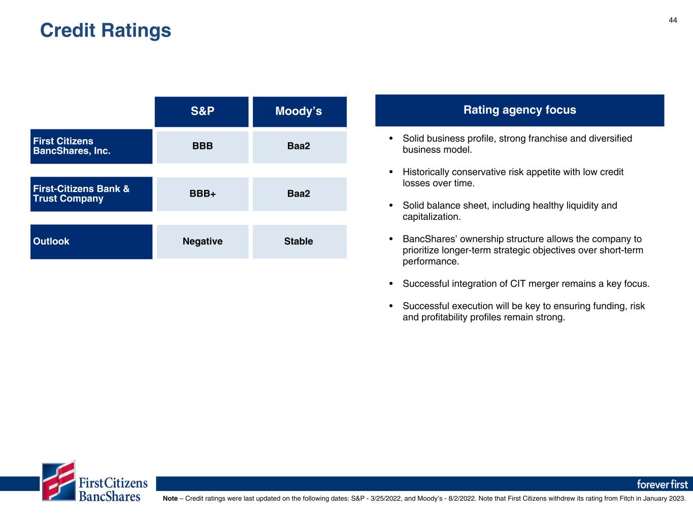 44 Rating agency focusS&P Moody’s First Citizens BancShares, Inc. BBB Baa2 First-Citizens Bank & Trust Company BBB+ Baa2 Outlook Negative Stable • Solid business profile, strong franchise and diversified business model. • Historically conservative risk appetite with low credit losses over time. • Solid balance sheet, including healthy liquidity and capitalization. • BancShares’ ownership structure allows the company to prioritize longer-term strategic objectives over short-term performance. • Successful integration of CIT merger remains a key focus. • Successful execution will be key to ensuring funding, risk and profitability profiles remain strong. Note – Credit ratings were last updated on the following dates: S&P - 3/25/2022, and Moody’s - 8/2/2022. Note that First Citizens withdrew its rating from Fitch in January 2023. Credit Ratings