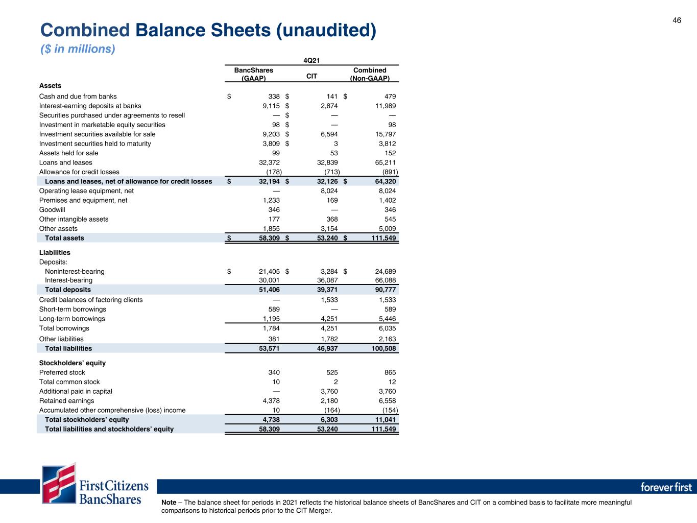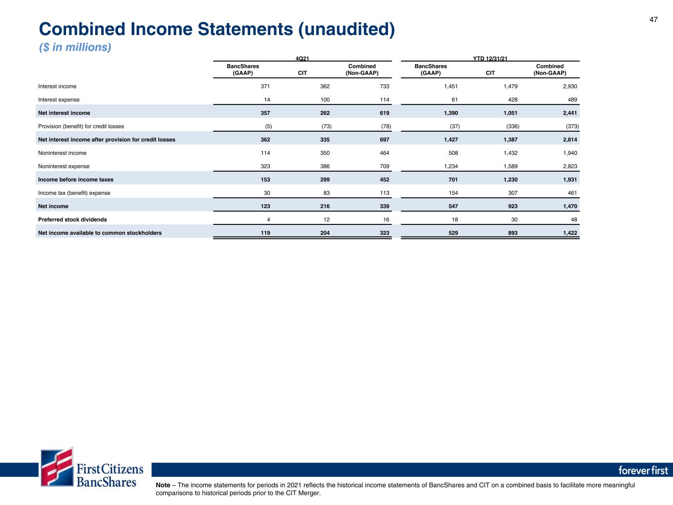 46 Note – The balance sheet for periods in 2021 reflects the historical balance sheets of BancShares and CIT on a combined basis to facilitate more meaningful comparisons to historical periods prior to the CIT Merger. Combined Balance Sheets (unaudited) ($ in millions) 4Q21 BancShares (GAAP) CIT Combined (Non-GAAP) Assets Cash and due from banks $ 338 $ 141 $ 479 Interest-earning deposits at banks 9,115 $ 2,874 11,989 Securities purchased under agreements to resell — $ — — Investment in marketable equity securities 98 $ — 98 Investment securities available for sale 9,203 $ 6,594 15,797 Investment securities held to maturity 3,809 $ 3 3,812 Assets held for sale 99 53 152 Loans and leases 32,372 32,839 65,211 Allowance for credit losses (178) (713) (891) Loans and leases, net of allowance for credit losses $ 32,194 $ 32,126 $ 64,320 Operating lease equipment, net — 8,024 8,024 Premises and equipment, net 1,233 169 1,402 Goodwill 346 — 346 Other intangible assets 177 368 545 Other assets 1,855 3,154 5,009 Total assets $ 58,309 $ 53,240 $ 111,549 Liabilities Deposits: Noninterest-bearing $ 21,405 $ 3,284 $ 24,689 Interest-bearing 30,001 36,087 66,088 Total deposits 51,406 39,371 90,777 Credit balances of factoring clients — 1,533 1,533 Short-term borrowings 589 — 589 Long-term borrowings 1,195 4,251 5,446 Total borrowings 1,784 4,251 6,035 Other liabilities 381 1,782 2,163 Total liabilities 53,571 46,937 100,508 Stockholders’ equity Preferred stock 340 525 865 Total common stock 10 2 12 Additional paid in capital — 3,760 3,760 Retained earnings 4,378 2,180 6,558 Accumulated other comprehensive (loss) income 10 (164) (154) Total stockholders’ equity 4,738 6,303 11,041 Total liabilities and stockholders’ equity 58,309 53,240 111,549