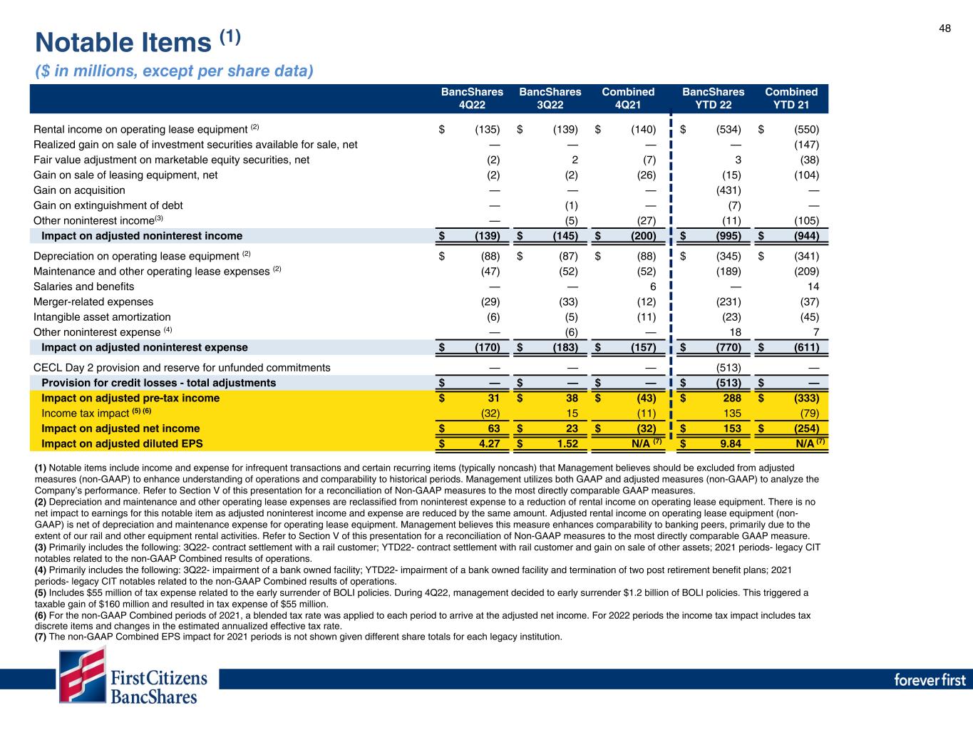48 BancShares 4Q22 BancShares 3Q22 Combined 4Q21 BancShares YTD 22 Combined YTD 21 Rental income on operating lease equipment (2) $ (135) $ (139) $ (140) $ (534) $ (550) Realized gain on sale of investment securities available for sale, net — — — — (147) Fair value adjustment on marketable equity securities, net (2) 2 (7) 3 (38) Gain on sale of leasing equipment, net (2) (2) (26) (15) (104) Gain on acquisition — — — (431) — Gain on extinguishment of debt — (1) — (7) — Other noninterest income(3) — (5) (27) (11) (105) Impact on adjusted noninterest income $ (139) $ (145) $ (200) $ (995) $ (944) Depreciation on operating lease equipment (2) $ (88) $ (87) $ (88) $ (345) $ (341) Maintenance and other operating lease expenses (2) (47) (52) (52) (189) (209) Salaries and benefits — — 6 — 14 Merger-related expenses (29) (33) (12) (231) (37) Intangible asset amortization (6) (5) (11) (23) (45) Other noninterest expense (4) — (6) — 18 7 Impact on adjusted noninterest expense $ (170) $ (183) $ (157) $ (770) $ (611) CECL Day 2 provision and reserve for unfunded commitments — — — (513) — Provision for credit losses - total adjustments $ — $ — $ — $ (513) $ — Impact on adjusted pre-tax income $ 31 $ 38 $ (43) $ 288 $ (333) Income tax impact (5) (6) (32) 15 (11) 135 (79) Impact on adjusted net income $ 63 $ 23 $ (32) $ 153 $ (254) Impact on adjusted diluted EPS $ 4.27 $ 1.52 N/A (7) $ 9.84 N/A (7) Notable Items (1) ($ in millions, except per share data) (1) Notable items include income and expense for infrequent transactions and certain recurring items (typically noncash) that Management believes should be excluded from adjusted measures (non-GAAP) to enhance understanding of operations and comparability to historical periods. Management utilizes both GAAP and adjusted measures (non-GAAP) to analyze the Company’s performance. Refer to Section V of this presentation for a reconciliation of Non-GAAP measures to the most directly comparable GAAP measures. (2) Depreciation and maintenance and other operating lease expenses are reclassified from noninterest expense to a reduction of rental income on operating lease equipment. There is no net impact to earnings for this notable item as adjusted noninterest income and expense are reduced by the same amount. Adjusted rental income on operating lease equipment (non- GAAP) is net of depreciation and maintenance expense for operating lease equipment. Management believes this measure enhances comparability to banking peers, primarily due to the extent of our rail and other equipment rental activities. Refer to Section V of this presentation for a reconciliation of Non-GAAP measures to the most directly comparable GAAP measure. (3) Primarily includes the following: 3Q22- contract settlement with a rail customer; YTD22- contract settlement with rail customer and gain on sale of other assets; 2021 periods- legacy CIT notables related to the non-GAAP Combined results of operations. (4) Primarily includes the following: 3Q22- impairment of a bank owned facility; YTD22- impairment of a bank owned facility and termination of two post retirement benefit plans; 2021 periods- legacy CIT notables related to the non-GAAP Combined results of operations. (5) Includes $55 million of tax expense related to the early surrender of BOLI policies. During 4Q22, management decided to early surrender $1.2 billion of BOLI policies. This triggered a taxable gain of $160 million and resulted in tax expense of $55 million. (6) For the non-GAAP Combined periods of 2021, a blended tax rate was applied to each period to arrive at the adjusted net income. For 2022 periods the income tax impact includes tax discrete items and changes in the estimated annualized effective tax rate. (7) The non-GAAP Combined EPS impact for 2021 periods is not shown given different share totals for each legacy institution.