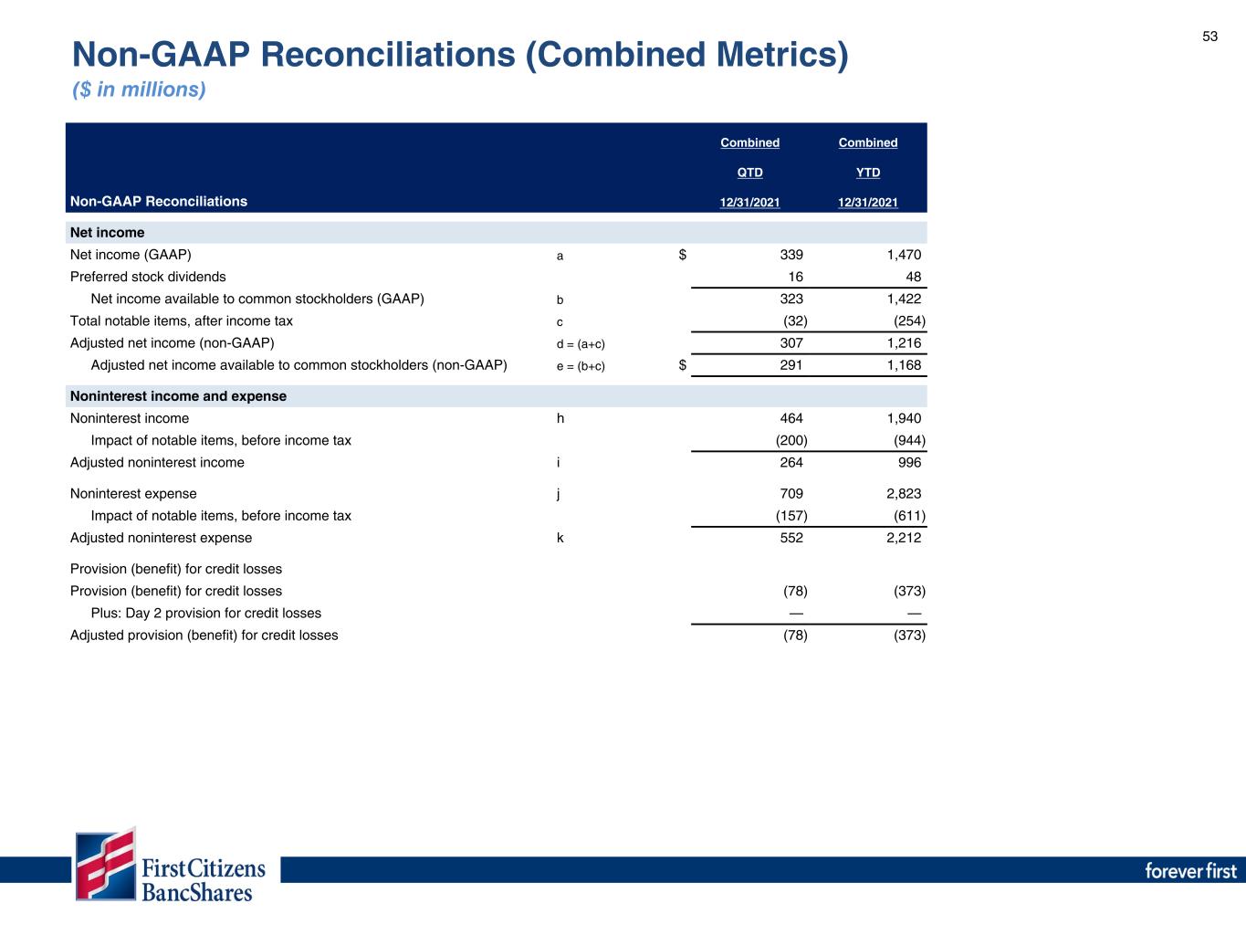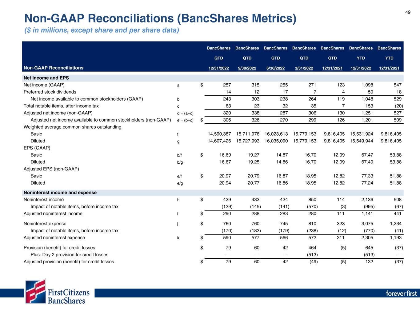 49 BancShares BancShares BancShares BancShares BancShares BancShares BancShares QTD QTD QTD QTD QTD YTD YTD Non-GAAP Reconciliations 12/31/2022 9/30/2022 6/30/2022 3/31/2022 12/31/2021 12/31/2022 12/31/2021 Net income and EPS Net income (GAAP) a $ 257 315 255 271 123 1,098 547 Preferred stock dividends 14 12 17 7 4 50 18 Net income available to common stockholders (GAAP) b 243 303 238 264 119 1,048 529 Total notable items, after income tax c 63 23 32 35 7 153 (20) Adjusted net income (non-GAAP) d = (a+c) 320 338 287 306 130 1,251 527 Adjusted net income available to common stockholders (non-GAAP) e = (b+c) $ 306 326 270 299 126 1,201 509 Weighted average common shares outstanding Basic f 14,590,387 15,711,976 16,023,613 15,779,153 9,816,405 15,531,924 9,816,405 Diluted g 14,607,426 15,727,993 16,035,090 15,779,153 9,816,405 15,549,944 9,816,405 EPS (GAAP) Basic b/f $ 16.69 19.27 14.87 16.70 12.09 67.47 53.88 Diluted b/g 16.67 19.25 14.86 16.70 12.09 67.40 53.88 Adjusted EPS (non-GAAP) Basic e/f $ 20.97 20.79 16.87 18.95 12.82 77.33 51.88 Diluted e/g 20.94 20.77 16.86 18.95 12.82 77.24 51.88 Noninterest income and expense Noninterest income h $ 429 433 424 850 114 2,136 508 Impact of notable items, before income tax (139) (145) (141) (570) (3) (995) (67) Adjusted noninterest income i $ 290 288 283 280 111 1,141 441 Noninterest expense j $ 760 760 745 810 323 3,075 1,234 Impact of notable items, before income tax (170) (183) (179) (238) (12) (770) (41) Adjusted noninterest expense k $ 590 577 566 572 311 2,305 1,193 Provision (benefit) for credit losses $ 79 60 42 464 (5) 645 (37) Plus: Day 2 provision for credit losses — — — (513) — (513) — Adjusted provision (benefit) for credit losses $ 79 60 42 (49) (5) 132 (37) Non-GAAP Reconciliations (BancShares Metrics) ($ in millions, except share and per share data)