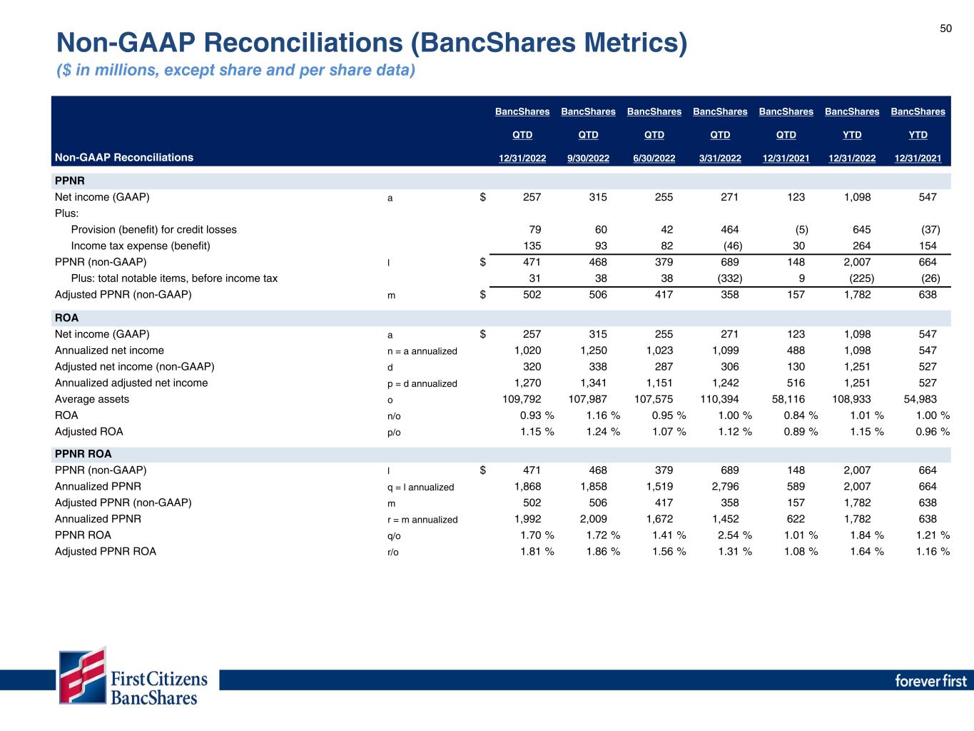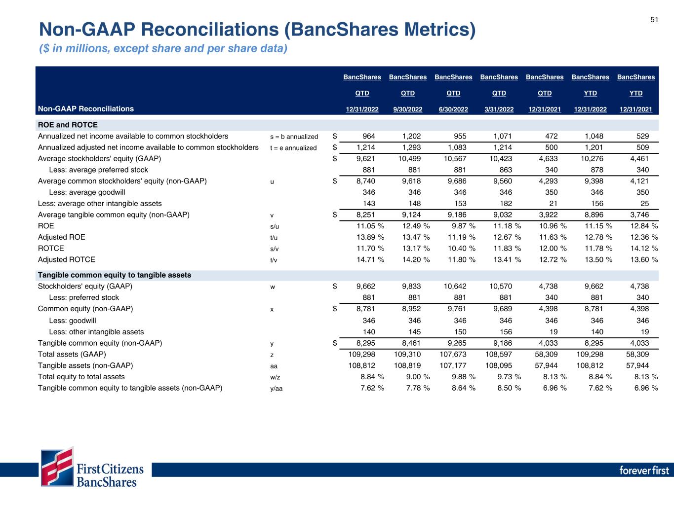 50 Non-GAAP Reconciliations (BancShares Metrics) ($ in millions, except share and per share data) BancShares BancShares BancShares BancShares BancShares BancShares BancShares QTD QTD QTD QTD QTD YTD YTD Non-GAAP Reconciliations 12/31/2022 9/30/2022 6/30/2022 3/31/2022 12/31/2021 12/31/2022 12/31/2021 PPNR Net income (GAAP) a $ 257 315 255 271 123 1,098 547 Plus: Provision (benefit) for credit losses 79 60 42 464 (5) 645 (37) Income tax expense (benefit) 135 93 82 (46) 30 264 154 PPNR (non-GAAP) l $ 471 468 379 689 148 2,007 664 Plus: total notable items, before income tax 31 38 38 (332) 9 (225) (26) Adjusted PPNR (non-GAAP) m $ 502 506 417 358 157 1,782 638 ROA Net income (GAAP) a $ 257 315 255 271 123 1,098 547 Annualized net income n = a annualized 1,020 1,250 1,023 1,099 488 1,098 547 Adjusted net income (non-GAAP) d 320 338 287 306 130 1,251 527 Annualized adjusted net income p = d annualized 1,270 1,341 1,151 1,242 516 1,251 527 Average assets o 109,792 107,987 107,575 110,394 58,116 108,933 54,983 ROA n/o 0.93 % 1.16 % 0.95 % 1.00 % 0.84 % 1.01 % 1.00 % Adjusted ROA p/o 1.15 % 1.24 % 1.07 % 1.12 % 0.89 % 1.15 % 0.96 % PPNR ROA PPNR (non-GAAP) l $ 471 468 379 689 148 2,007 664 Annualized PPNR q = l annualized 1,868 1,858 1,519 2,796 589 2,007 664 Adjusted PPNR (non-GAAP) m 502 506 417 358 157 1,782 638 Annualized PPNR r = m annualized 1,992 2,009 1,672 1,452 622 1,782 638 PPNR ROA q/o 1.70 % 1.72 % 1.41 % 2.54 % 1.01 % 1.84 % 1.21 % Adjusted PPNR ROA r/o 1.81 % 1.86 % 1.56 % 1.31 % 1.08 % 1.64 % 1.16 %