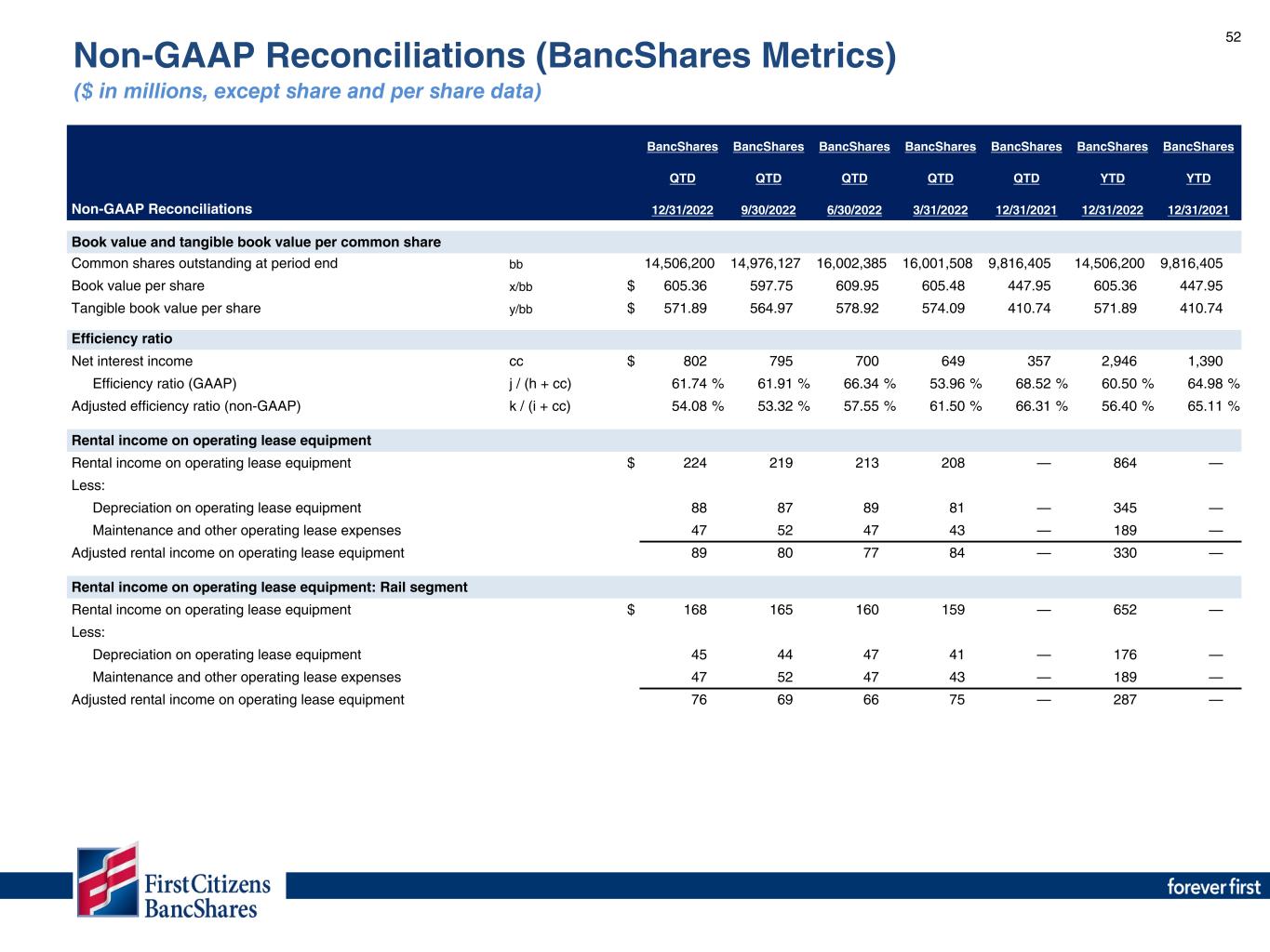52 Non-GAAP Reconciliations (BancShares Metrics) ($ in millions, except share and per share data) BancShares BancShares BancShares BancShares BancShares BancShares BancShares QTD QTD QTD QTD QTD YTD YTD Non-GAAP Reconciliations 12/31/2022 9/30/2022 6/30/2022 3/31/2022 12/31/2021 12/31/2022 12/31/2021 Book value and tangible book value per common share Common shares outstanding at period end bb 14,506,200 14,976,127 16,002,385 16,001,508 9,816,405 14,506,200 9,816,405 Book value per share x/bb $ 605.36 597.75 609.95 605.48 447.95 605.36 447.95 Tangible book value per share y/bb $ 571.89 564.97 578.92 574.09 410.74 571.89 410.74 Efficiency ratio Net interest income cc $ 802 795 700 649 357 2,946 1,390 Efficiency ratio (GAAP) j / (h + cc) 61.74 % 61.91 % 66.34 % 53.96 % 68.52 % 60.50 % 64.98 % Adjusted efficiency ratio (non-GAAP) k / (i + cc) 54.08 % 53.32 % 57.55 % 61.50 % 66.31 % 56.40 % 65.11 % Rental income on operating lease equipment Rental income on operating lease equipment $ 224 219 213 208 — 864 — Less: Depreciation on operating lease equipment 88 87 89 81 — 345 — Maintenance and other operating lease expenses 47 52 47 43 — 189 — Adjusted rental income on operating lease equipment 89 80 77 84 — 330 — Rental income on operating lease equipment: Rail segment Rental income on operating lease equipment $ 168 165 160 159 — 652 — Less: Depreciation on operating lease equipment 45 44 47 41 — 176 — Maintenance and other operating lease expenses 47 52 47 43 — 189 — Adjusted rental income on operating lease equipment 76 69 66 75 — 287 —